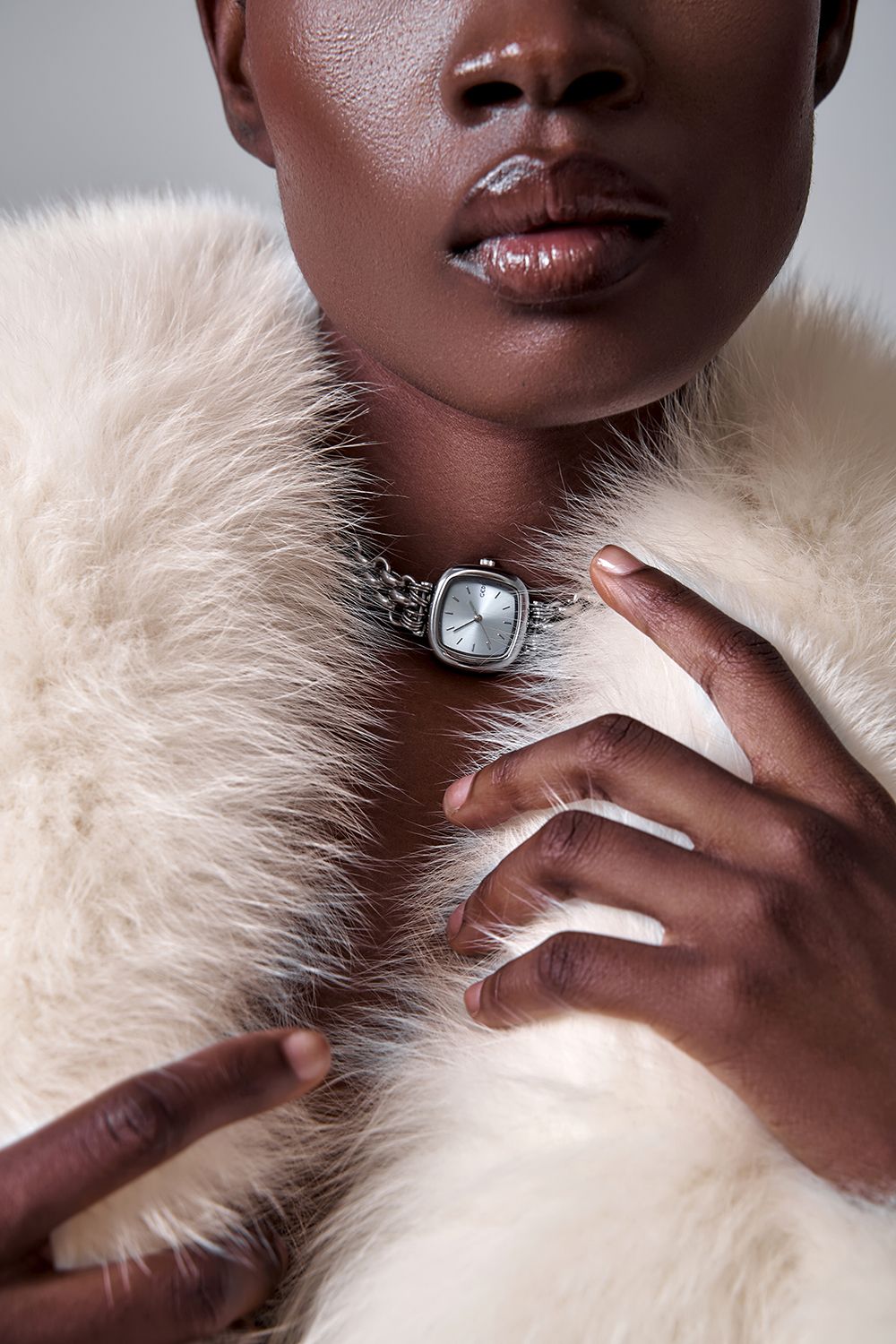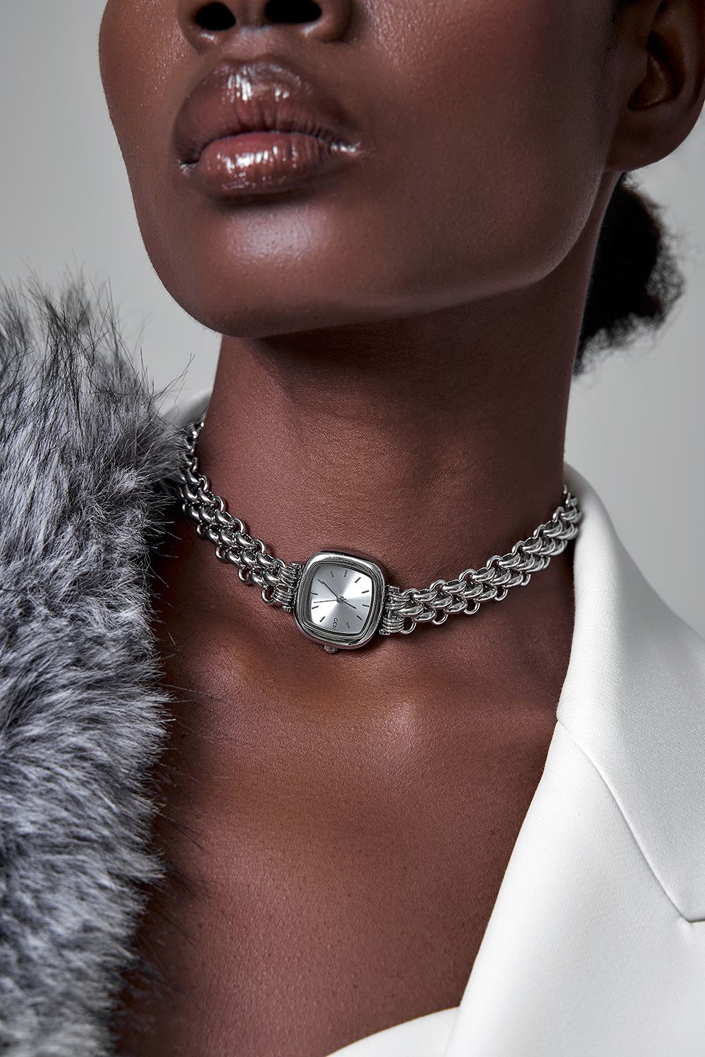 Эффектный чокер, выполненный из массивной цепочки серебристого цвета, украшен оригинальной деталью - миниатюрным циферблатом в винтажном стиле. Такой аксессуар объединяет в себе украшение и элемент часовой классики, создавая уникальный акцент в образе. Его можно носить на шее как акцентный чокер или на руке как массивный браслет. Идеально сочетается как с элегантными жакетами, так и с вечерними нарядами.Состав: 100% металл