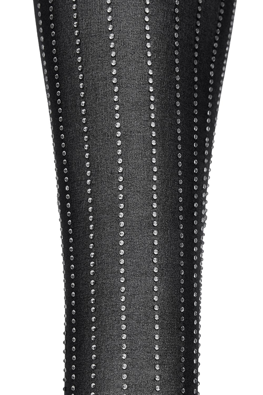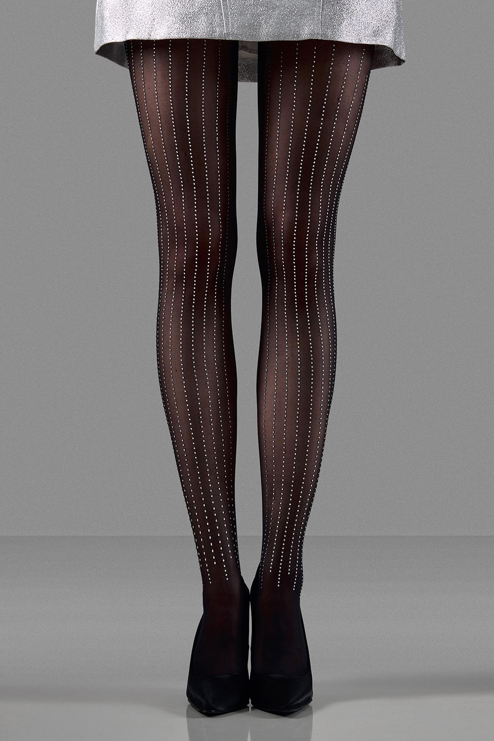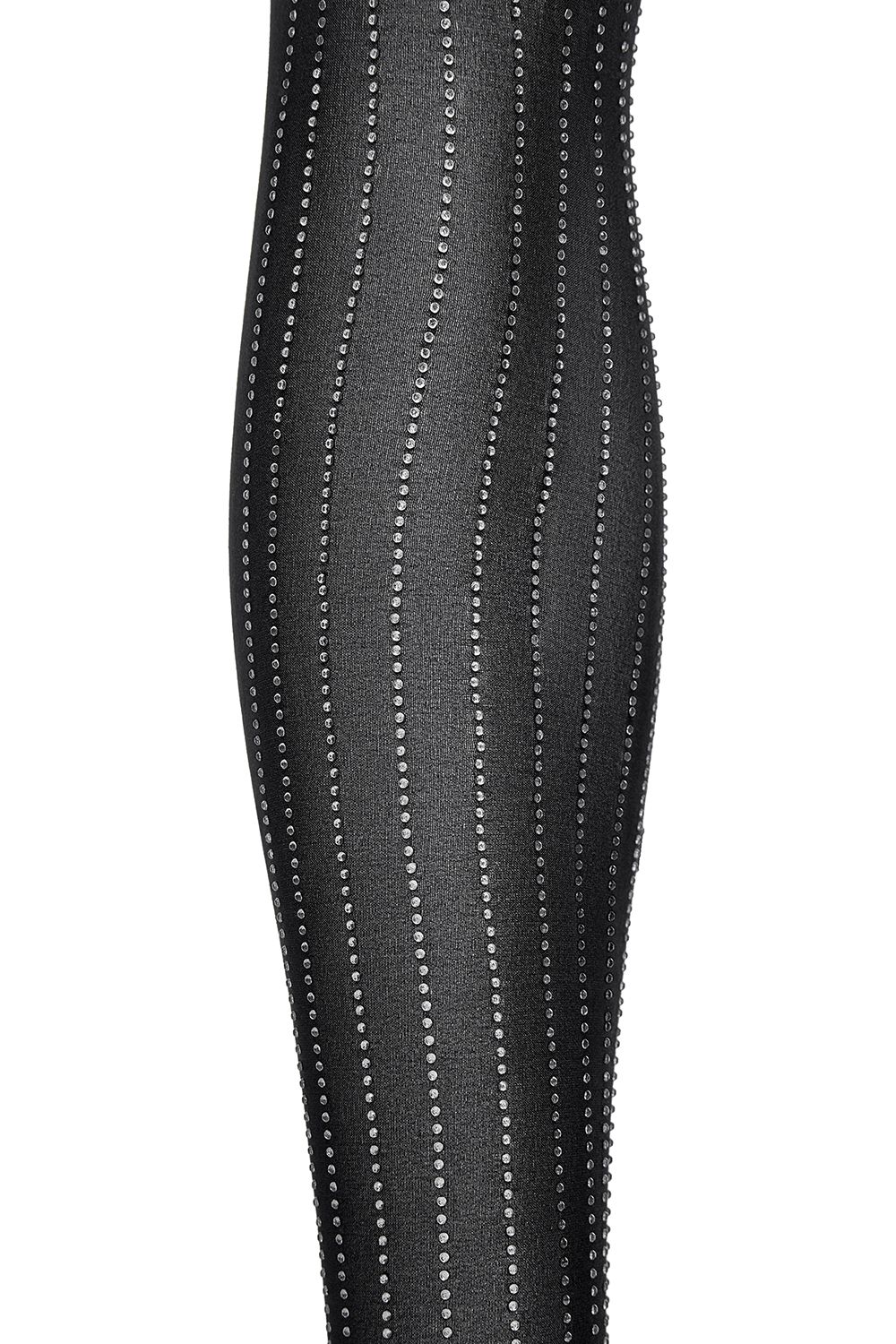Элегантные чёрные колготки, украшенные мерцающими кристаллами, расположенными в изящные вертикальные полосы. Такой рисунок визуально вытягивает силуэт, придавая ногам стройность и блеск. Состав: 100% Полиэстер
