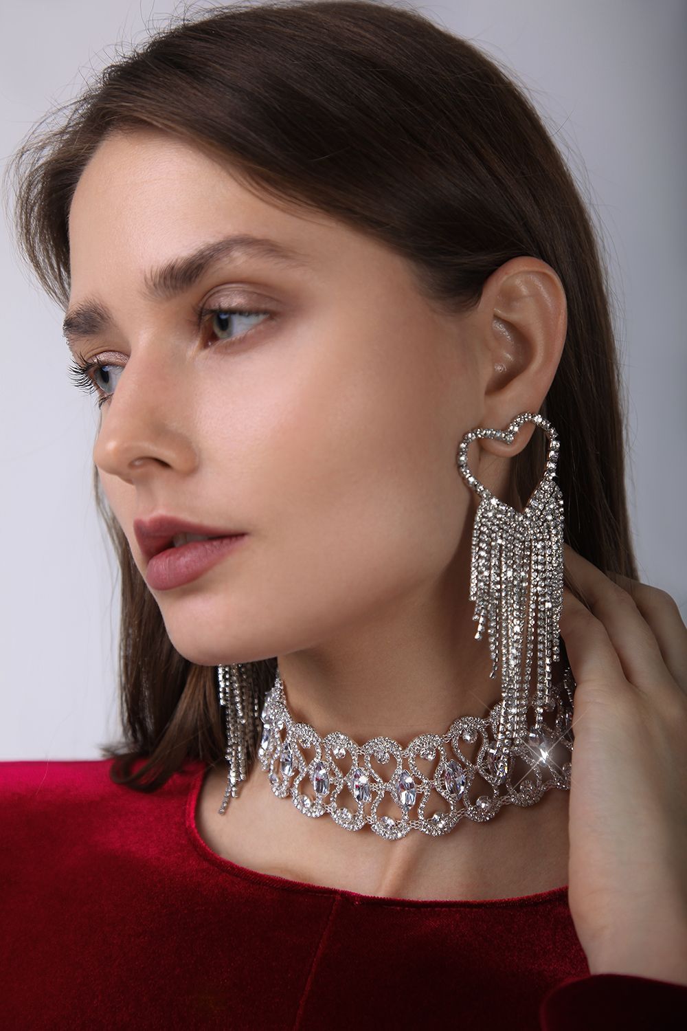 Блестящие в форме сердец с пышными подвесками. Застежка пусет. Состав: Металл/стразы