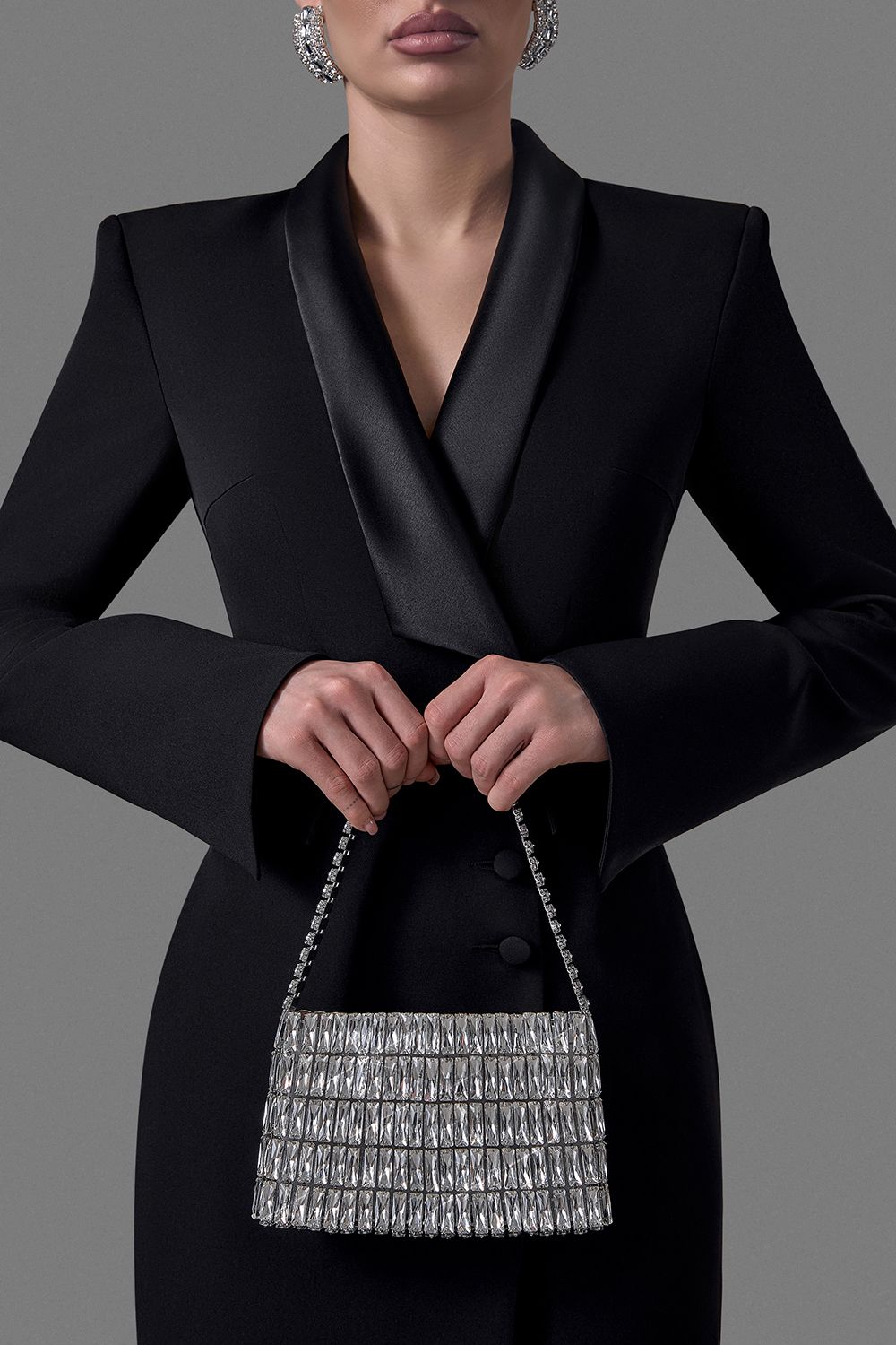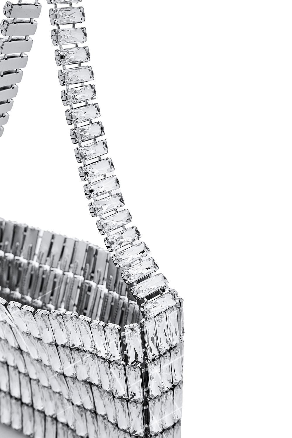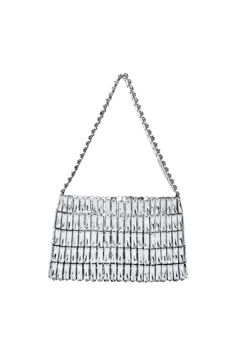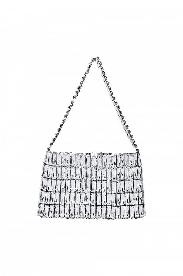 Эффектная вечерняя сумка, полностью собранная из прямоугольных гранёных кристаллов, выстроенных ровными архитектурными рядами. Благодаря металлической жёсткой основе изделие сохраняет форму, подчёркивая чистую геометрию силуэта. Состав: 100% металл/стекло
