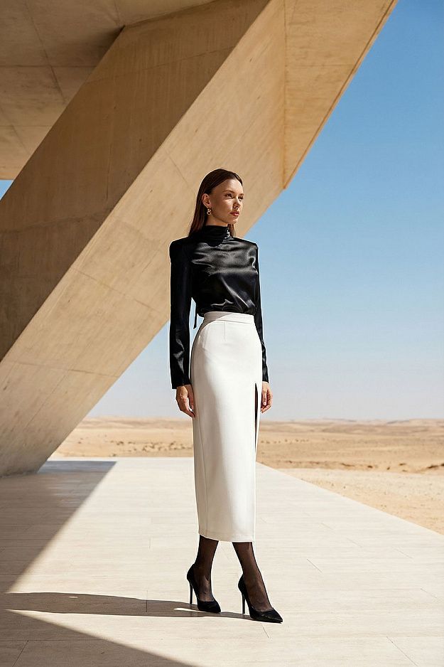 Элегантная блуза из гладкого атласного материала с мягким блеском. Спереди — лаконичный дизайн с высоким воротом-стойкой, а сзади — эффектная драпированная линия декольте, фиксирующаяся тонкими завязками. Длинные рукава создают изящный силуэт, а прямой крой обеспечивает комфортную посадку. Состав: 97% полиэстер, 3% спандекс