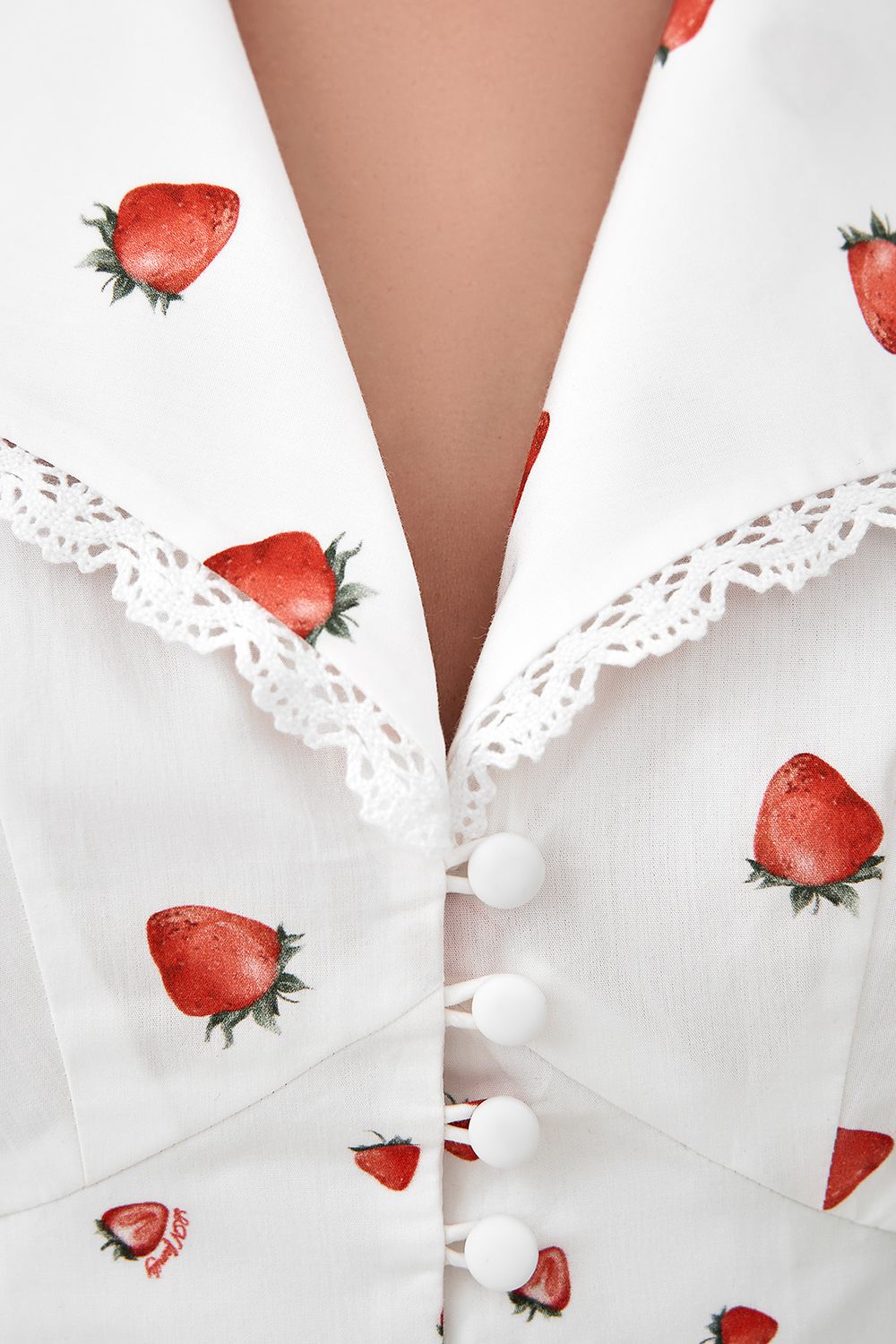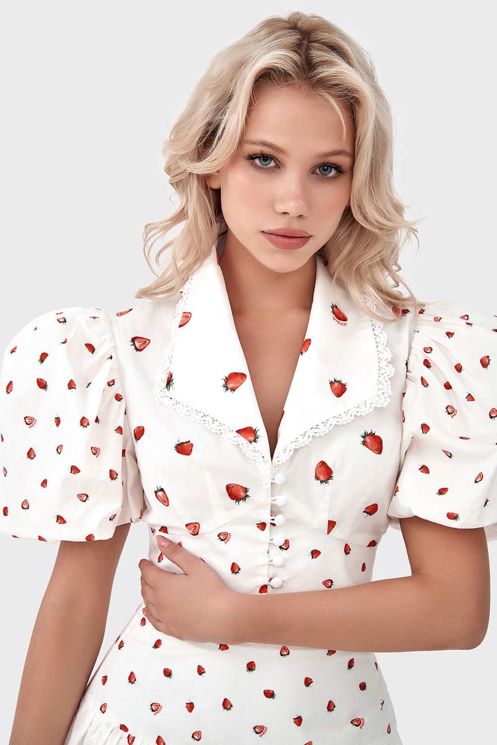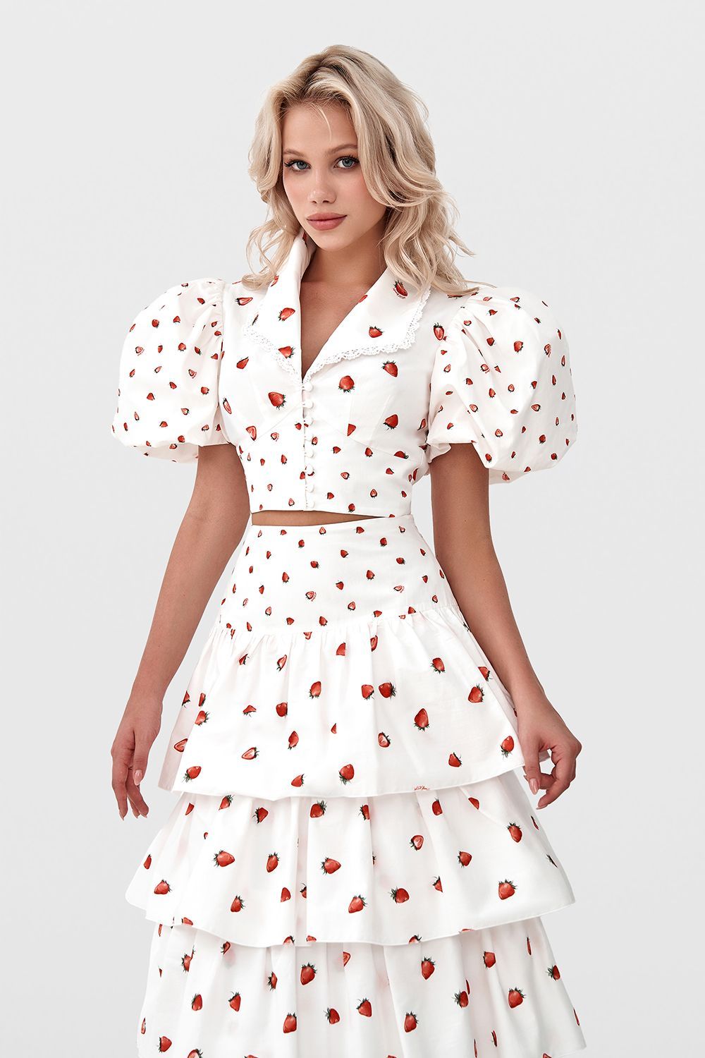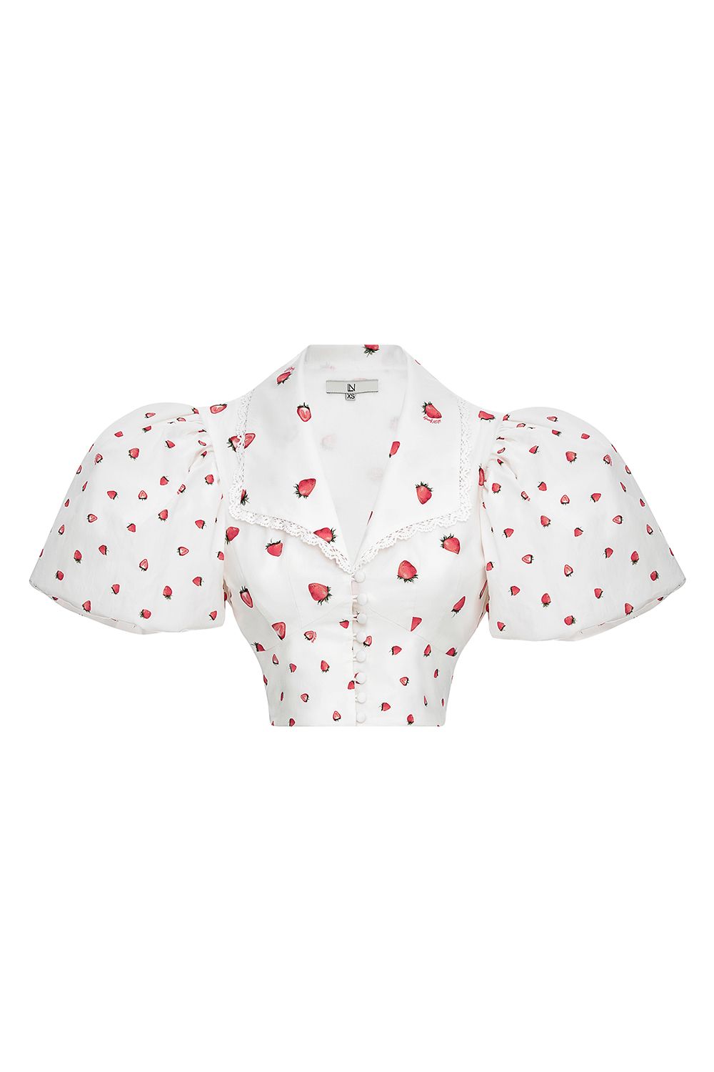 Топ выполнен из высококачественного 100% хлопка. Модель имеет классический V-образный вырез подчеркивающий зону декольте, и застегивается на аккуратные черные пуговицы спереди. Рукава — пышные, с легким буффом, добавляют романтичности и женственности. Состав: 100% хлопок, Подкладка 100% хлопок