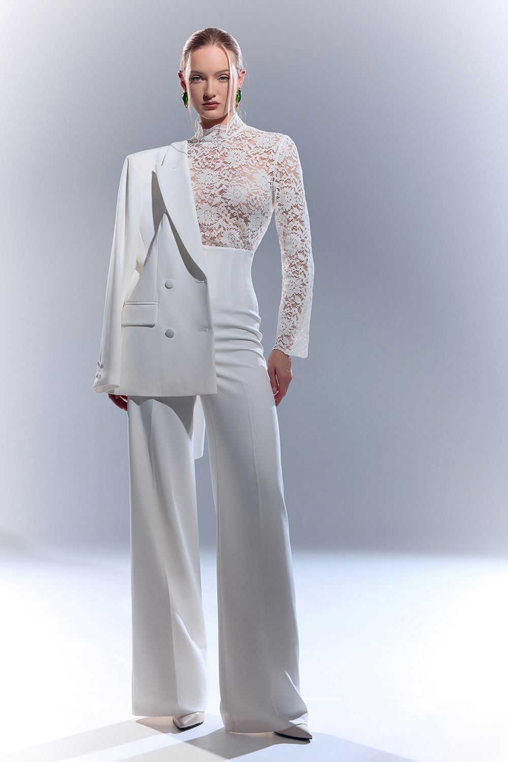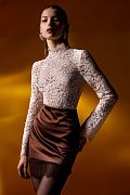 Элегантный топ из тонкого кружевного полотна. Изделие выполнено с высоким горлом и длинными рукавами, полностью покрытыми цветочным кружевом. Прилегающий силуэт подчёркивает линии фигуры, создавая утончённый и женственный образ. Идеален для вечерних выходов, сочетаний с жакетами, юбками или брюками с высокой посадкой. Состав: 80% хлопок, 20% полиэстер