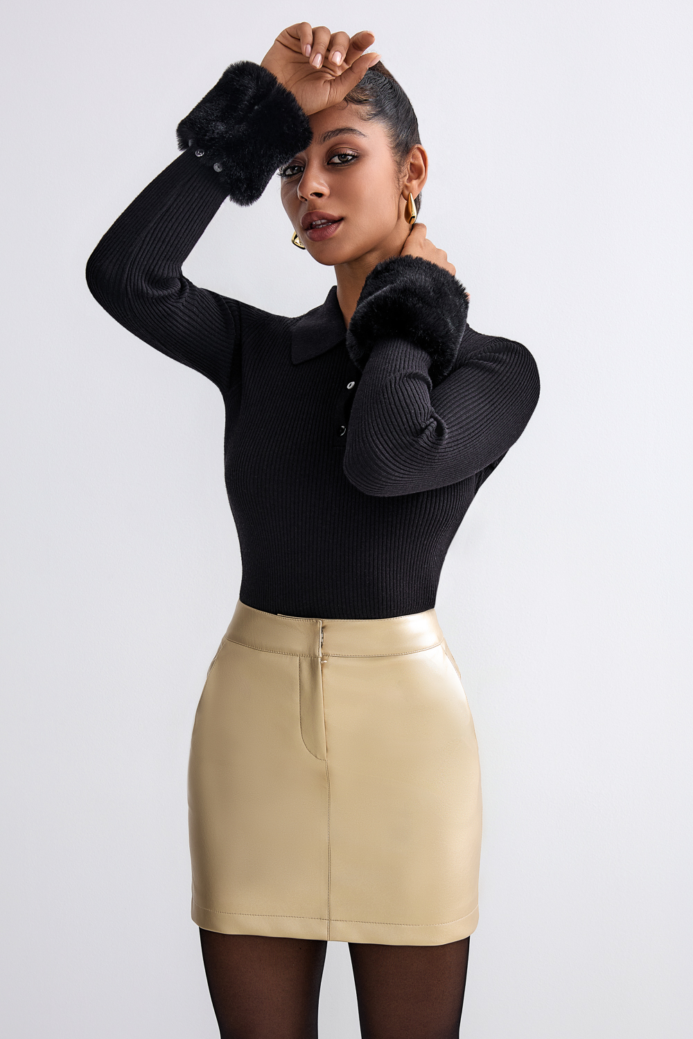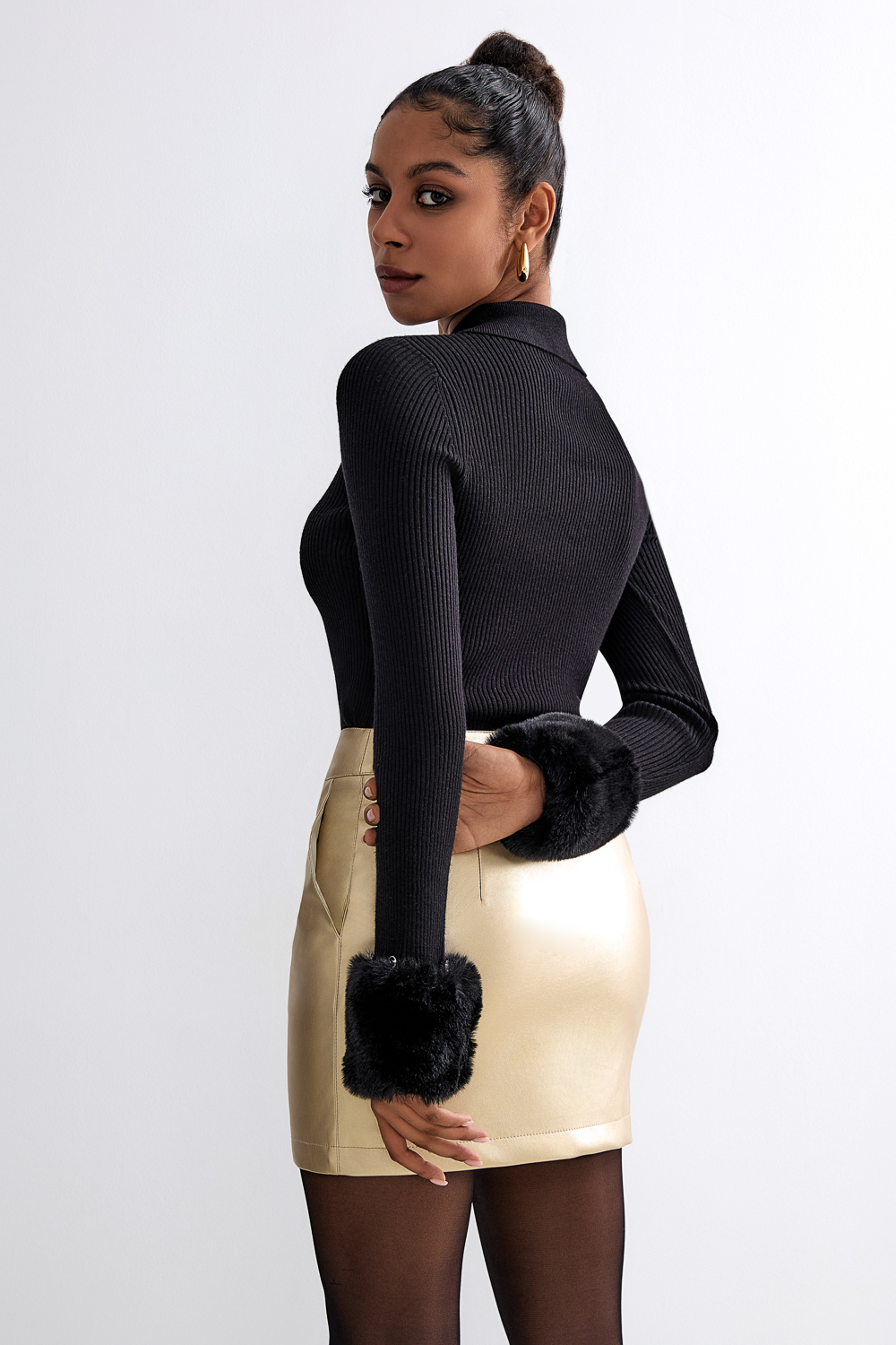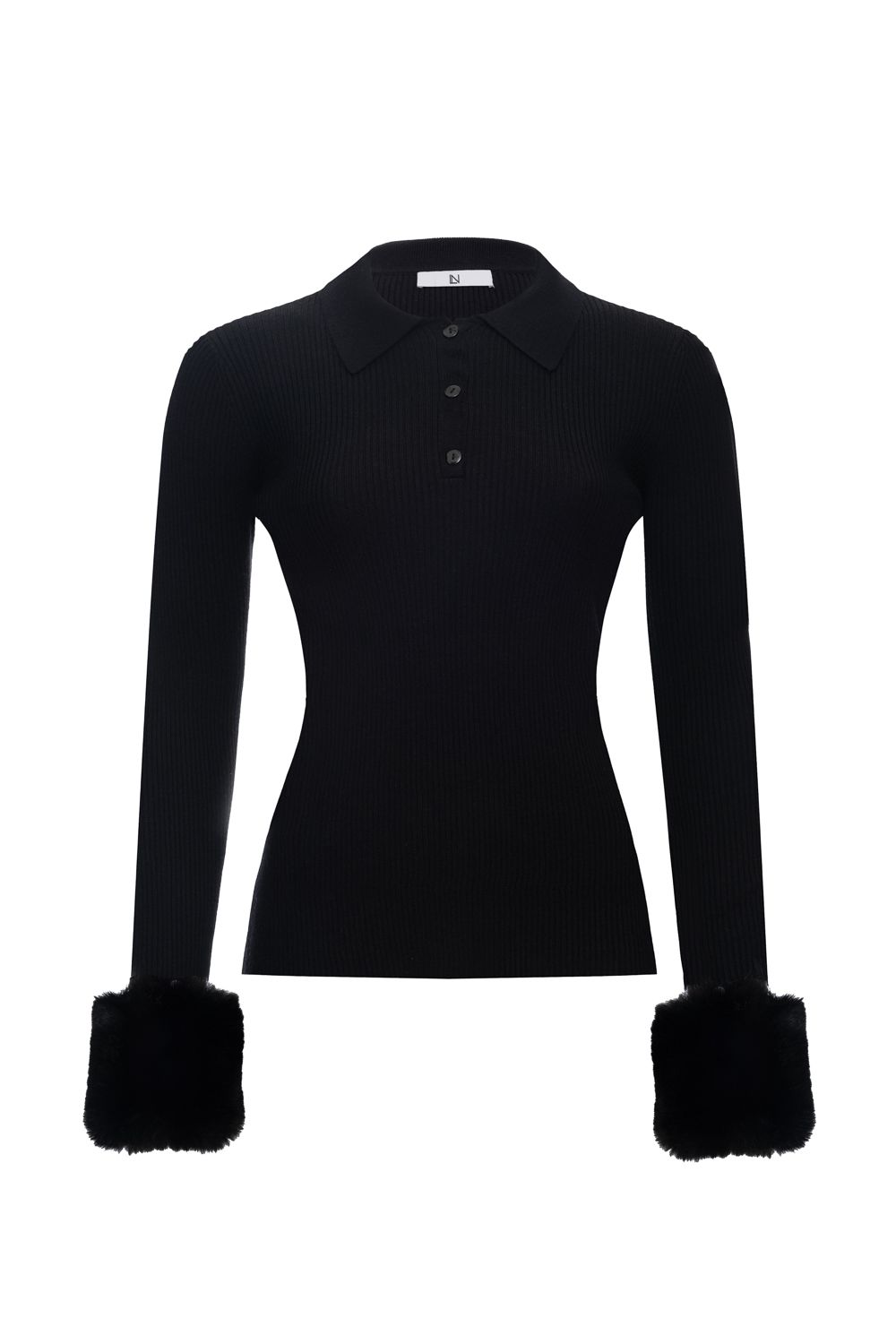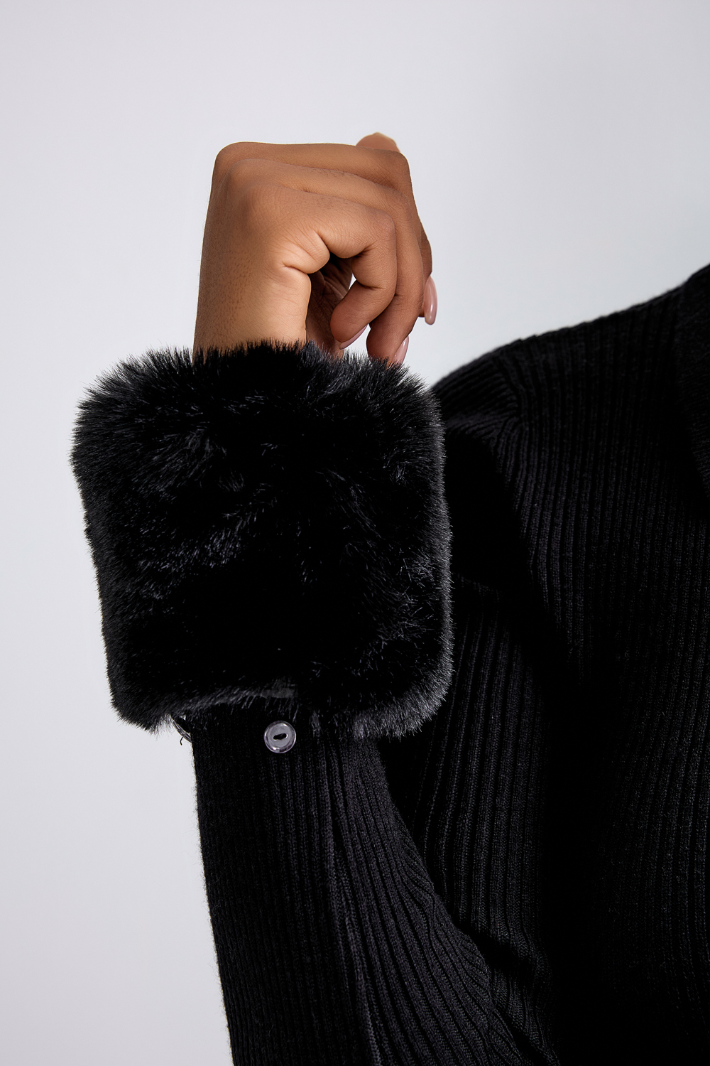 Трикотажная кофта поло в рубчик на пуговицах. Длинный рукав украшен искусственным мехом. Мех на рукавах — съемный. Длина по спинке 56 см, длина рукава 59 см. Состав: 45% вискоза, 29% полиэстер, 17% нейлон, 9% шерсть.