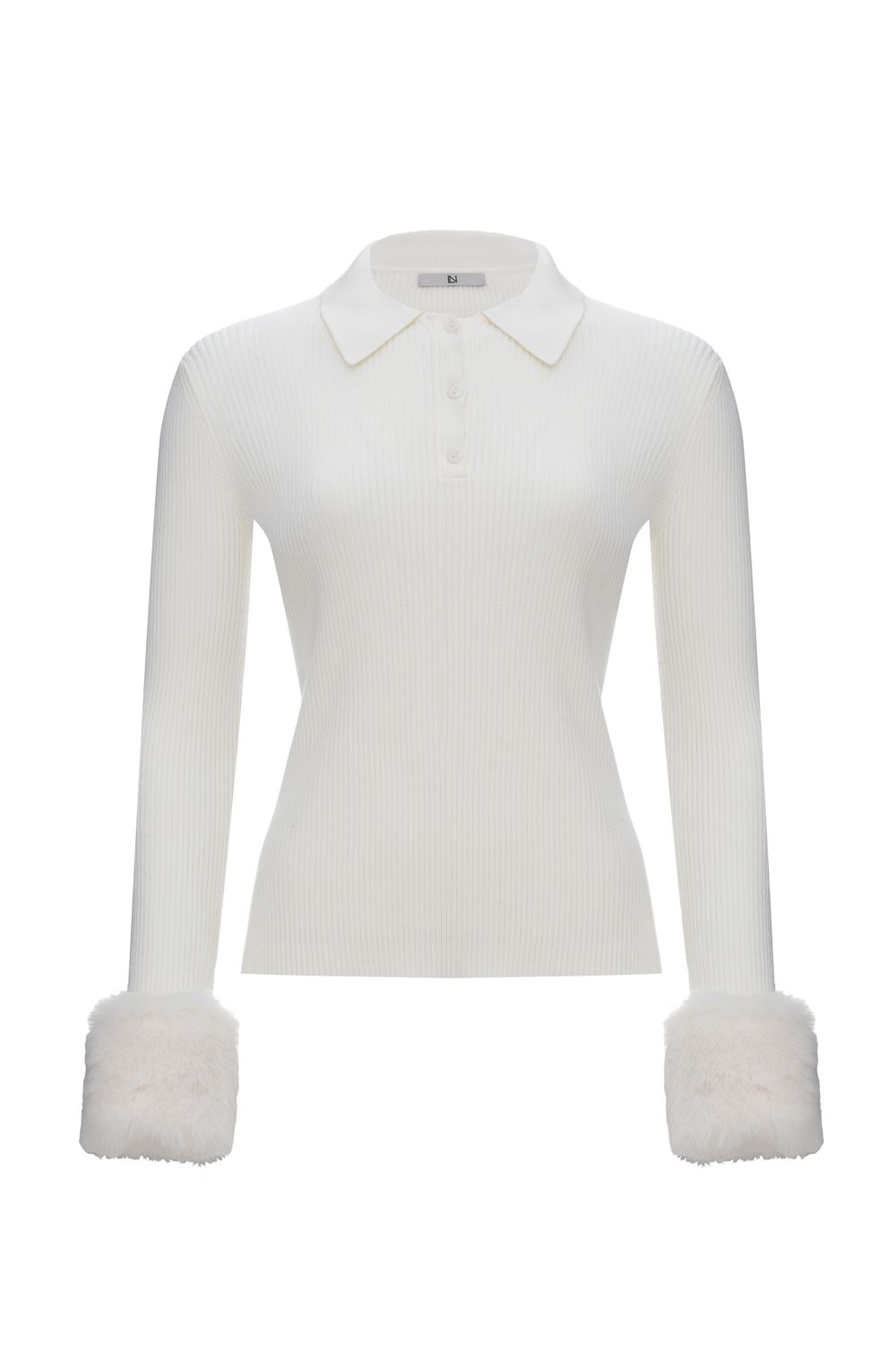 Трикотажная кофта поло в рубчик на пуговицах. Длинный рукав украшен искусственным мехом. Мех на рукавах — съемный. Длина по спинке 56 см, длина рукава 59 см. Состав: 45% вискоза, 29% полиэстер, 17% нейлон, 9% шерсть.
