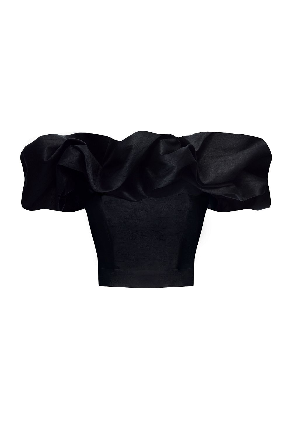 Эффектный топ-бюстье с открытыми плечами выполнен из плотной ткани с легким сатиновым блеском. Модель украшена объемными драпированными рюшами по линии декольте, создающими выразительный акцент и придающими образу торжественность и женственность. Идеальный вариант для вечернего выхода или коктейльного образа.. Состав: 88% полиэстер, 12% вискоза, Подкладка 95% полиэстер, 5% эластан