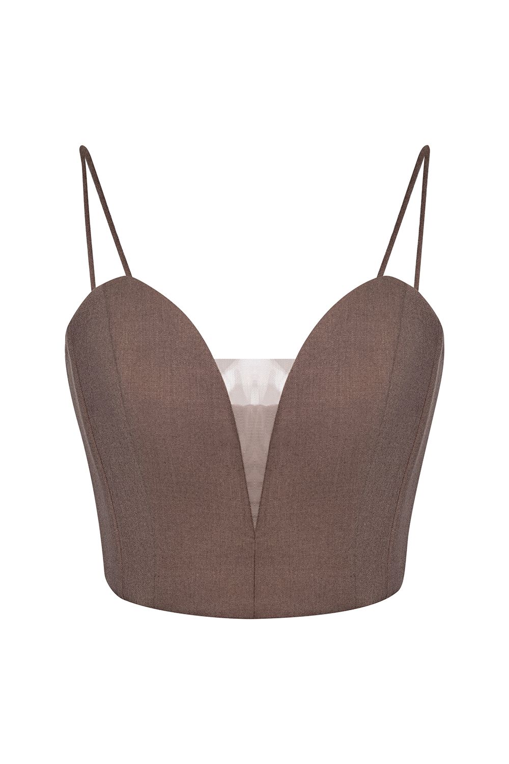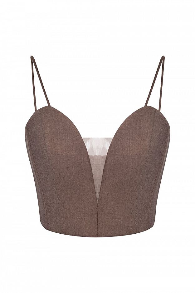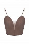 Топ из костюмной ткани с глубоким V-образным вырезом. Модель на тонких бретелях, с мягкими чашками и вставкой из сетки в зоне декольте для идеальной посадки.Состав: 65% полиэстер, 32% вискоза, 3% спандекс, Подкладка 95% полиэстер, 5% эластан