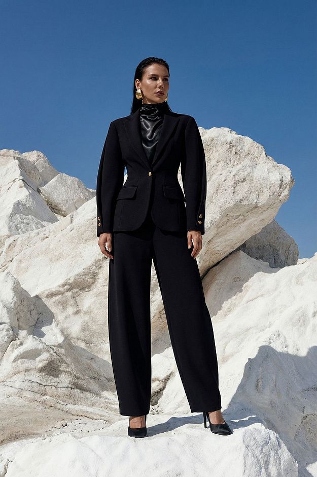 Брюки-бананы с высокой посадкой и мягким объёмом в области бёдер. Силуэт плавно сужается к низу, формируя аккуратную линию ног и подчёркивая талию. Минималистичный дизайн делает модель базовой для повседневного и офисного гардероба. Состав: 67% полиэстер, 29% вискоза, 4% эластан