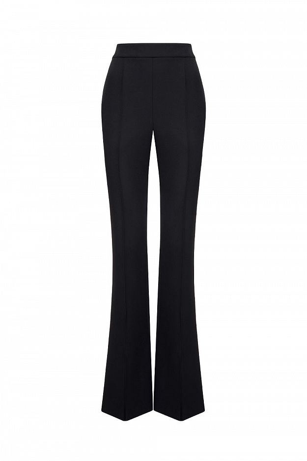 Брюки с высокой посадкой, подчёркивающей линию талии и визуально вытягивающей силуэт. Модель выполнена в приталенном крое по бёдрам с мягким расклешением от колена. Вертикальные рельефы усиливают эффект стройности, а аккуратные разрезы по низу спереди добавляют динамику и изящно открывают линию обуви. Состав: 72% полиэстер, 23% вискоза, 5% эластан