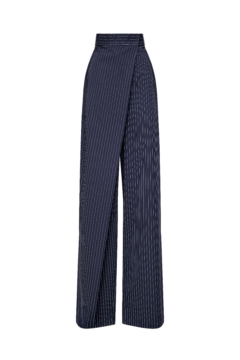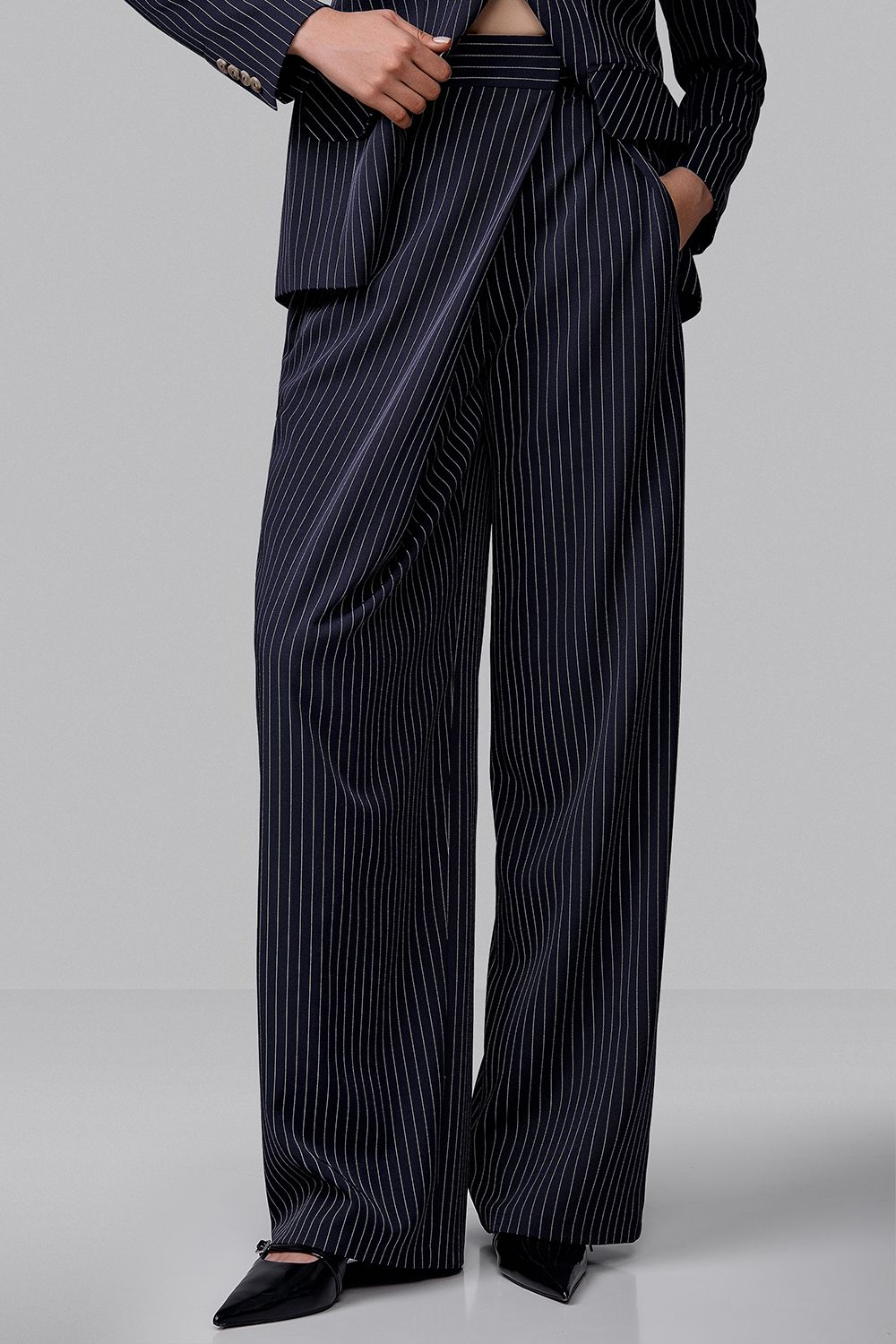 Высокая посадка подчёркивает линию талии, а асимметричный запах формирует выразительную архитектуру силуэта. Мягко расширяющиеся брючины создают плавную вертикаль и визуально вытягивают фигуру. Ткань в деликатную полоску добавляет образу графичность и элегантность. Брюки легко сочетаются с жакетом из комплекта или становятся акцентной частью самостоятельного. Состав: 94% полиэстер, 6% спандекс