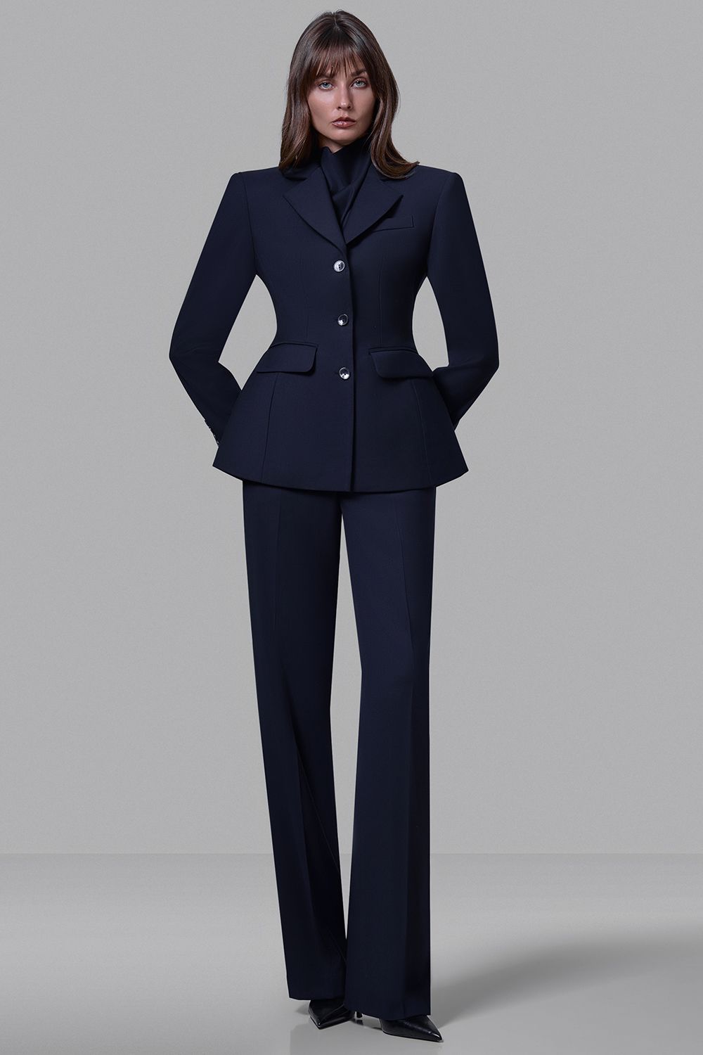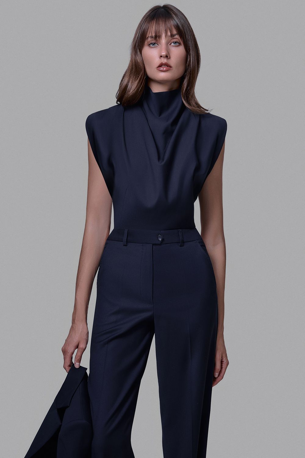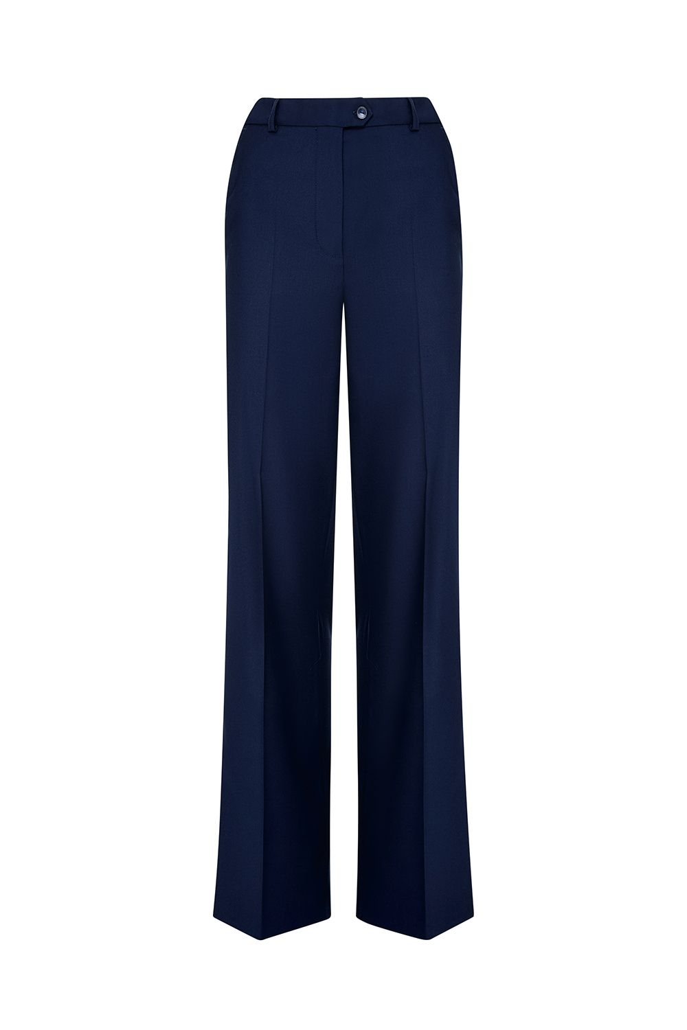 Брюки прямого кроя с высокой посадкой — элегантная база для современного гардероба. Модель выполнена из плотной костюмной ткани, которая хорошо держит форму. Спереди — классическая застёжка на пуговицу и молнию, шлёвки для ремня и боковые карманы. Сзади — декоративные карманы с пуговицами и акцентный ремень с металлической пряжкой, добавляющий образу изысканности. Состав: 67% полиэстер, 30% вискоза, 3% эластан; подкладка: 95% полиэстер, 5% эластан