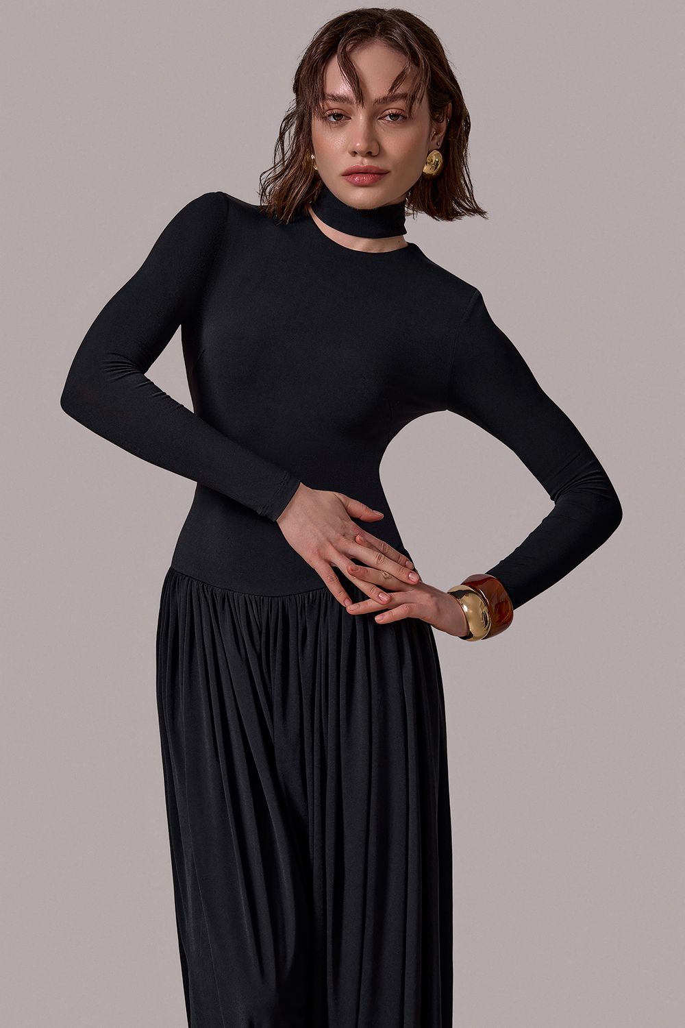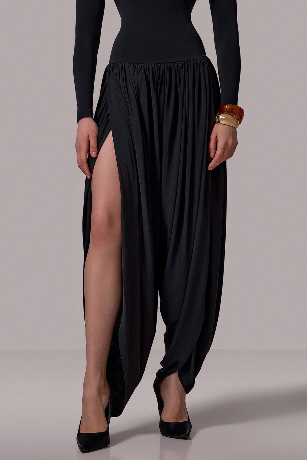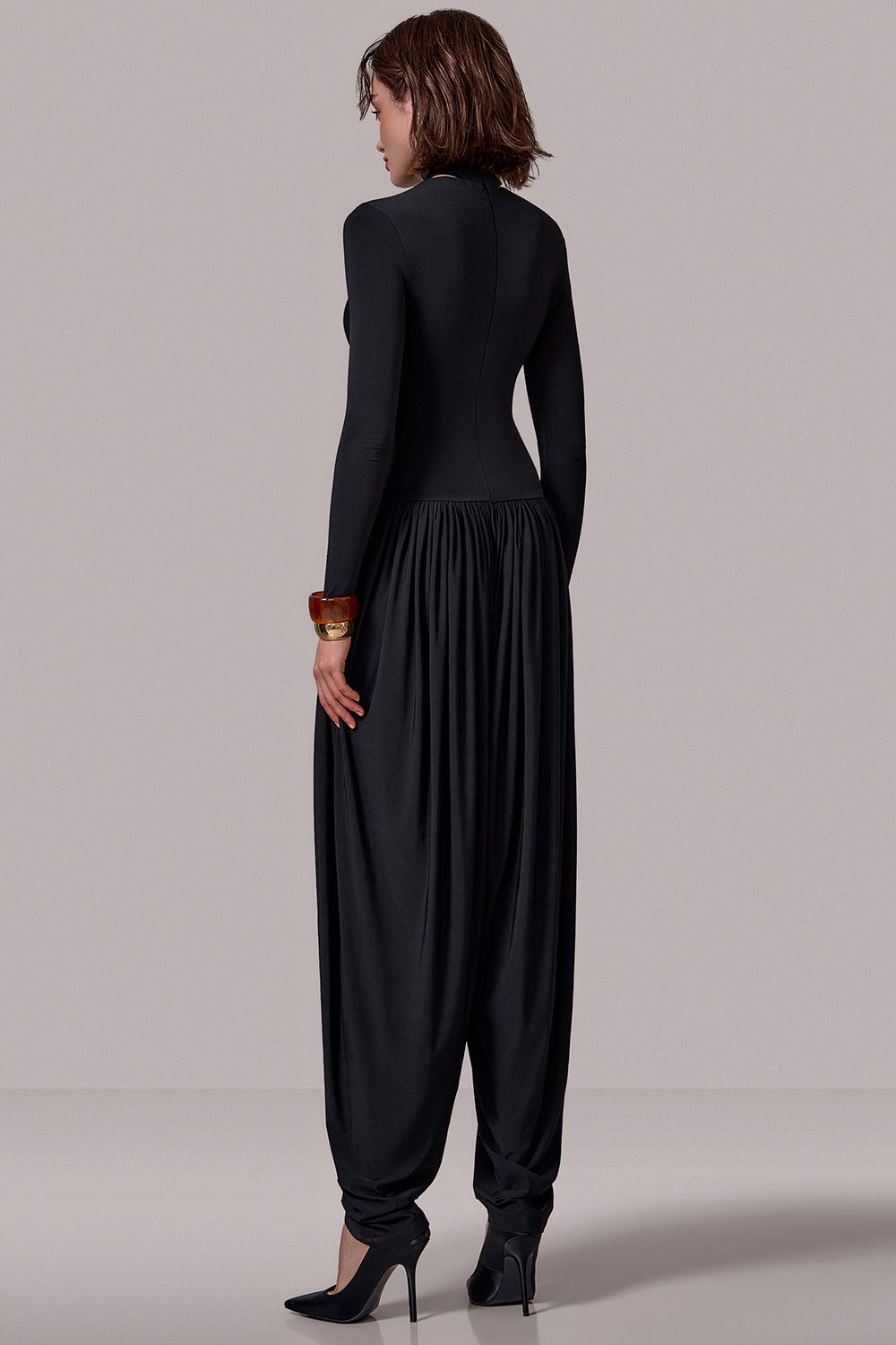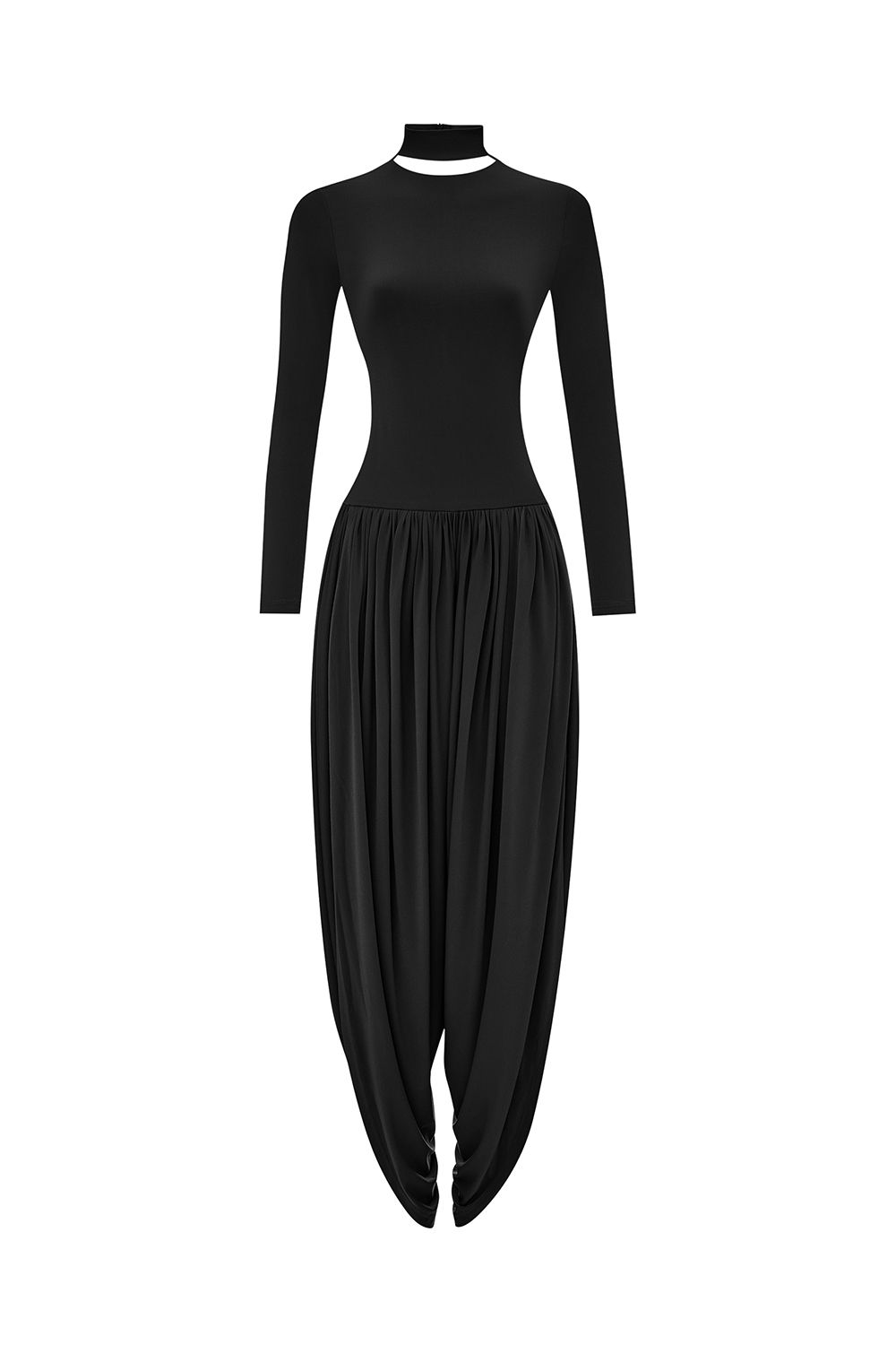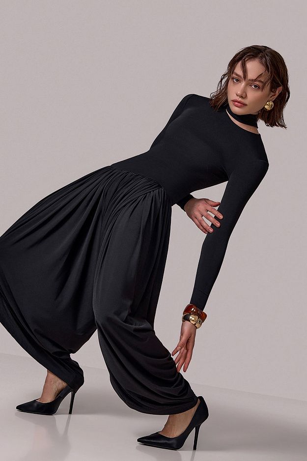 Комбинезон с уникальным дизайнерским кроем: Верх из эластичной ткани — мягко подчеркивает фигуру, обеспечивает комфорт и свободу движений. Длинные рукава и высокий воротник с изящным вырезом создают изысканный акцент. Свободные брюки с драпировкой напоминают восточные шаровары, визуально вытягивают силуэт и добавляют динамики. Состав: 94% полиэстр, 6% спандекс