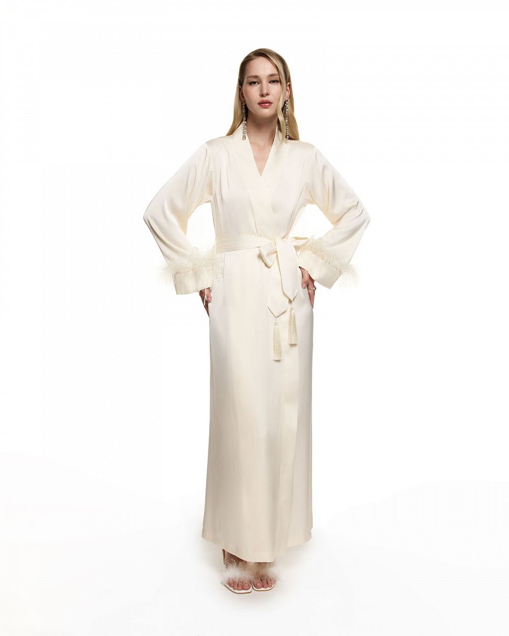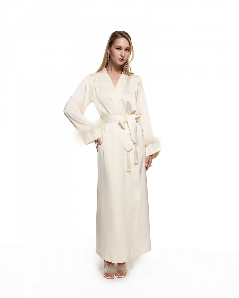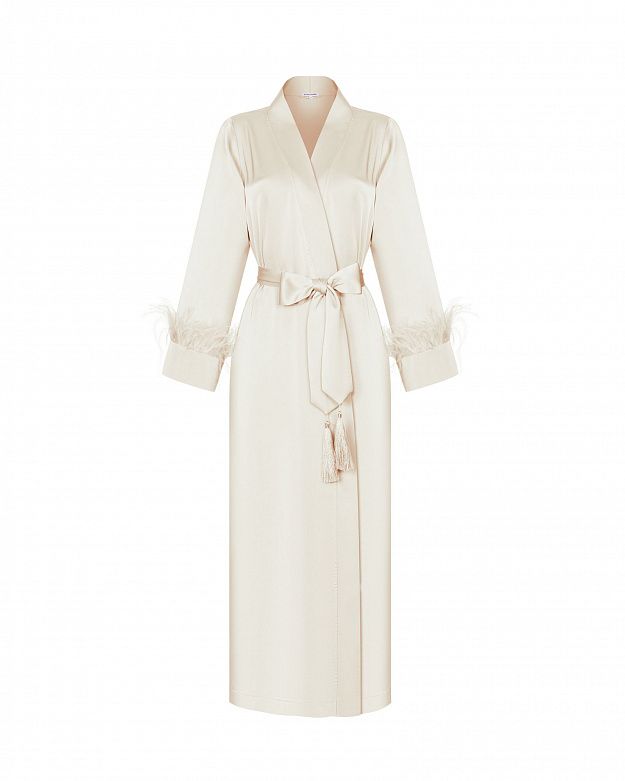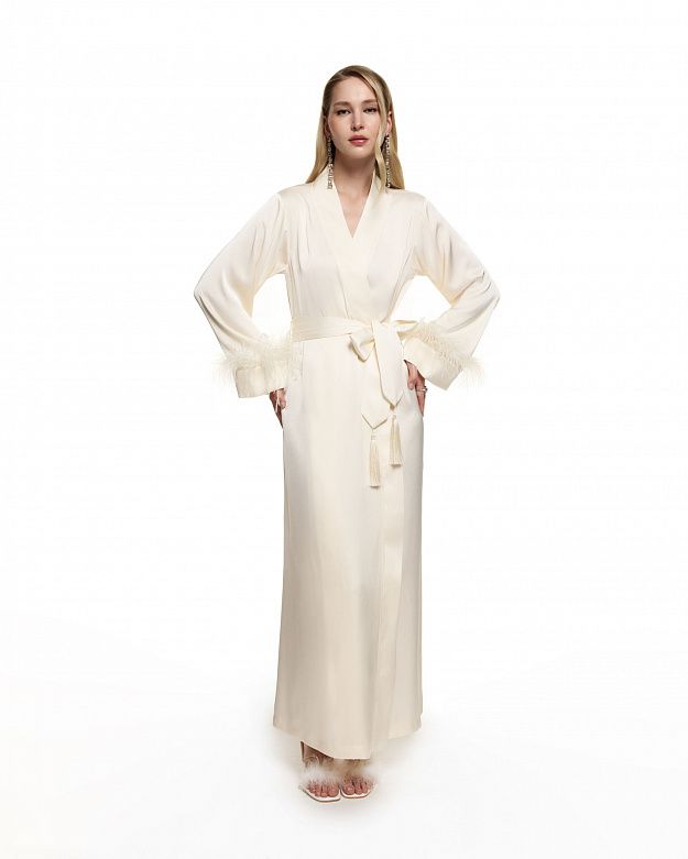 Халат выполненный из гладкого искусственного шелка, он мягко ложится на тело, даря ощущение лёгкости и комфорта. Расклешённые рукава украшены россыпью перьев, добавляющих игривую драматичность и утонченную женственность. Халат фиксируется широким поясом с декоративными кисточками — его можно завязать на талии или носить распущенным, создавая расслабленный, но выразительный силуэт. Состав: 100% искусственный шелк