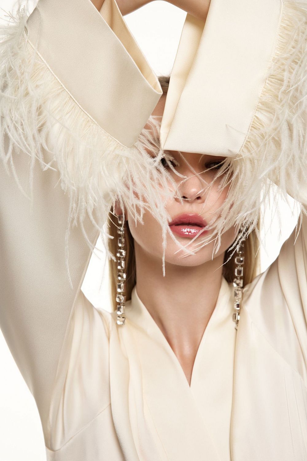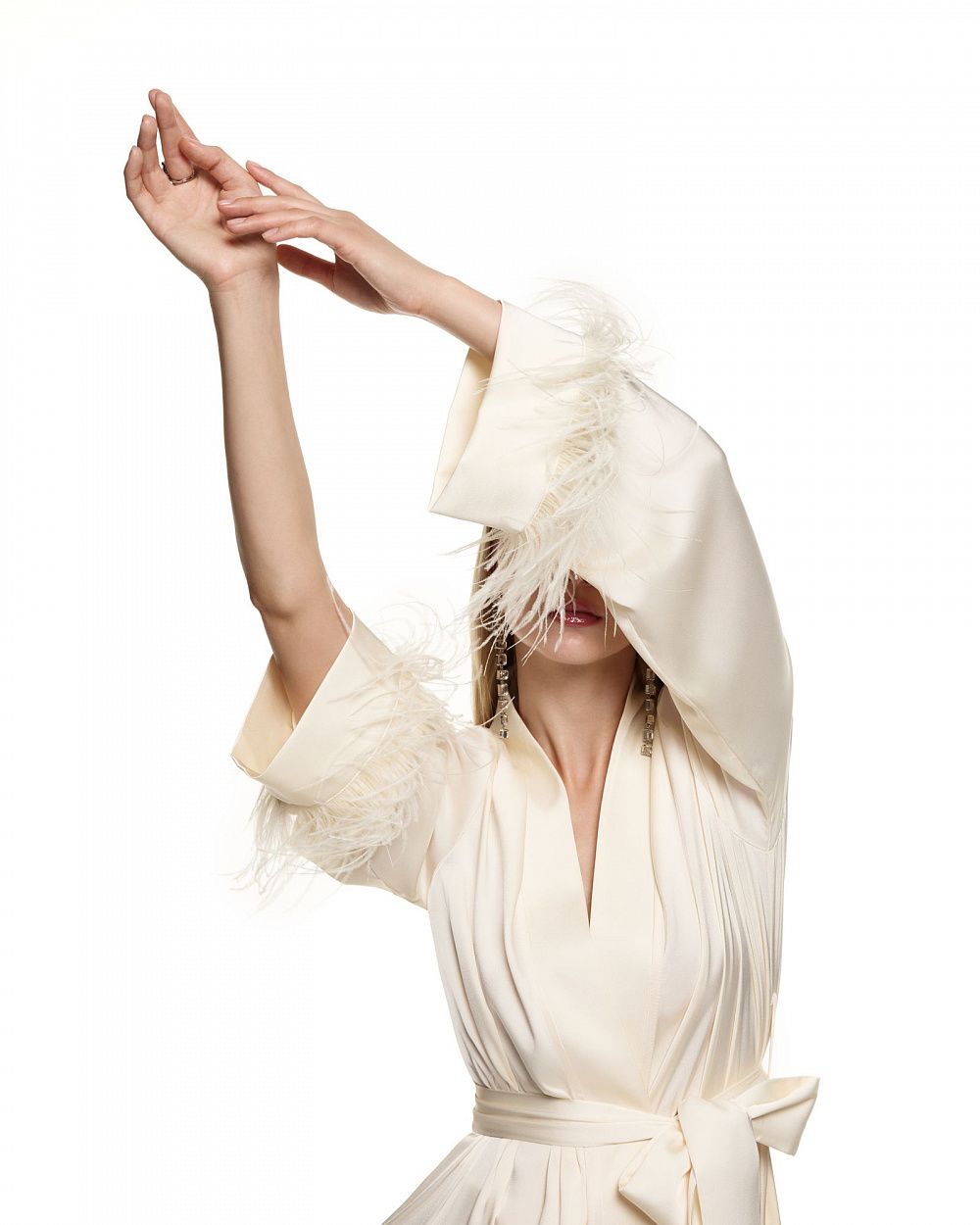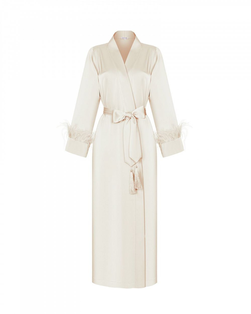 Халат выполненный из гладкого искусственного шелка, он мягко ложится на тело, даря ощущение лёгкости и комфорта. Расклешённые рукава украшены россыпью перьев, добавляющих игривую драматичность и утонченную женственность. Халат фиксируется широким поясом с декоративными кисточками — его можно завязать на талии или носить распущенным, создавая расслабленный, но выразительный силуэт. Состав: 100% искусственный шелк