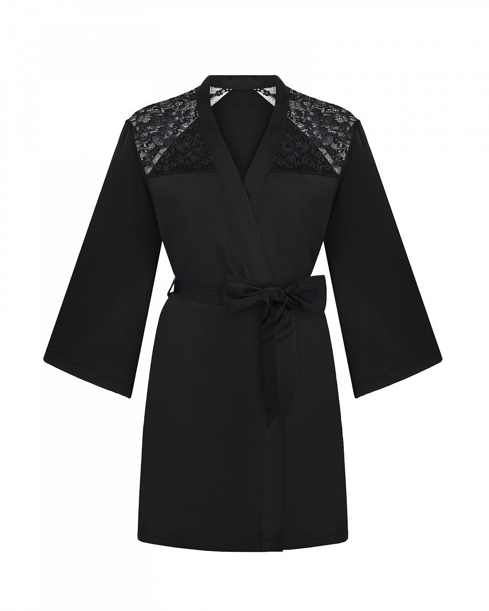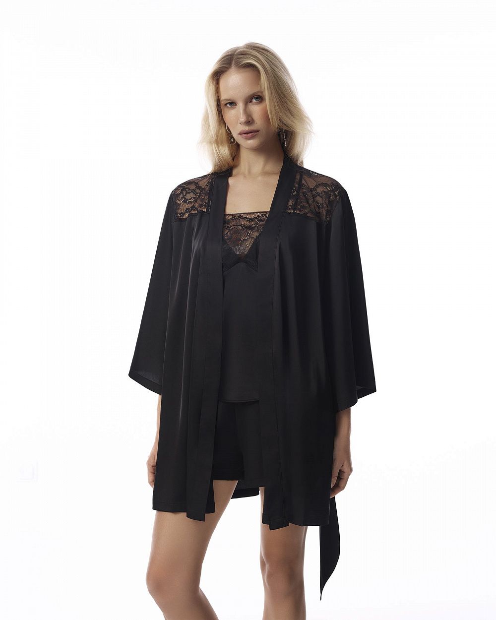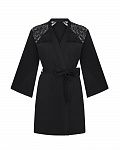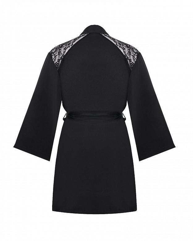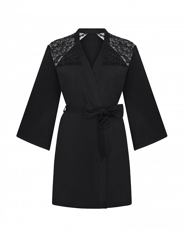 Нежный укороченный халат из гладкого, лёгкого материала с деликатным блеском. Модель украшена изысканными кружевными вставками по линии плеч, которые добавляют образу утончённости и лёгкой романтичности. Свободный рукав и мягкий пояс на талии создают комфортную посадку и подчёркивают силуэт.Состав 95% полиэстер, 5% спандекс