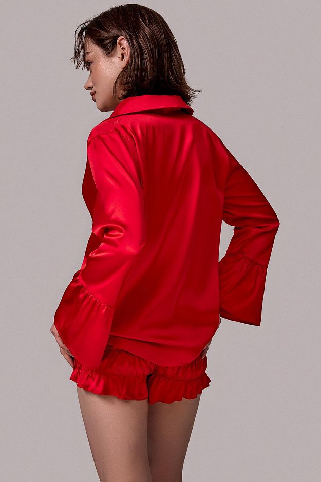 Эффектная пижама, которая объединяет комфорт и соблазнительный дизайн. Комплект состоит из трёх предметов: укороченный топ-бра, шорты с объёмными рюшами и свободная рубашка с длинными рукавами. Идеальный выбор для тех, кто ценит комфорт и хочет оставаться привлекательной даже дома. Состав: 100% Полиэстер