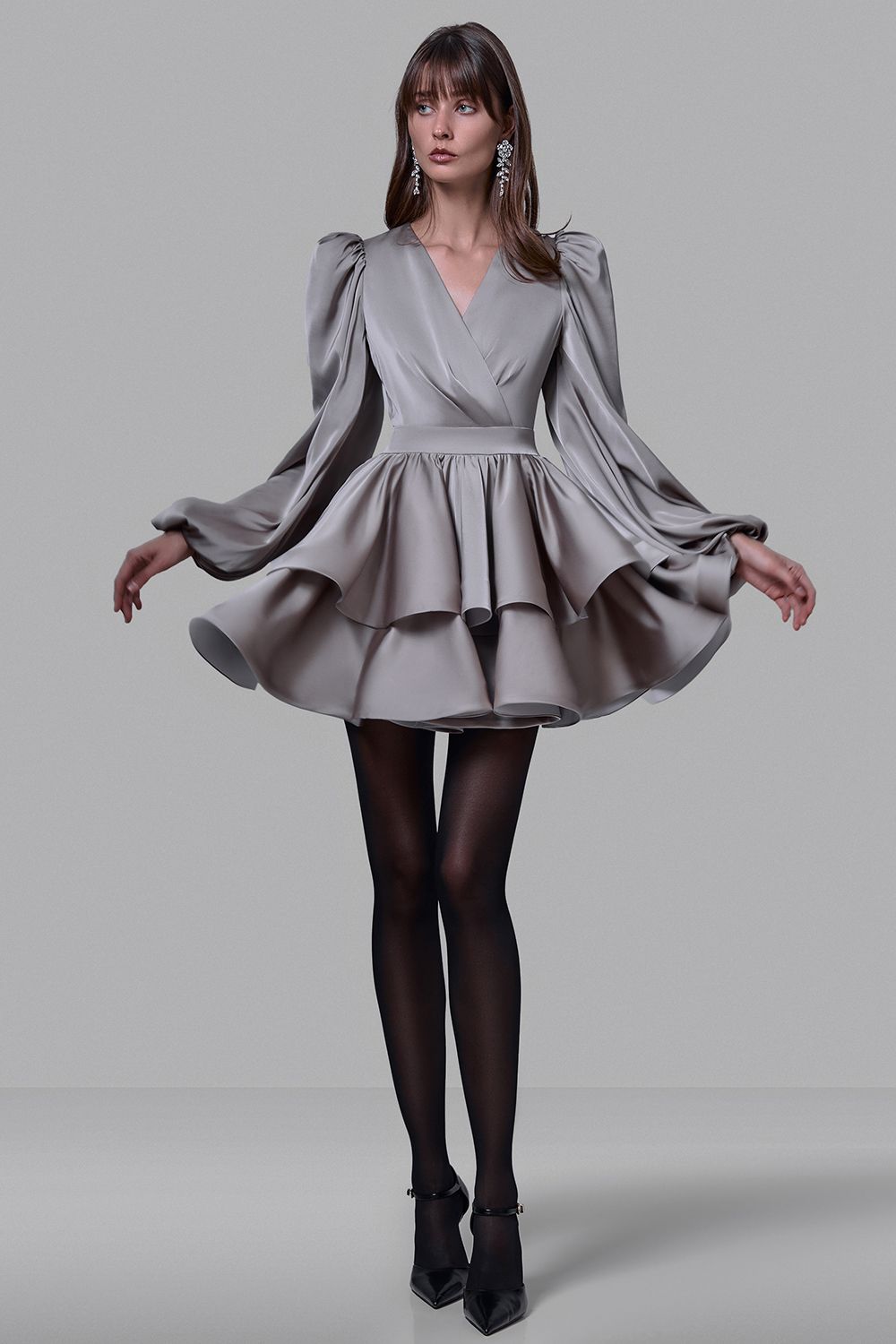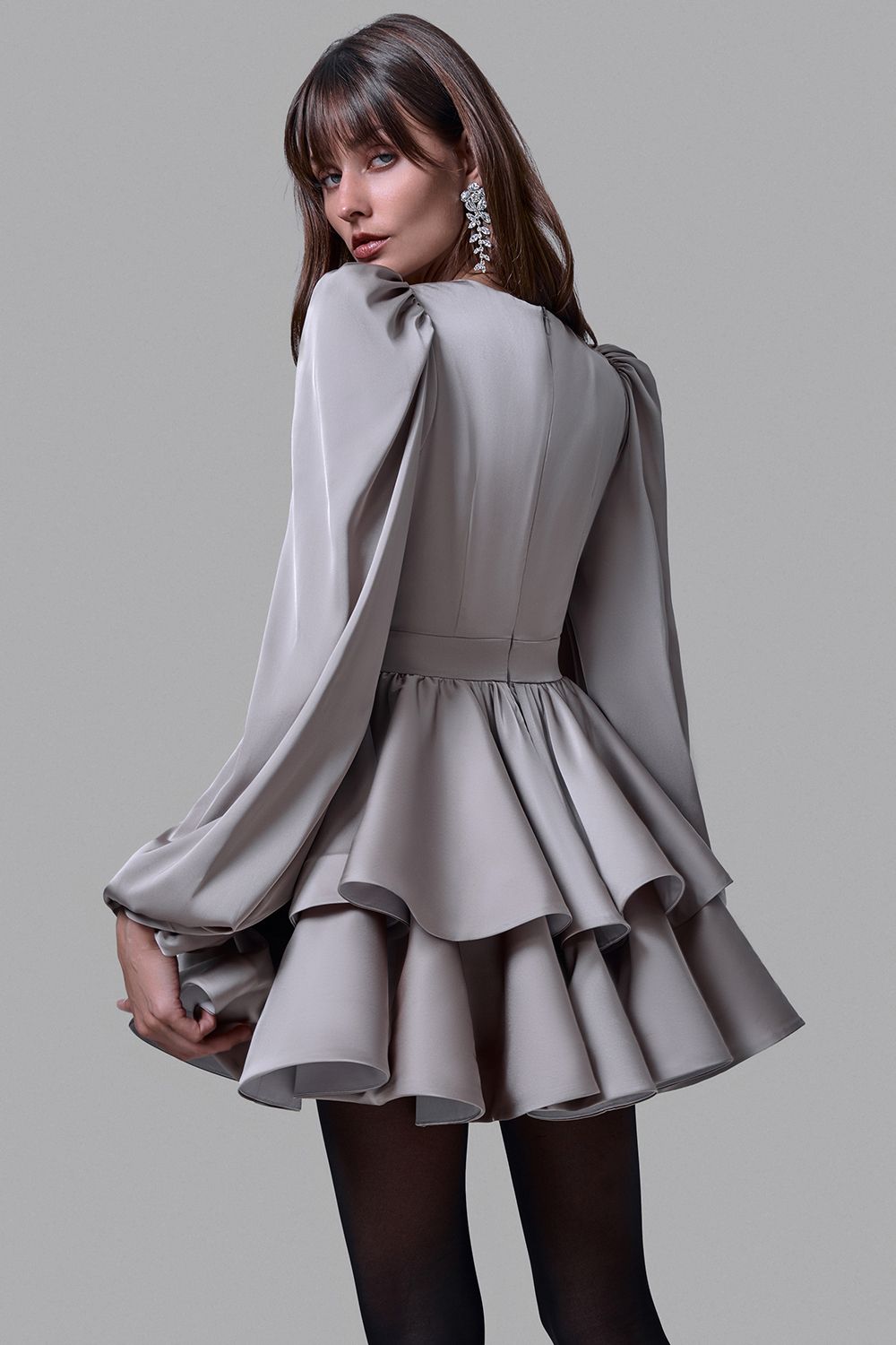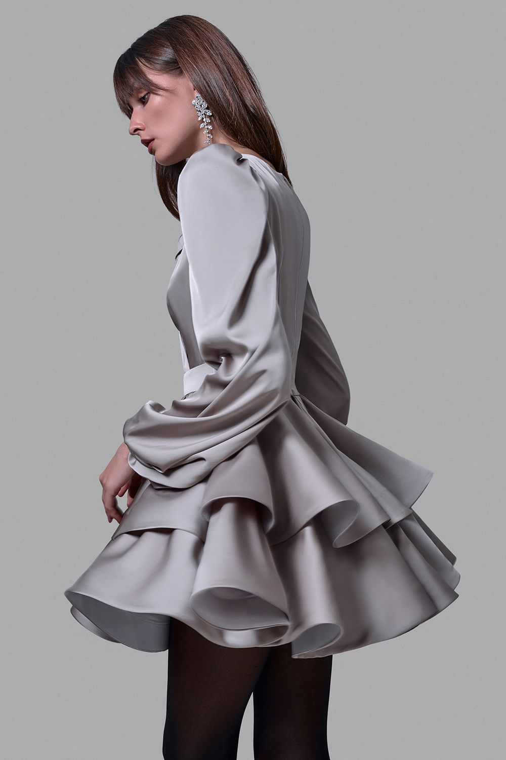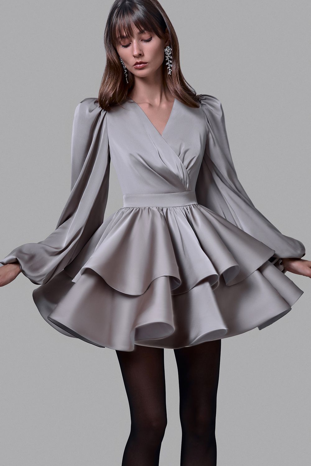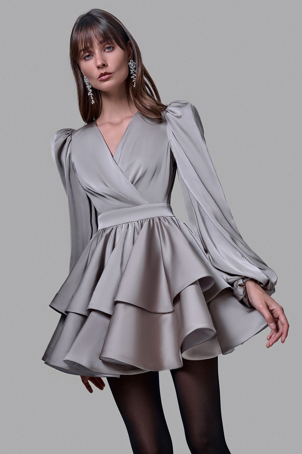 Эффектное платье мини с акцентом на плечи и воздушной многослойной юбкой. Модель выполнена с запахом и V-образным вырезом, подчеркивающим линию декольте. Длинные объемные рукава создают выразительный силуэт, а пышная юбка добавляет динамики образу. Идеальный выбор для вечеринки, коктейля или выхода в свет. Состав: 98% полиэстер, 2% спандекс, подкладка: 97% полиэстер, 3% эластан