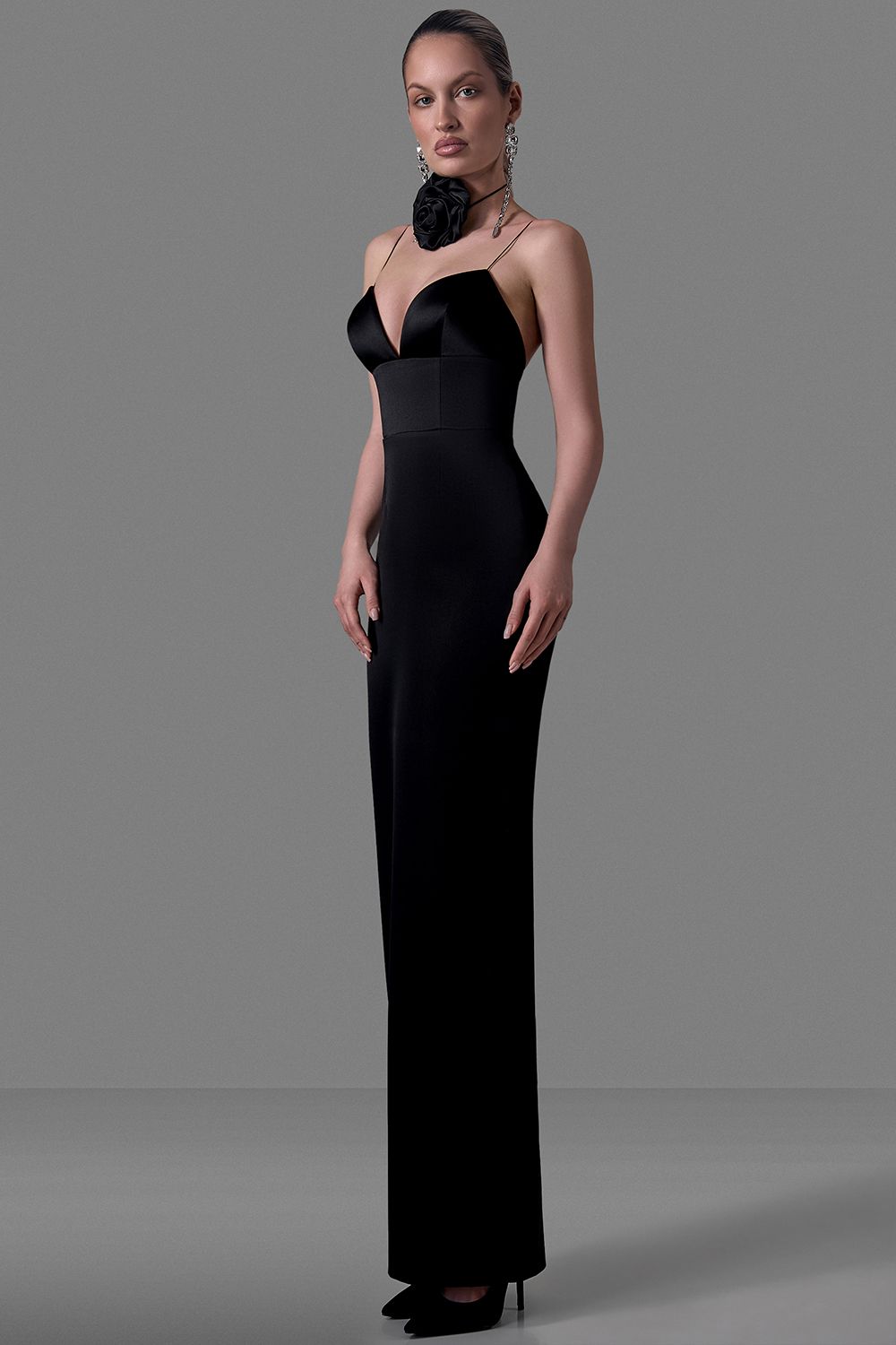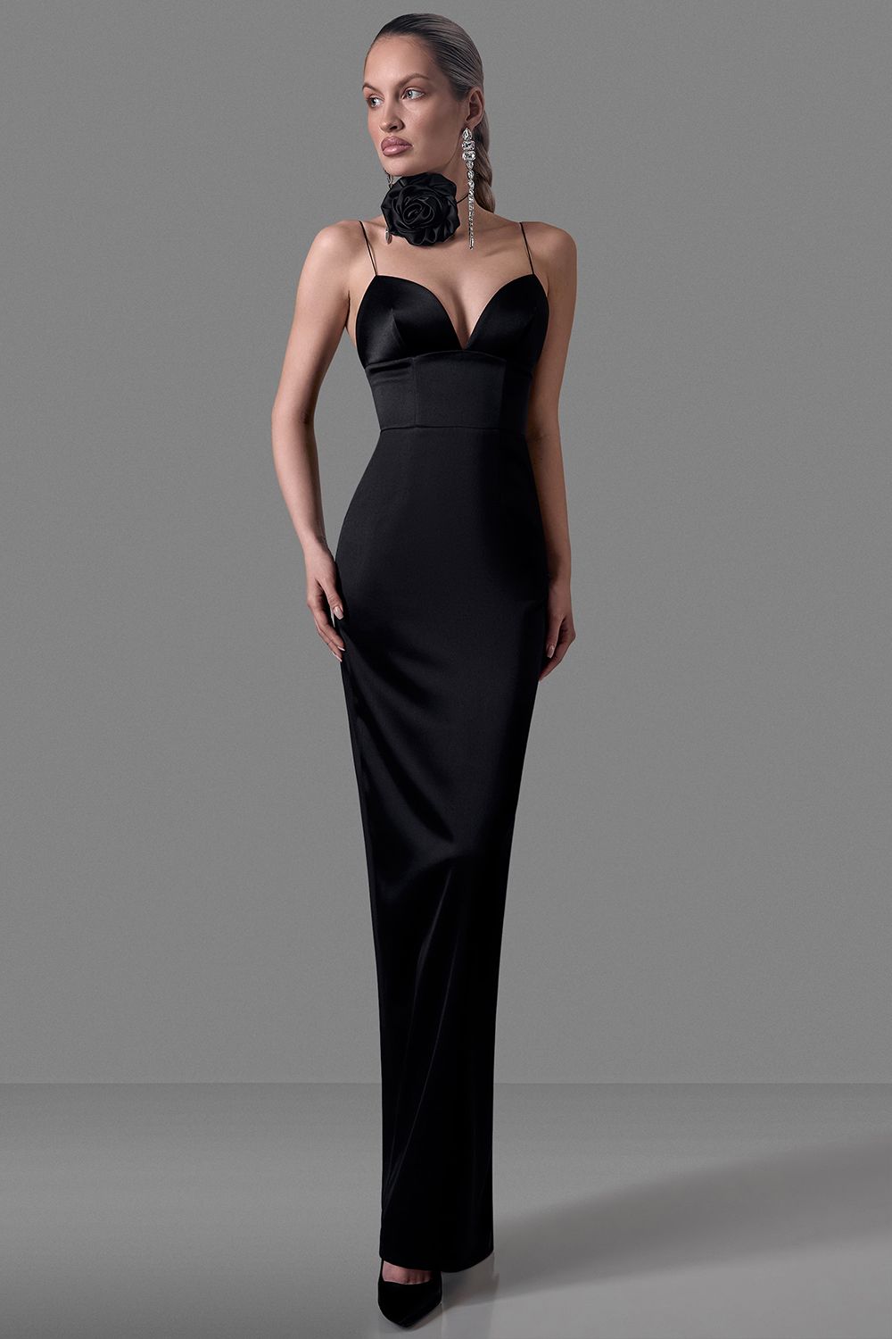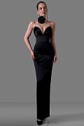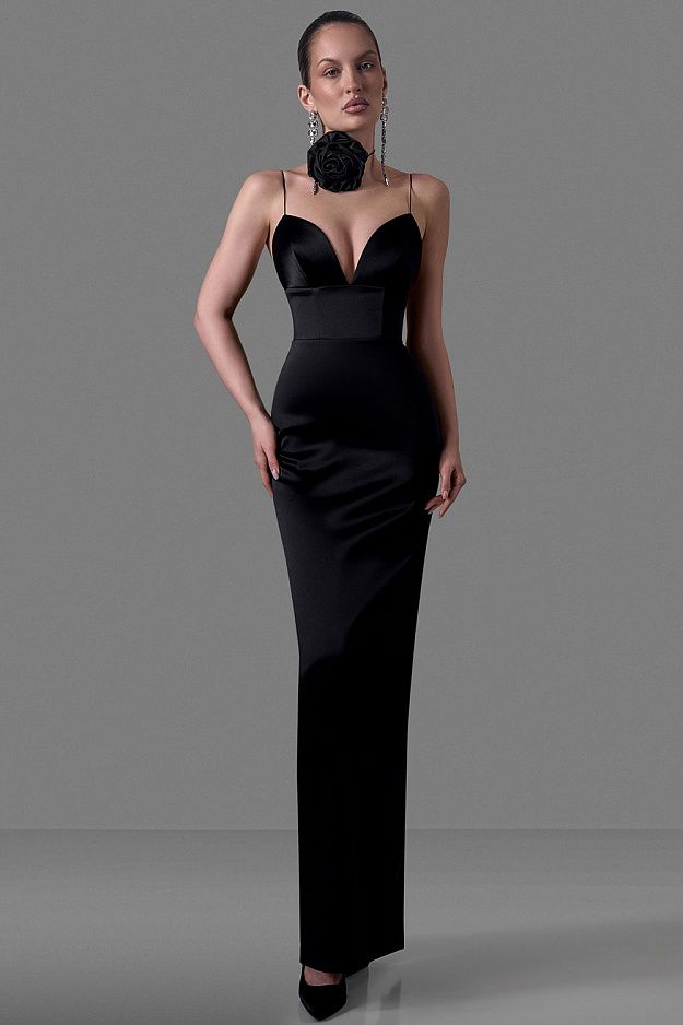 Элегантное платье-макси из плотного атласа с глубоким фигурным декольте. Тонкие бретели, приталенный силуэт, ровный удлинённый низ. Идеально для вечерних выходов и торжеств. Состав: 97% полиэстер, 3% спандекс, подкладка 95% полиэстер, 5% эластан