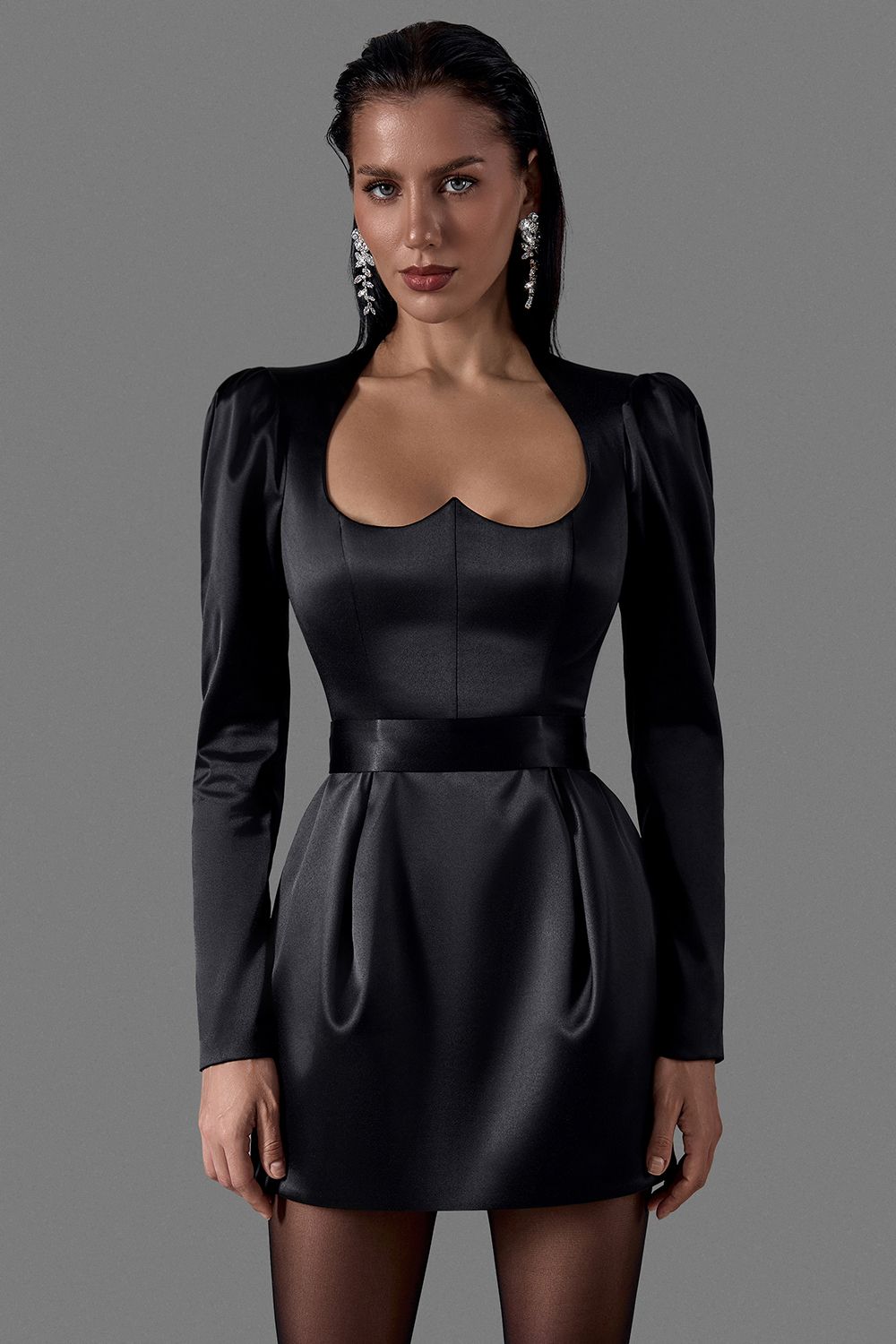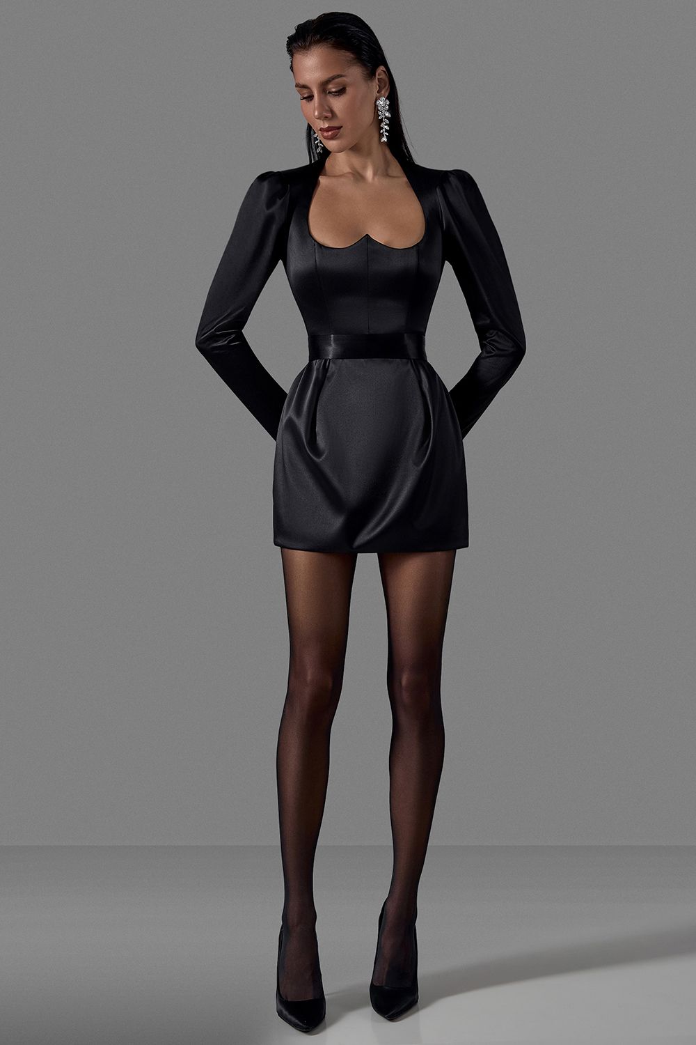 Эффектное мини-платье с архитектурным силуэтом, созданное для вечерних выходов. Приталенный корсетный лиф с фигурным вырезом подчёркивает линию декольте и талию. Акцентные плечи и длинные рукава добавляют образу модный характер. Платье выполнено из гладкой, плотной ткани с лёгким сатиновым блеском, которая хорошо держит форму и комфортна в носке. Состав: 63% полиэстер, 37% вискоза, Подкладка 95% полиэстер, 5% эластан