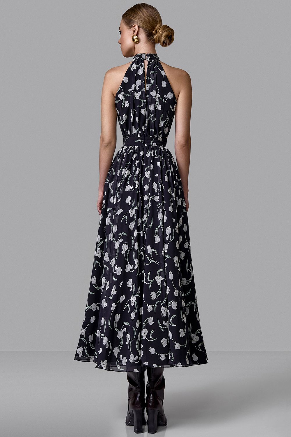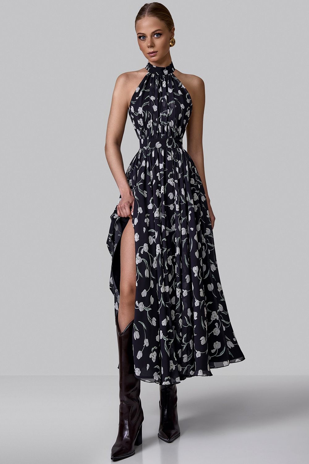 Воздушное платье миди, в котором сочетаются женственность и динамика движения. Верх с воротником-халтер изящно открывает плечи и подчеркивает линию шеи, создавая утонченный силуэт. Приталенная линия талии плавно переходит в расклешенную юбку, которая красиво раскрывается в движении. Цветочный принт добавляет образу свежести и романтичного настроения, делая модель универсальной для дневных выходов и особых случаев. Идеальное платье для летнего гардероба, отпусков и легких вечерних образов. Состав: 100% полиэстер, подкладка 97% полиэстер, 3% эластан