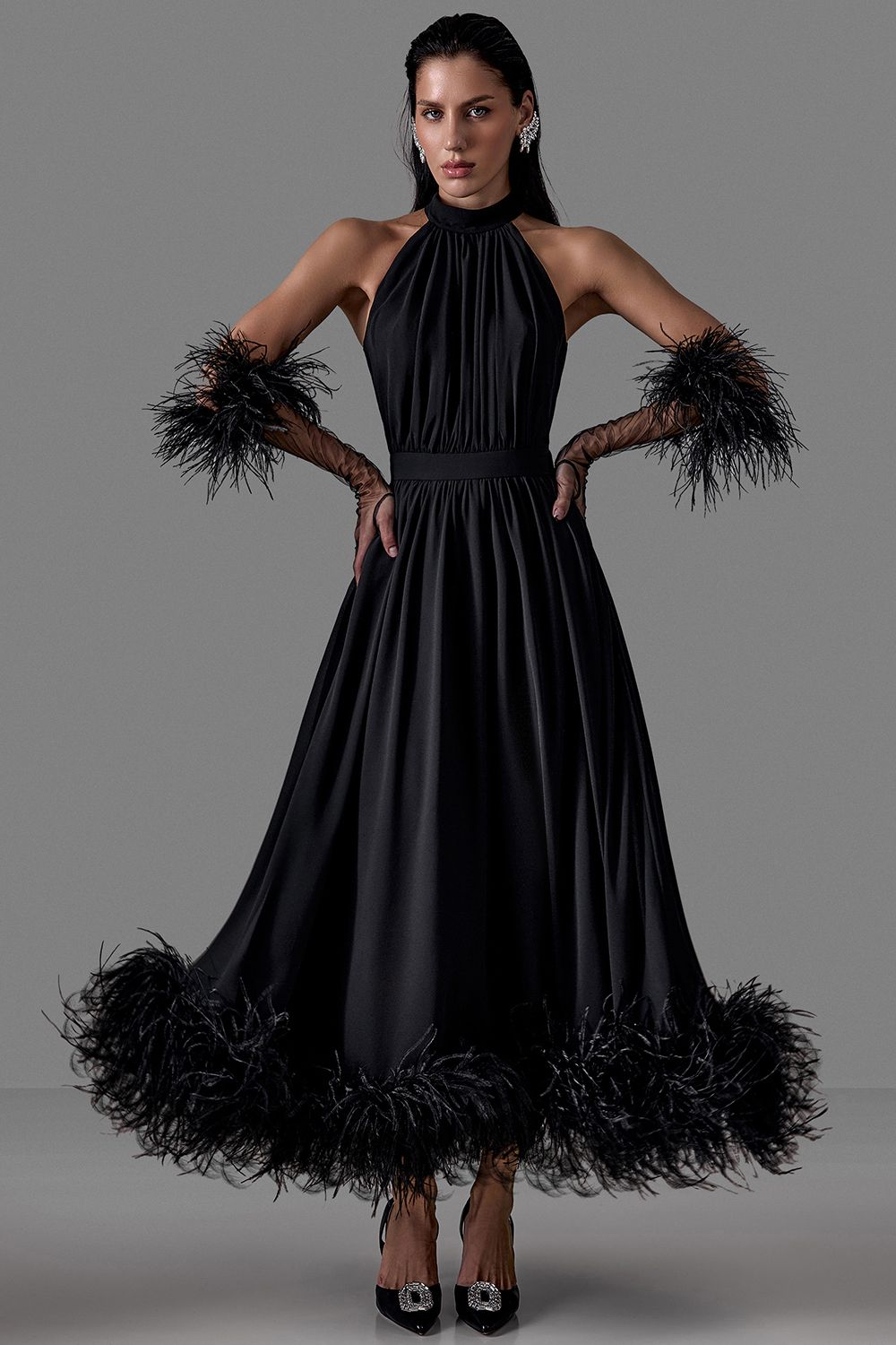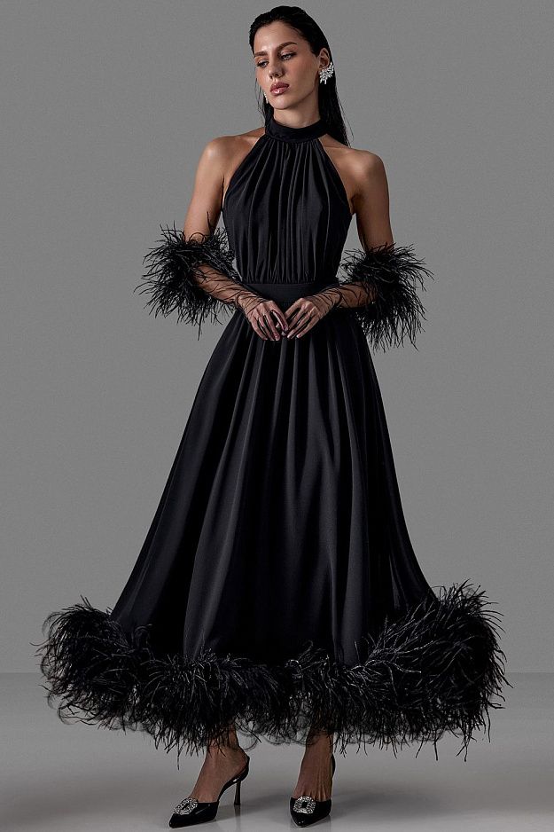 Эффектное платье-халтер с летящим силуэтом и роскошной перьевой отделкой по подолу и манжетам. Модель подчёркивает талию, мягко струится при движении и создаёт яркий, запоминающийся вечерний образ. Идеально для торжеств, съёмок и выходов, где хочется максимального вау-эффекта. Состав: 100% полиэстер, подкладка 97% полиэстер, 3% эластан