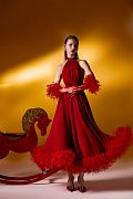 Эффектное платье-халтер с летящим силуэтом и роскошной перьевой отделкой по подолу и манжетам. Модель подчёркивает талию, мягко струится при движении и создаёт яркий, запоминающийся вечерний образ. Идеально для торжеств, съёмок и выходов, где хочется максимального вау-эффекта. Состав: 100% полиэстер, подкладка 97% полиэстер, 3% эластан
