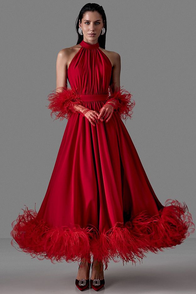 Эффектное платье-халтер с летящим силуэтом и роскошной перьевой отделкой по подолу и манжетам. Модель подчёркивает талию, мягко струится при движении и создаёт яркий, запоминающийся вечерний образ. Идеально для торжеств, съёмок и выходов, где хочется максимального вау-эффекта. Состав: 100% полиэстер, подкладка 97% полиэстер, 3% эластан