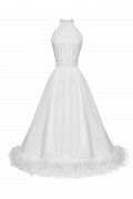 Эффектное платье-халтер с летящим силуэтом и роскошной перьевой отделкой по подолу и манжетам. Модель подчёркивает талию, мягко струится при движении и создаёт яркий, запоминающийся вечерний образ. Идеально для торжеств, съёмок и выходов, где хочется максимального вау-эффекта. Состав: 100% полиэстер, подкладка 97% полиэстер, 3% эластан
