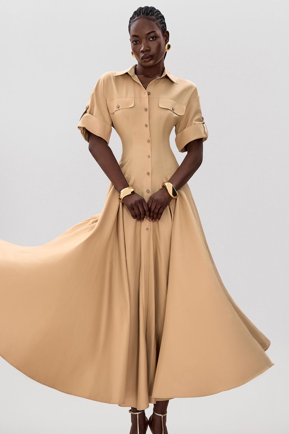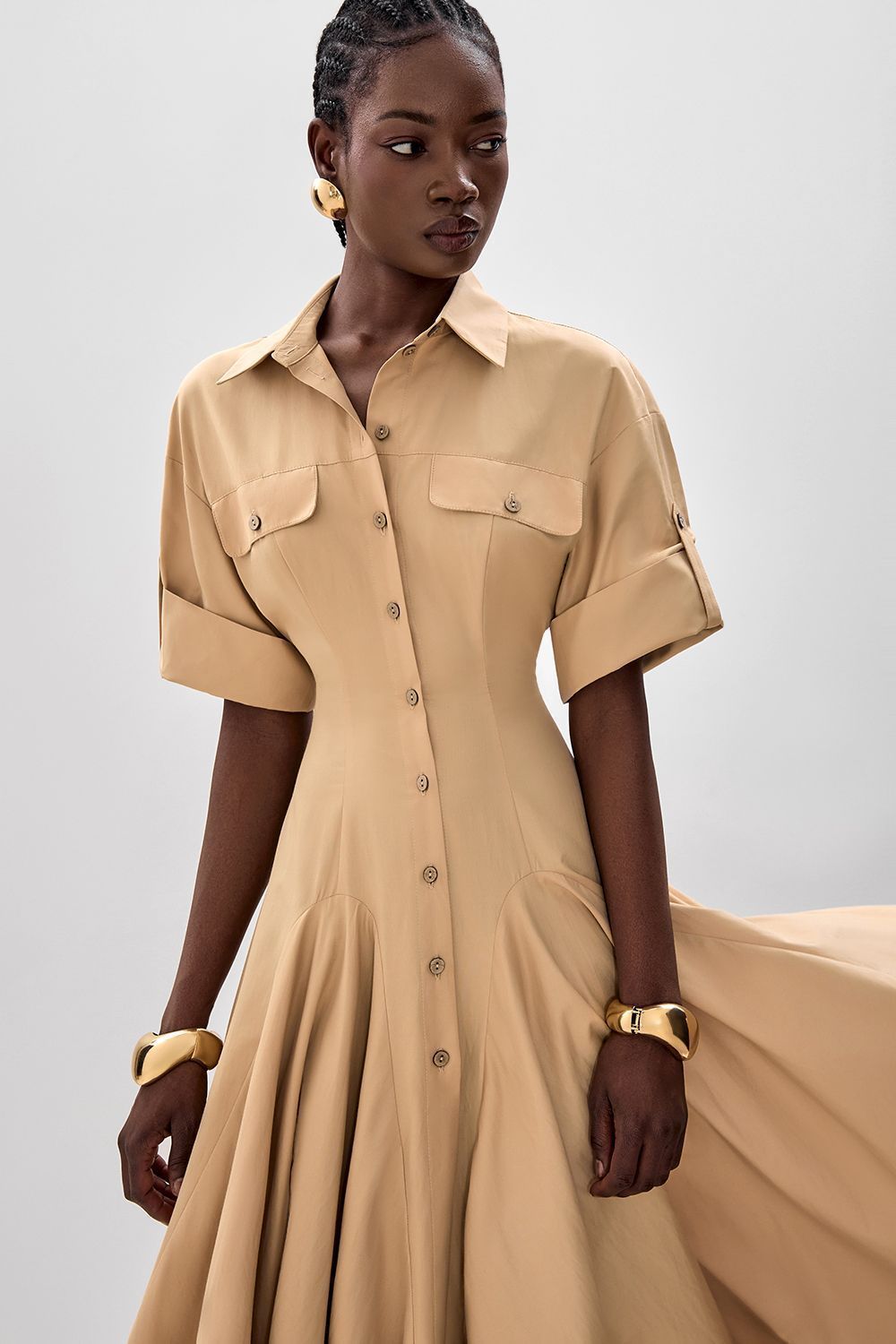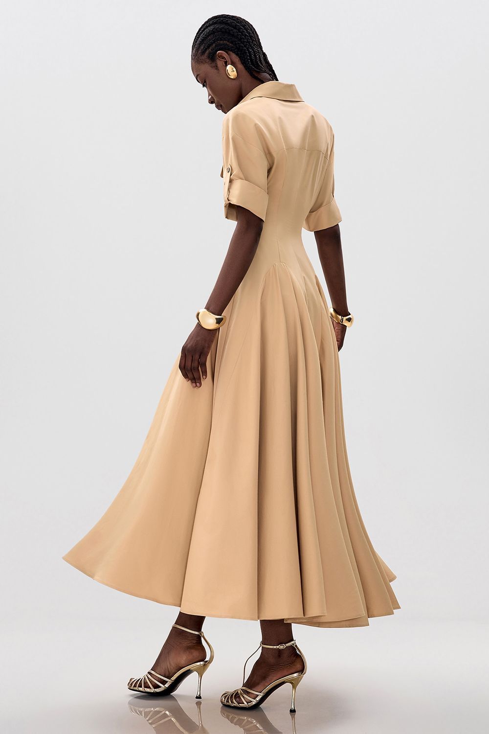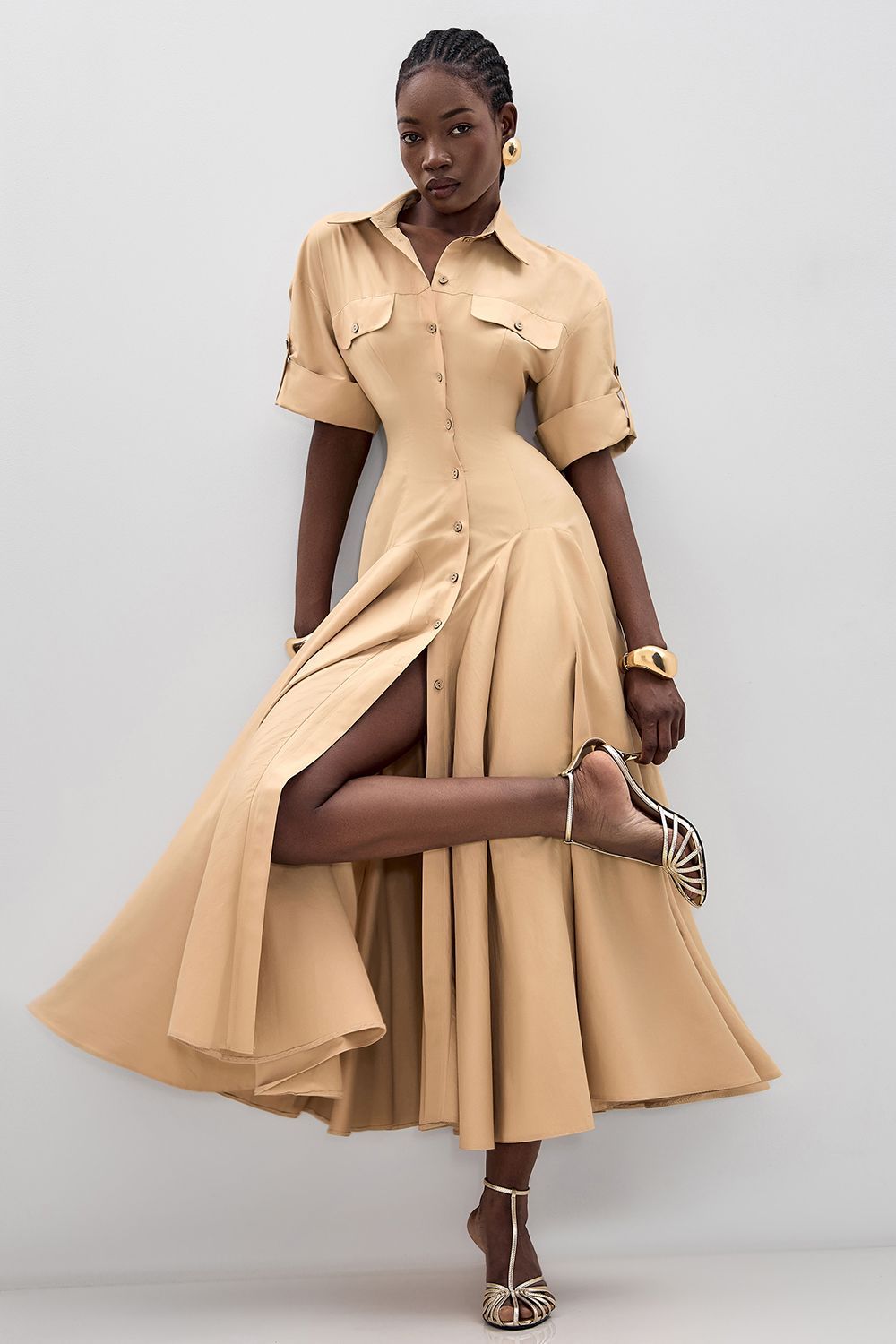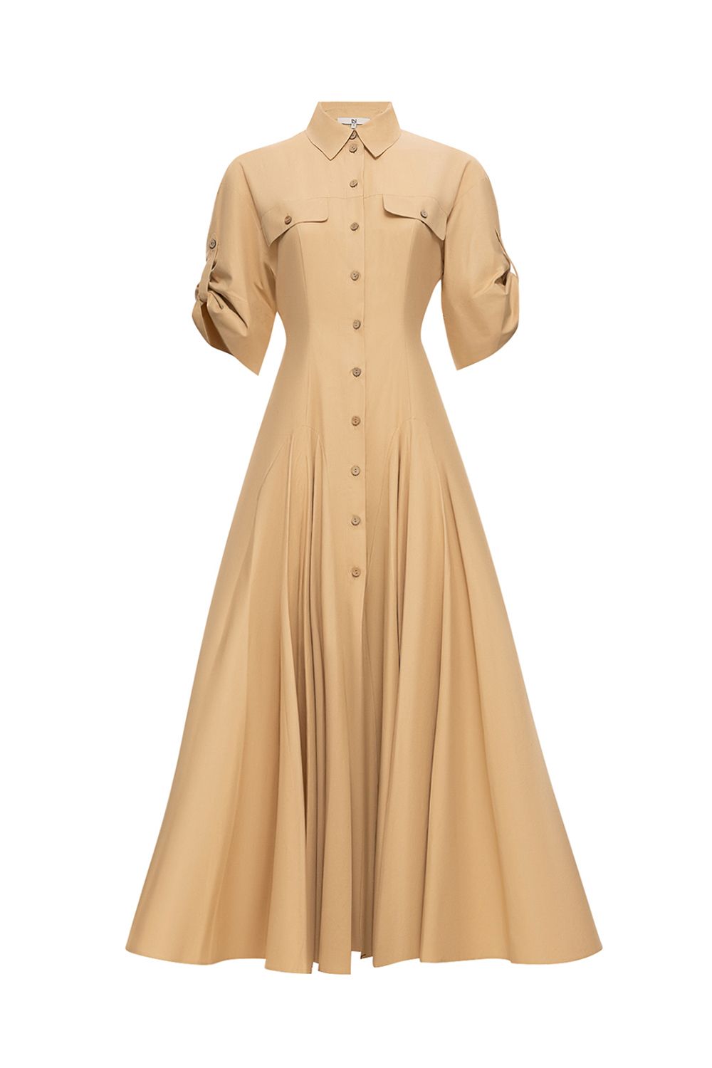 Платье рубашечного кроя с приталенной верхней частью и расклешенной юбкой миди длины. Такое сочетание создает утонченный и женственный силуэт. Имеет строгий воротник и застежку на пуговицы, которые идут по всей длине изделия. Длина: 131 см. (размер: s). Состав: 52% хлопок, 48% полиэстер.