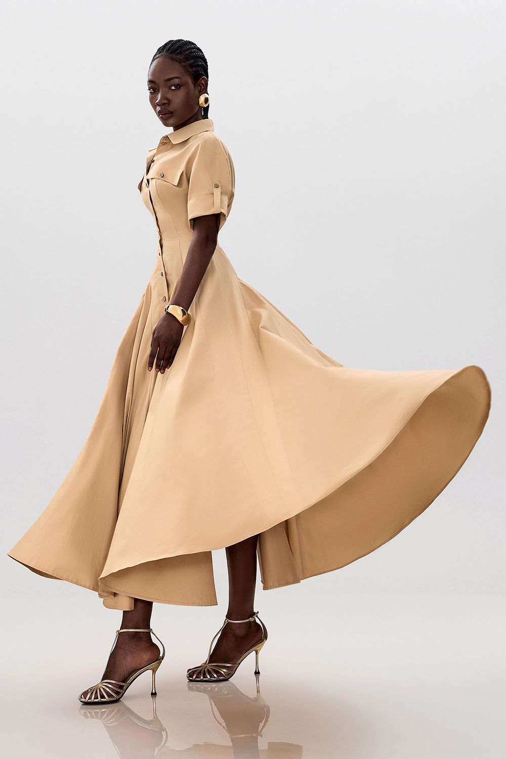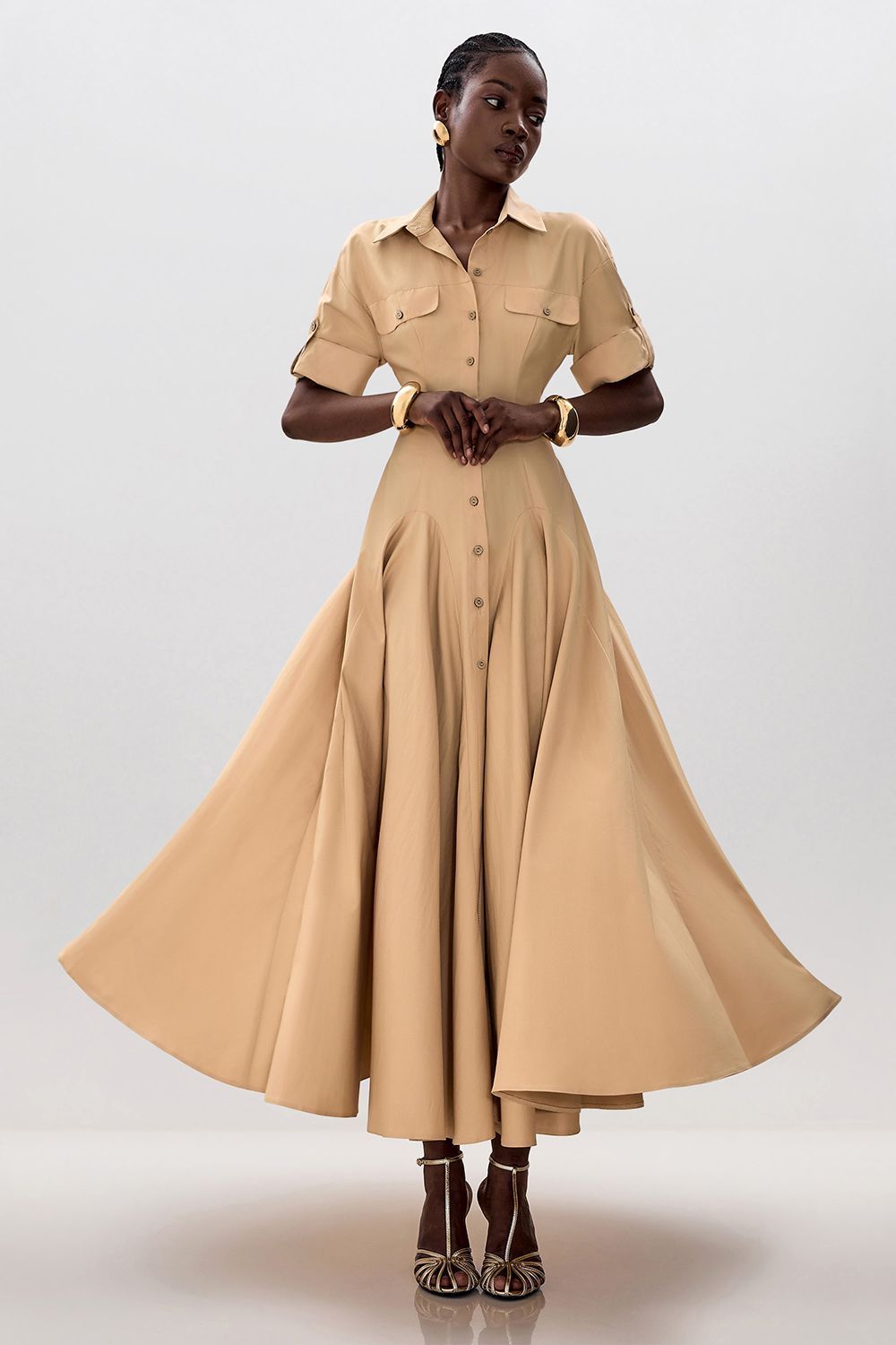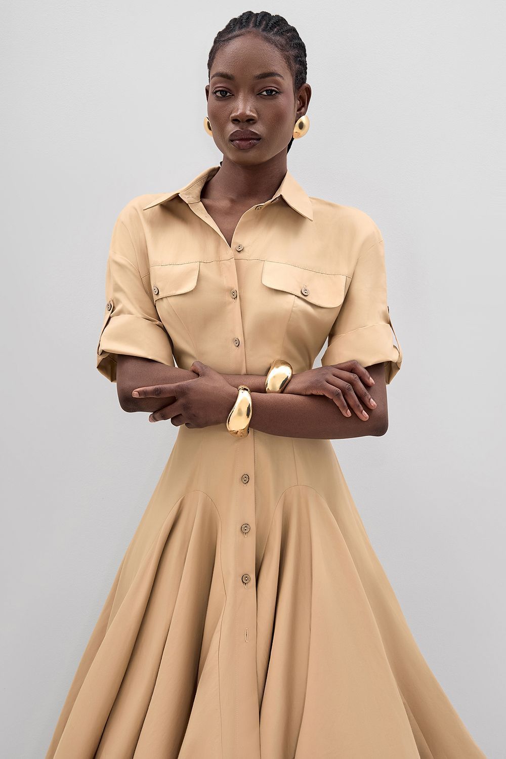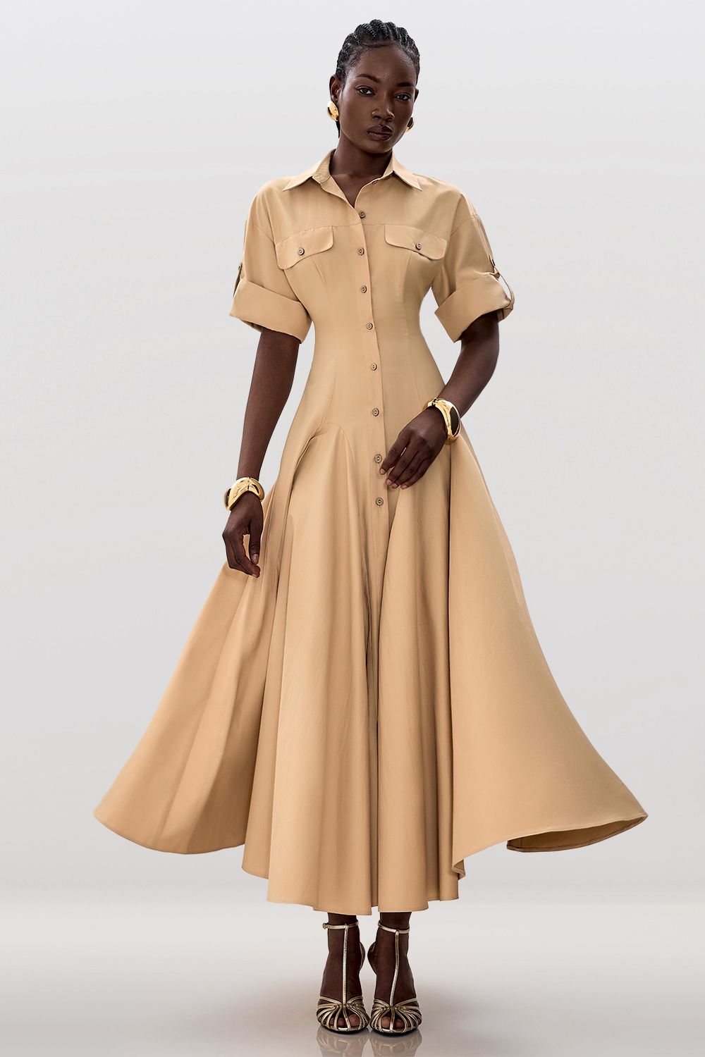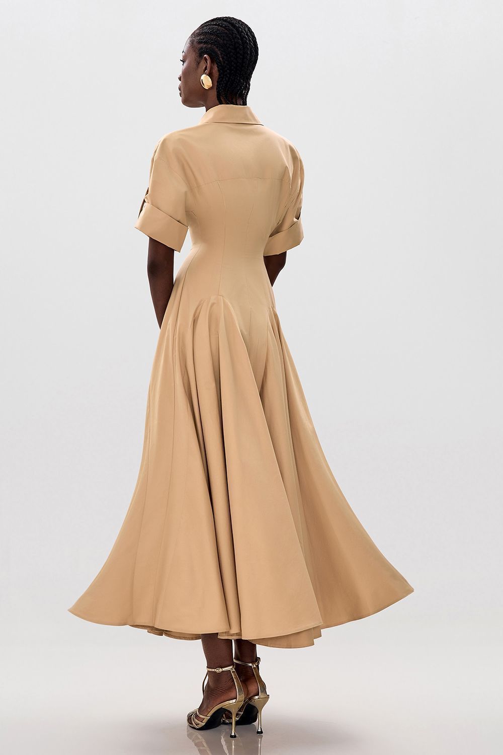 Платье рубашечного кроя с приталенной верхней частью и расклешенной юбкой миди длины. Такое сочетание создает утонченный и женственный силуэт. Имеет строгий воротник и застежку на пуговицы, которые идут по всей длине изделия. Длина: 131 см. (размер: s). Состав: 52% хлопок, 48% полиэстер.