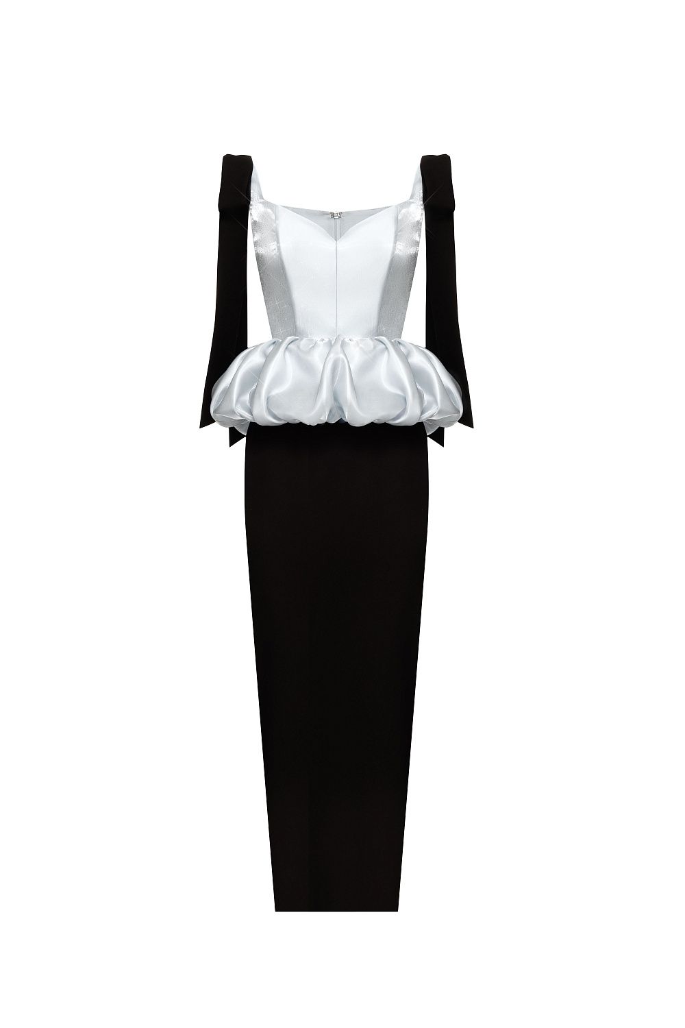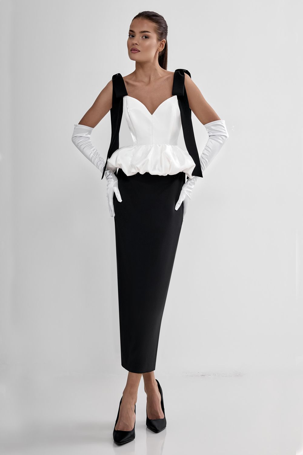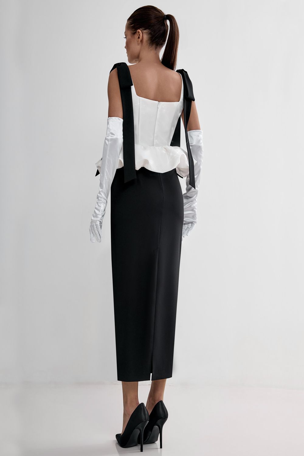 Праздничное платье длины миди с пышной баской на талии, которую можно при необходимости снять и оставить двухцветное платье-футляр, идеально сидящее по фигуре. Лиф изделия выполнен из ткани с деликатным блеском и украшен черными бантами на бретелях. Платье идеально подходит для праздничного вечера, а без баски может стать деталью вашего повседневного гардероба. Состав: верх 100% полиэстер, низ 100% полиэстер. Подкладка: 95% полиэстер, 5% эластан.