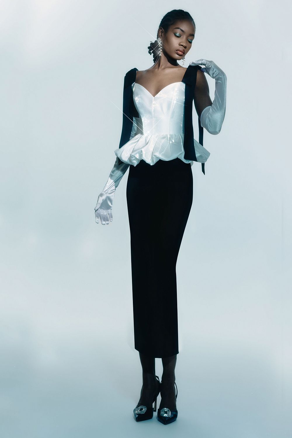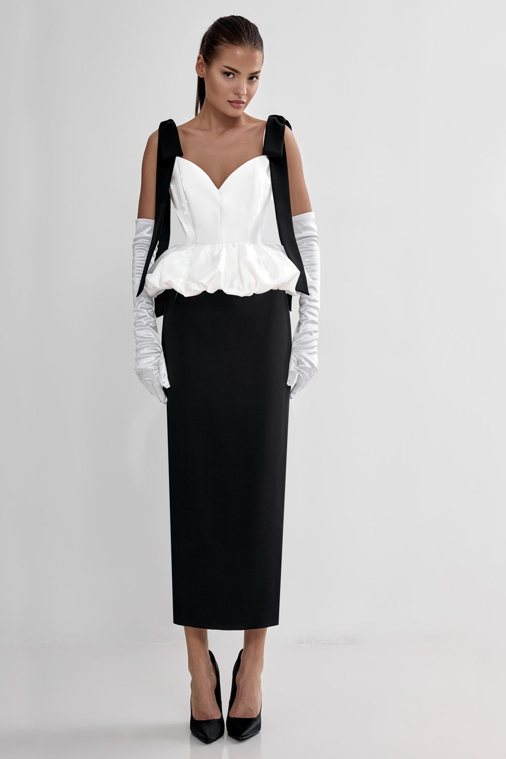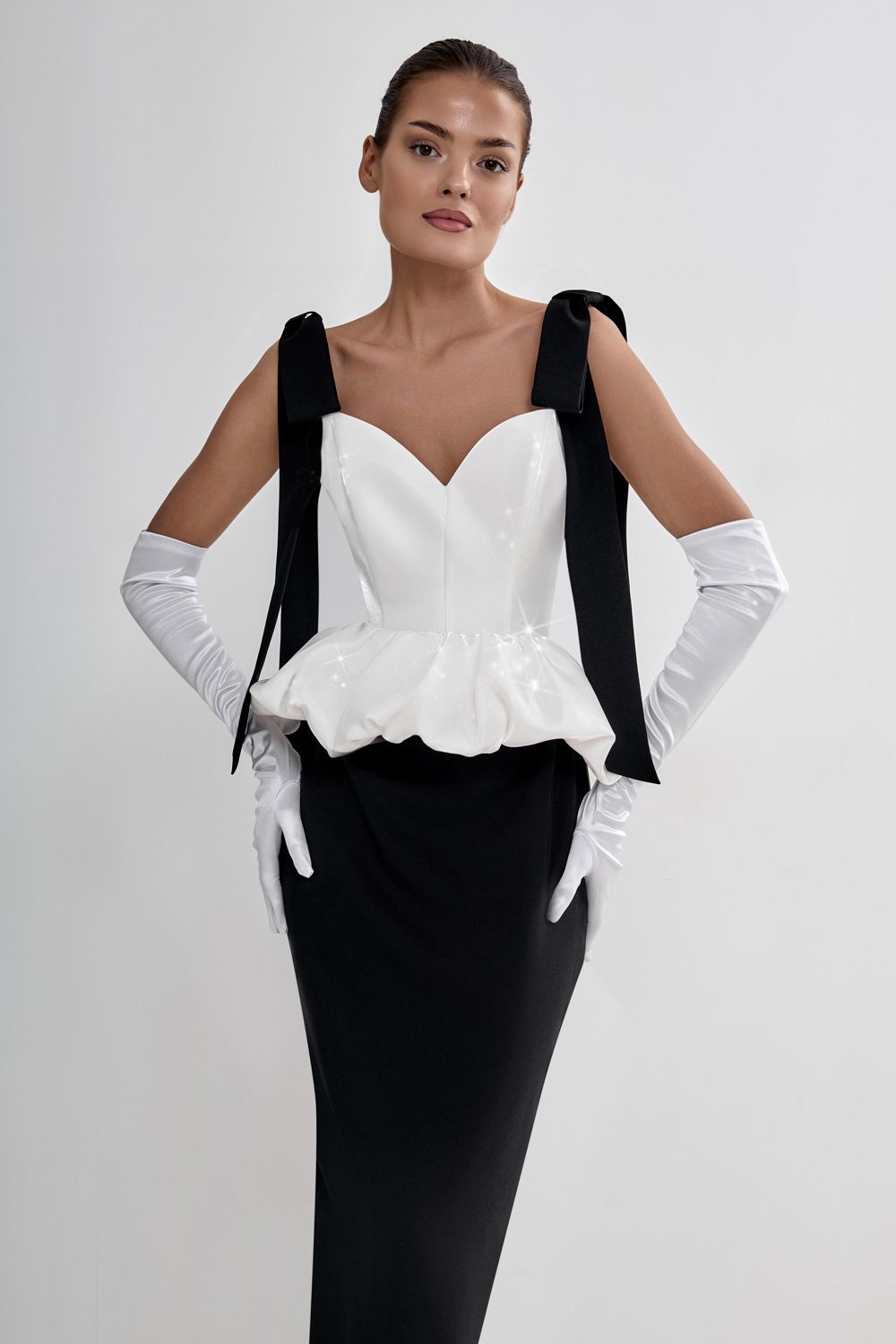 Праздничное платье длины миди с пышной баской на талии, которую можно при необходимости снять и оставить двухцветное платье-футляр, идеально сидящее по фигуре. Лиф изделия выполнен из ткани с деликатным блеском и украшен черными бантами на бретелях. Платье идеально подходит для праздничного вечера, а без баски может стать деталью вашего повседневного гардероба. Состав: верх 100% полиэстер, низ 100% полиэстер. Подкладка: 95% полиэстер, 5% эластан.