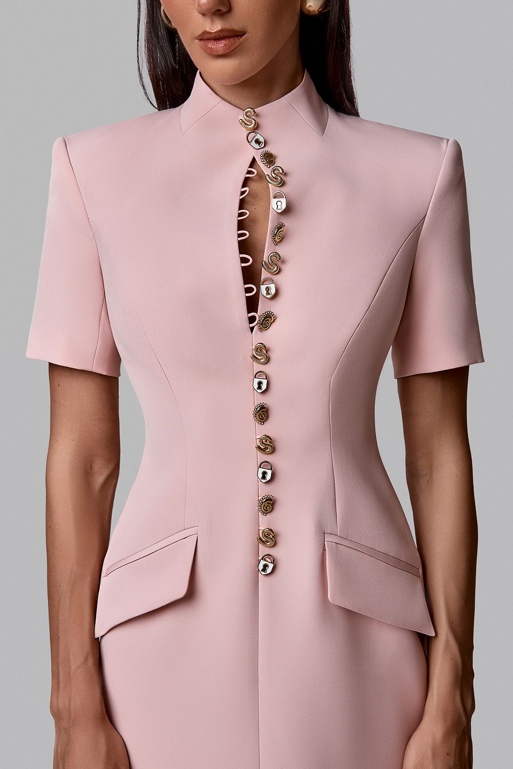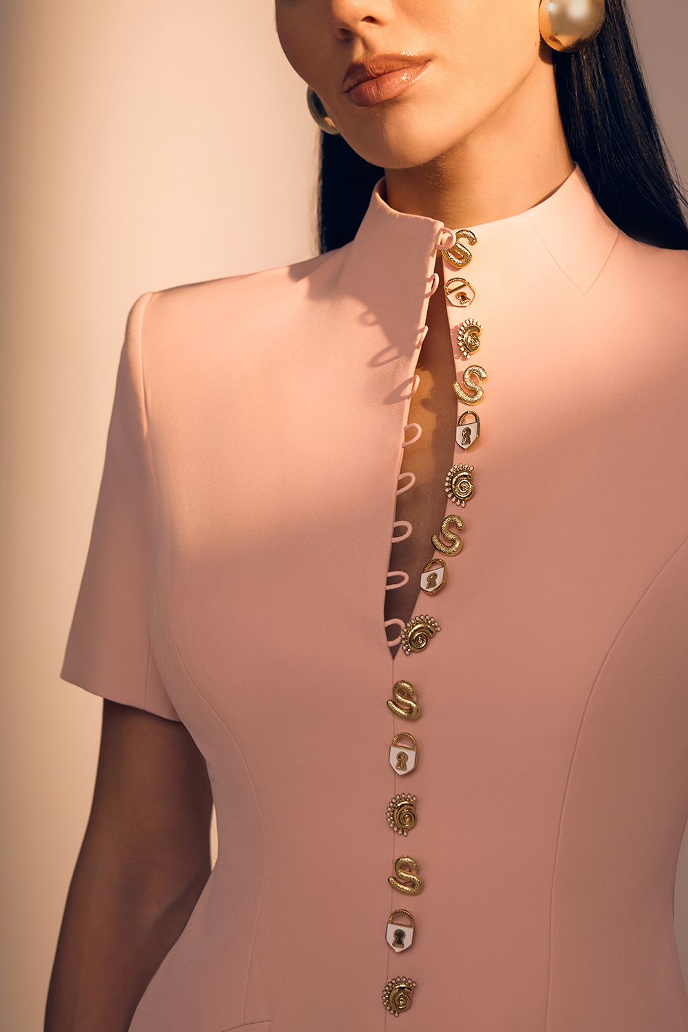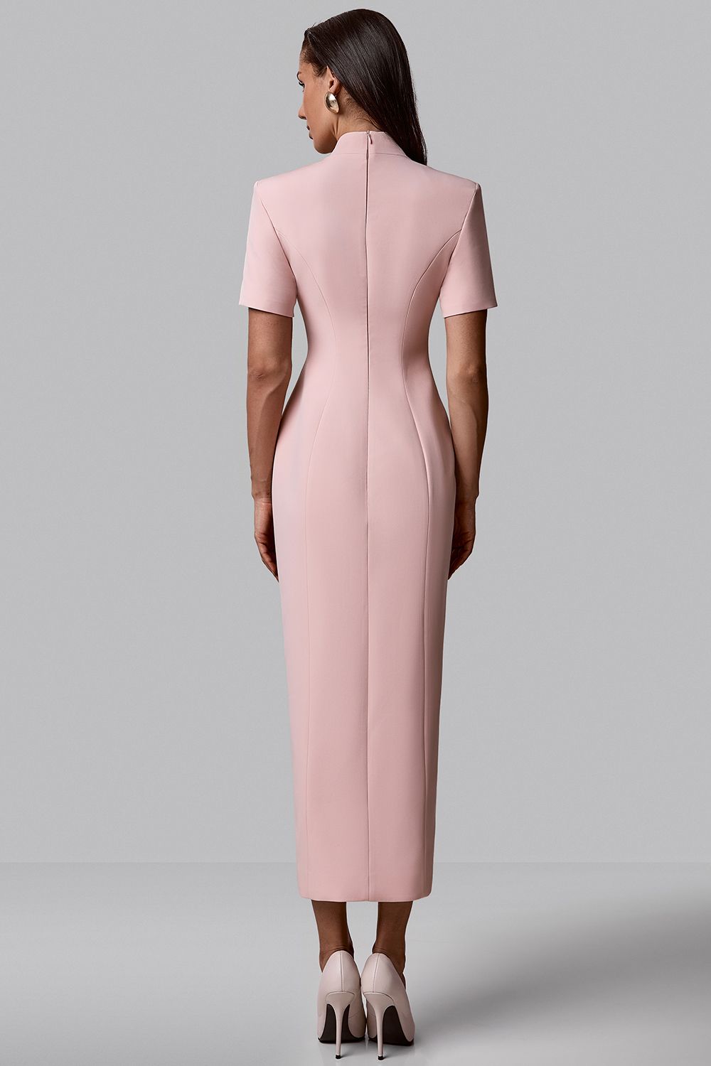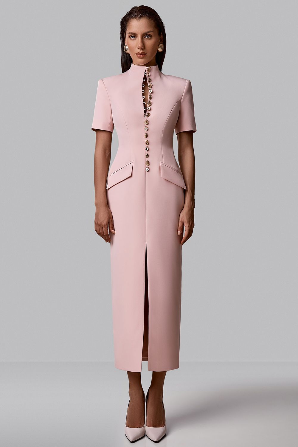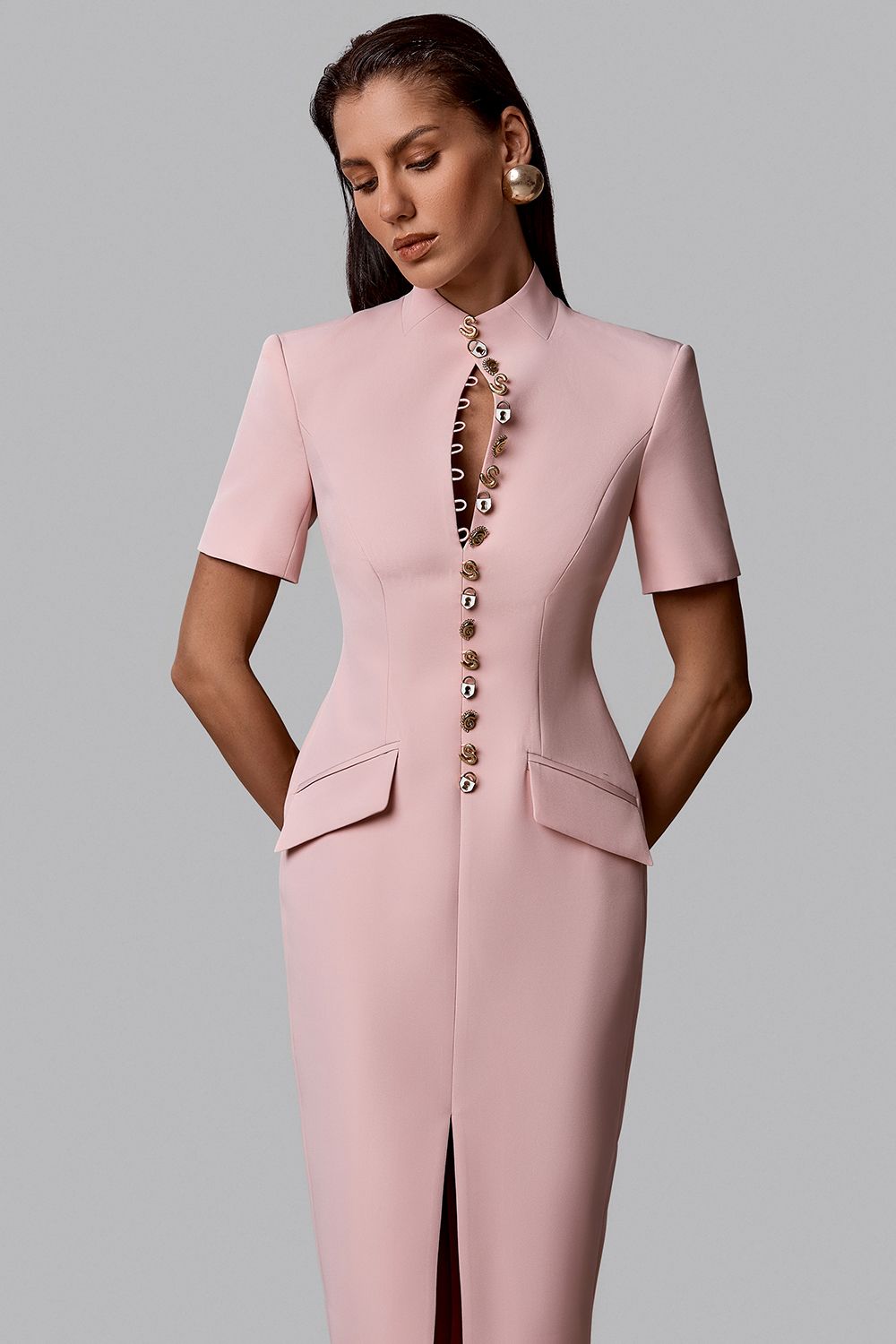 Лаконичное платье-футляр миди длины с приталенным силуэтом. Вертикальная декоративная планка с оригинальными пуговицами формирует вытянутый и собранный образ. Воротник-стойка и короткий рукав добавляют строгости и современной архитектурности. Универсальный вариант для делового и вечернего гардероба. Длина платья (размер: S): 124 см. Состав: 72% полиэстер, 23% вискоза, 5% эластан, Подклад 95% полиэстер, 5% эластан
