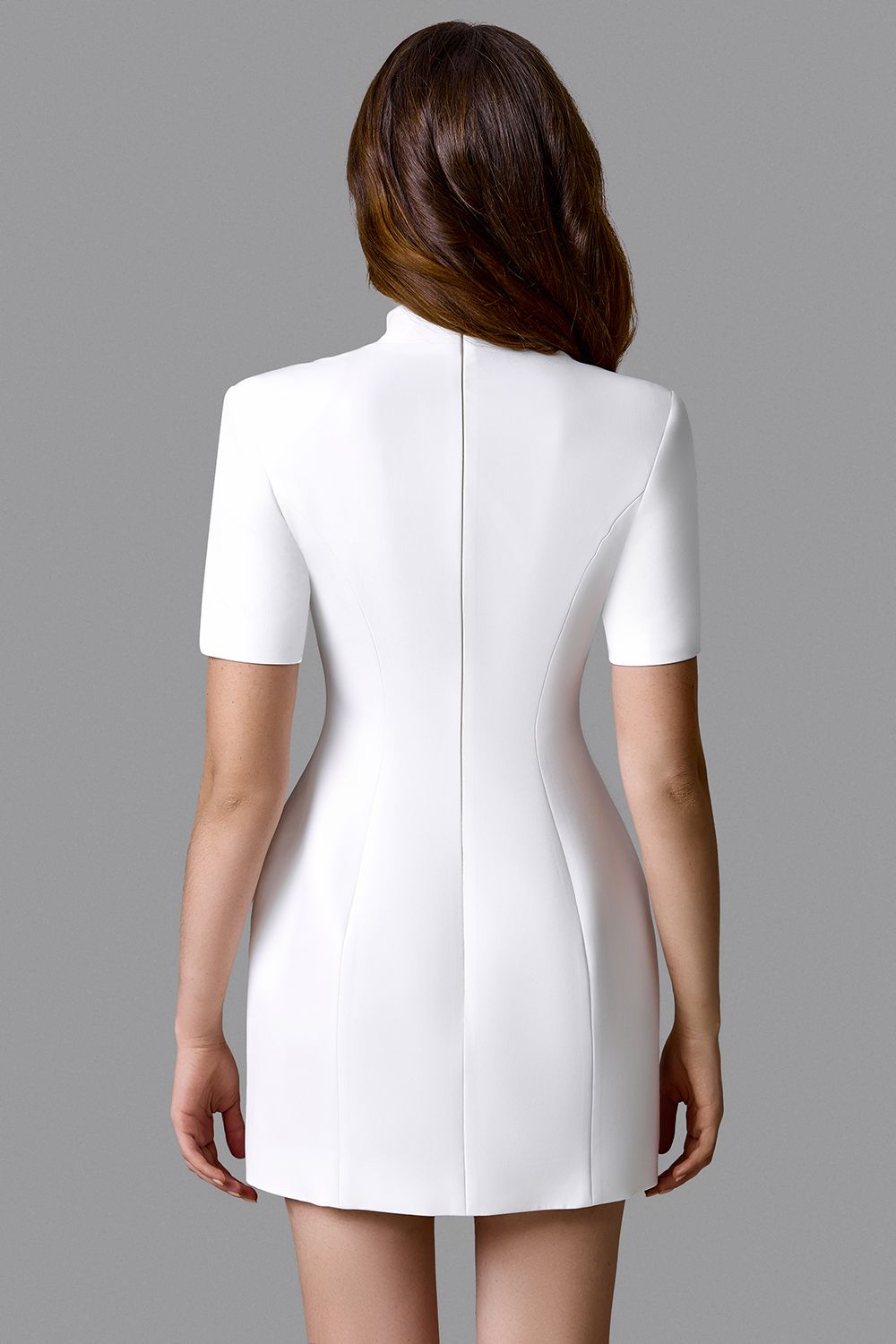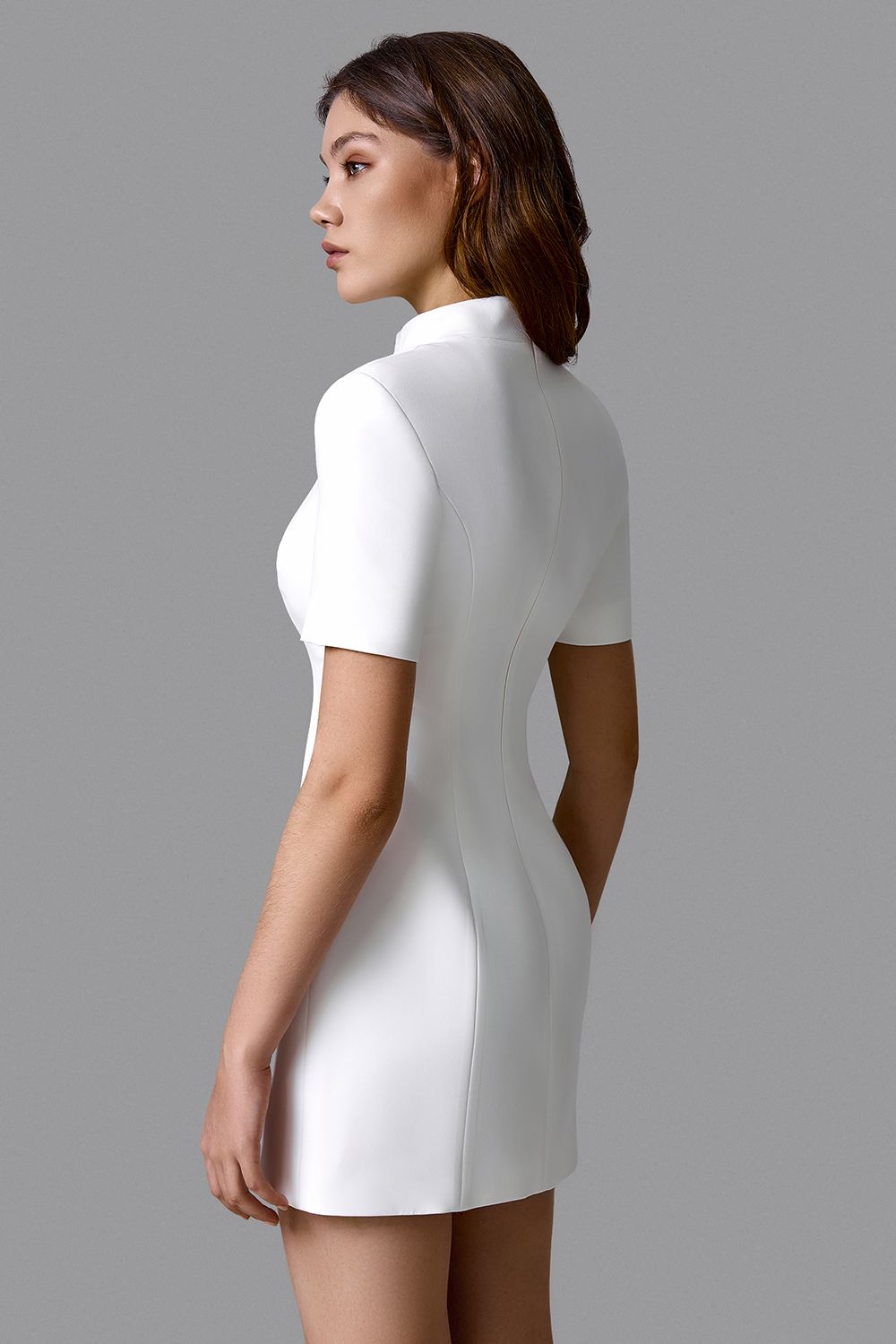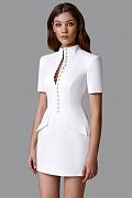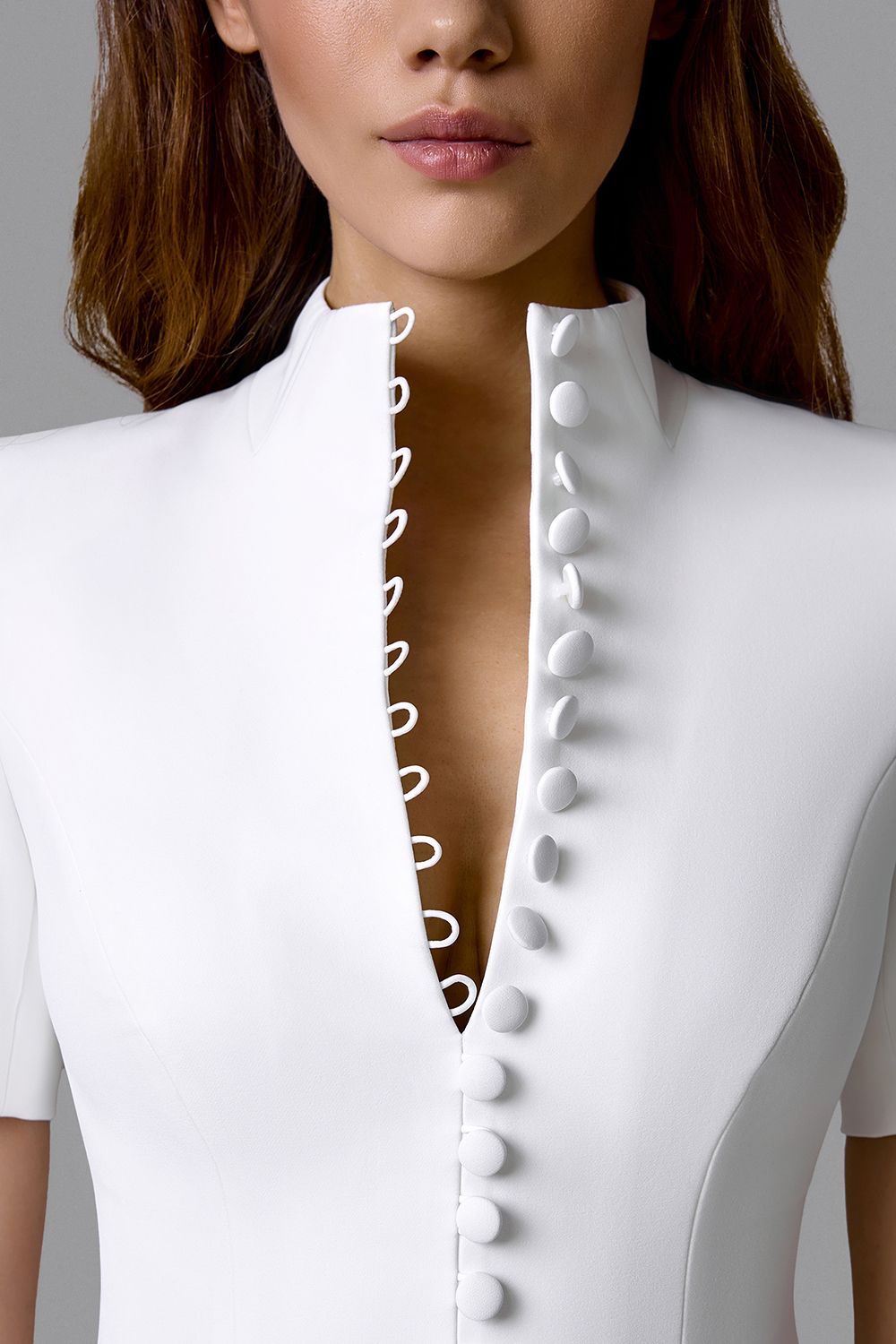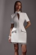 Приталенная линия подчёркивает талию, а воротник-стойка и вертикальный ряд декоративных пуговиц добавляют образу графичность. Короткий рукав делает модель универсальной для разных сезонов. Лаконичные клапаны карманов завершают аккуратный, безупречный tailoring. Подходит как для вечерних выходов, так и для элегантного городского образа.. Состав: 72% полиэстер, 23% вискоза, 5% эластан, Подклад 95% полиэстер, 5% эластан