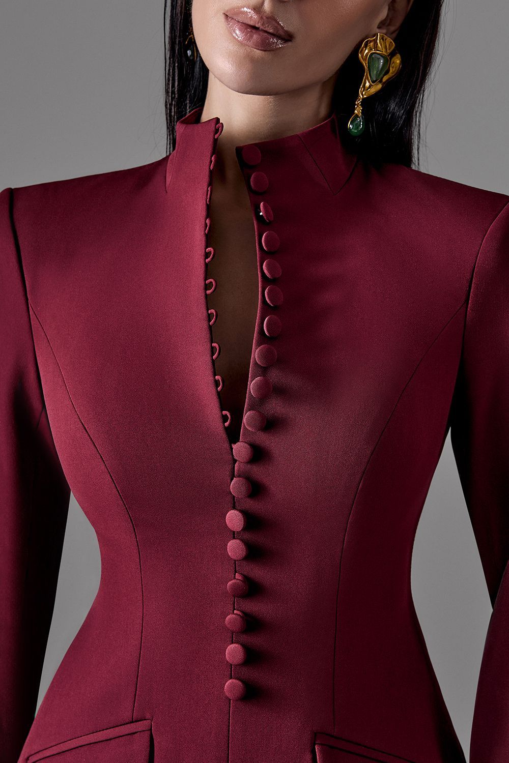 Элегантное мини-платье строгого кроя с длинным рукавом. Модель выполнена в стиле жакета с выразительными плечами, приталенным силуэтом и имитацией клапанов карманов. Визуальный акцент — глубокий V-образный вырез с оригинальной застежкой на ряд обтянутых пуговиц. Идеальный выбор для вечернего выхода или стильного коктейльного образа. Длина платья: 80,5 (размер: S). Состав: 71% полиэстер, 23% вискоза, 6% эластан, Подклад 95% полиэстер 5% эластан