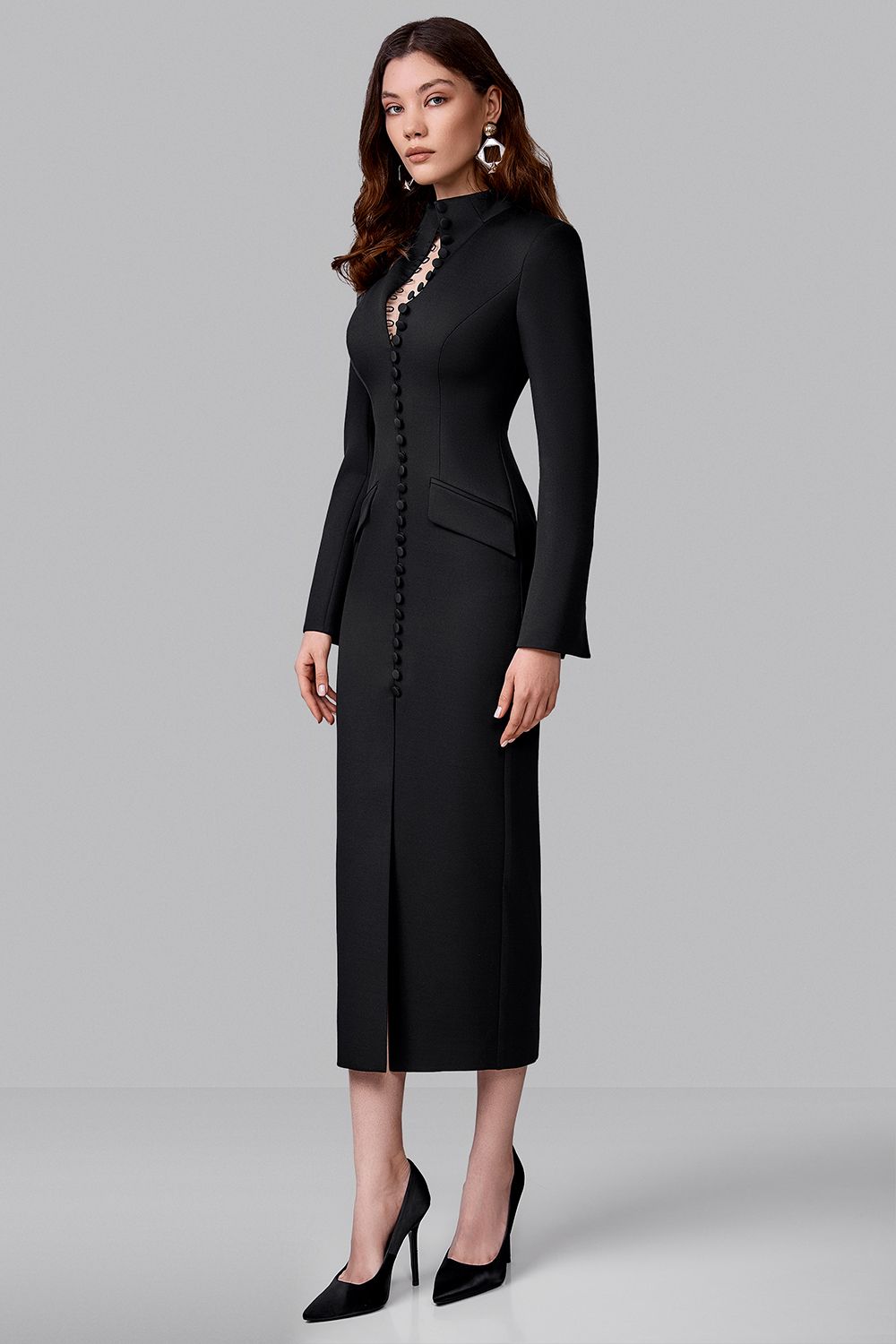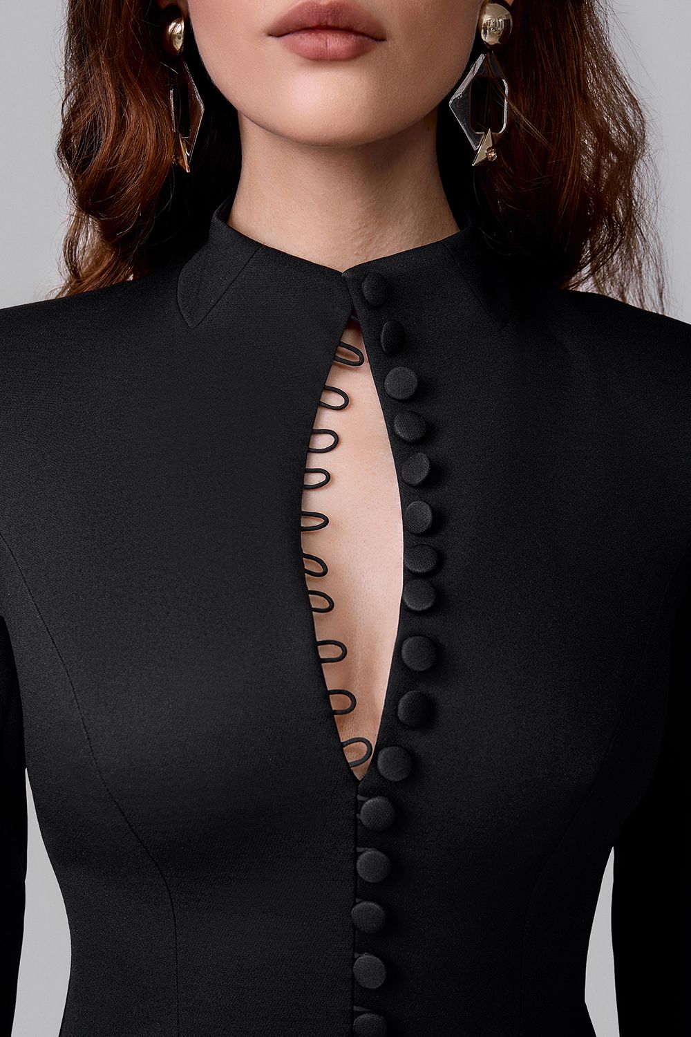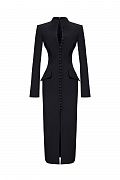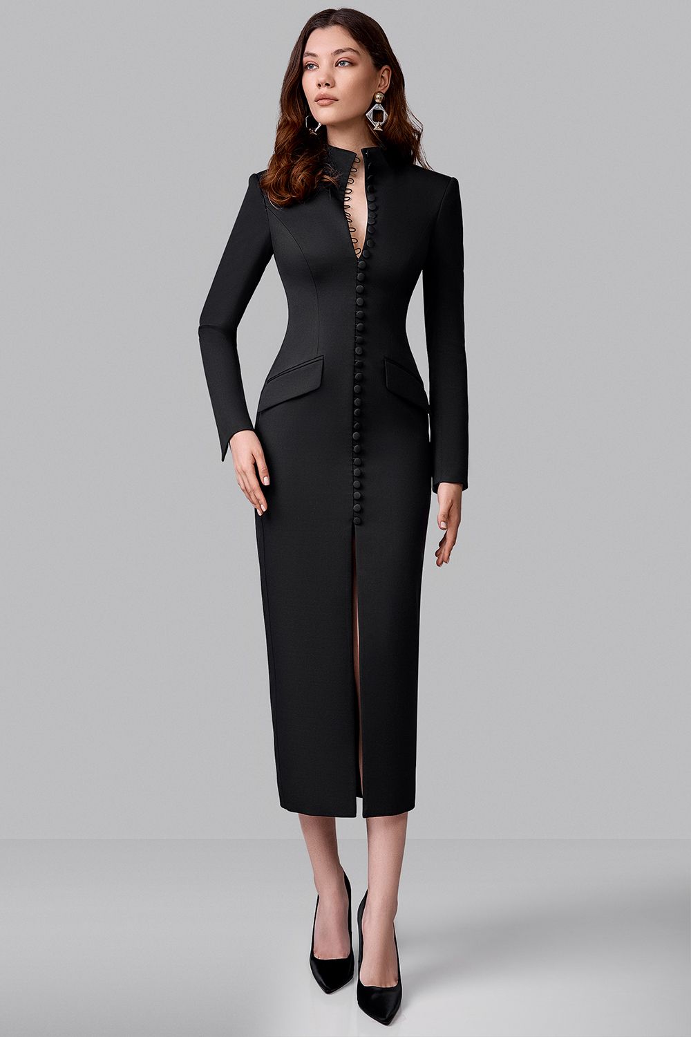 Элегантное платье миди приталенного силуэта, подчёркивающее фигуру и создающее выразительный, вытянутый образ. Чёткий крой и акцент на линии талии формируют архитектурный силуэт в духе современной классики. Вертикальная линия декоративных пуговиц визуально вытягивает силуэт, добавляя образу строгость и утончённость. Высокий ворот и лаконичный дизайн делают модель универсальной — от деловых выходов до вечерних мероприятий. Платье, в котором сочетаются сила, женственность и безупречная посадка. Состав: 71% полиэстер, 23% вискоза, 6% эластан, Подклад 95% полиэстер 5% эластан