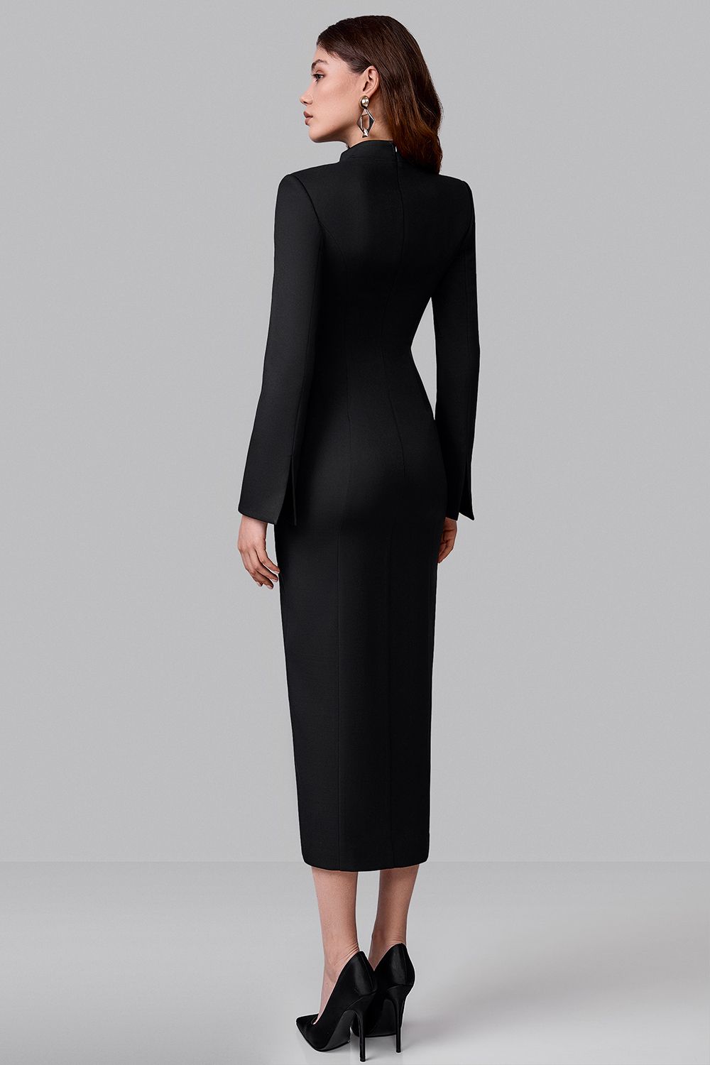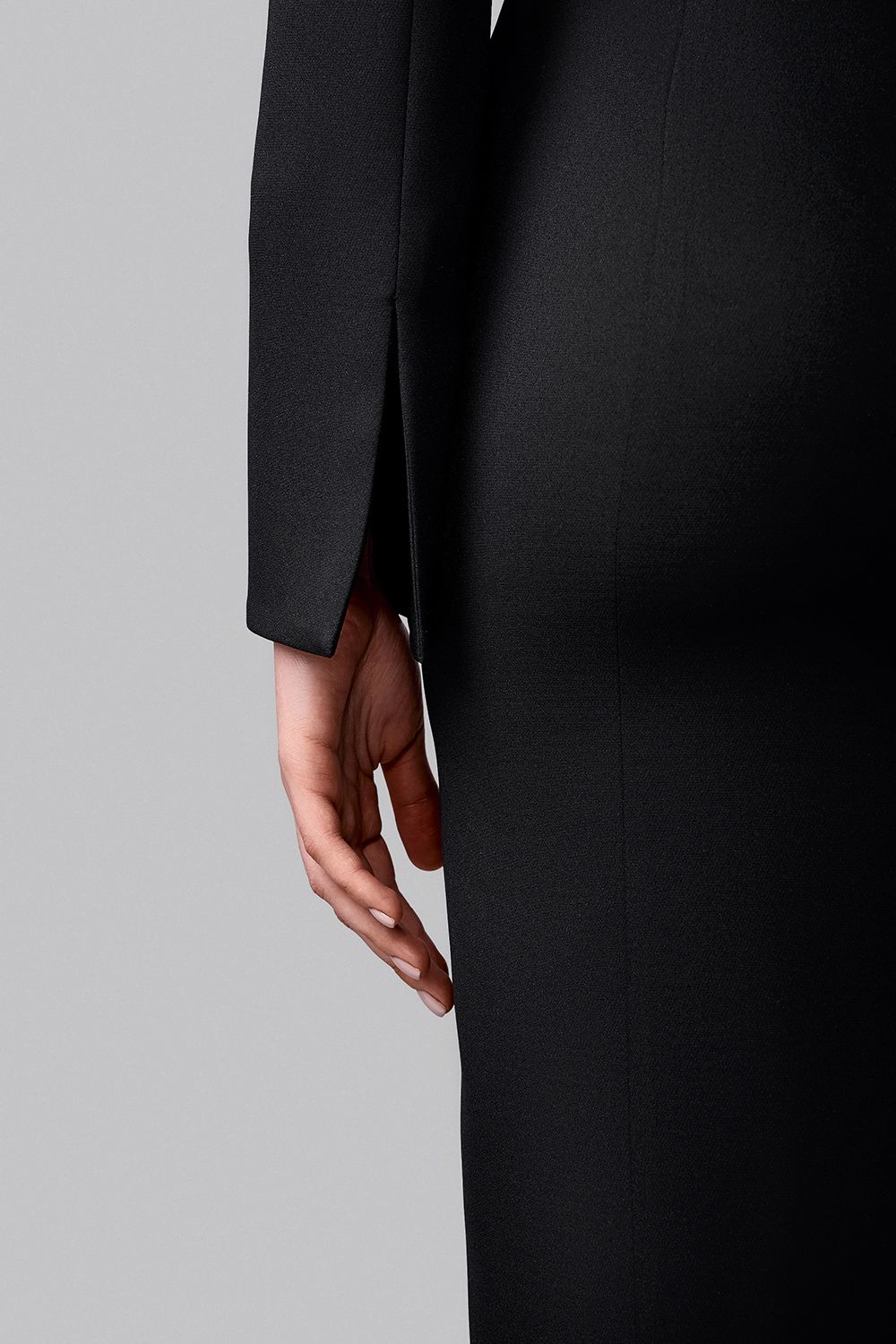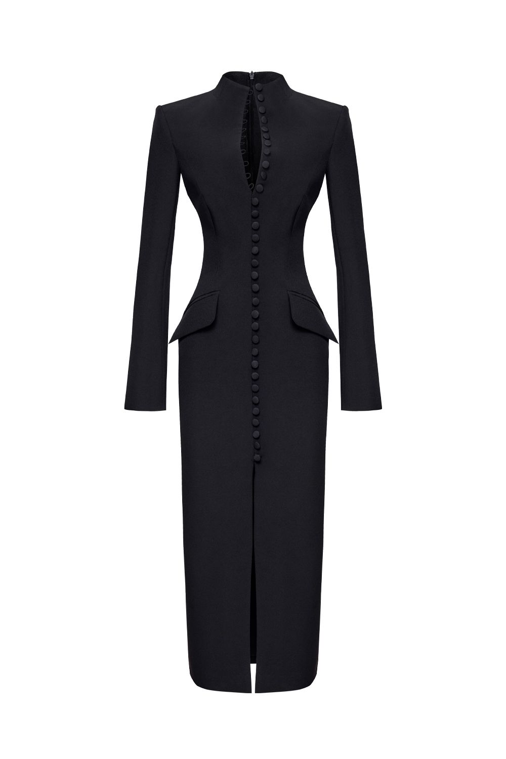 Элегантное платье миди приталенного силуэта, подчёркивающее фигуру и создающее выразительный, вытянутый образ. Чёткий крой и акцент на линии талии формируют архитектурный силуэт в духе современной классики. Вертикальная линия декоративных пуговиц визуально вытягивает силуэт, добавляя образу строгость и утончённость. Высокий ворот и лаконичный дизайн делают модель универсальной — от деловых выходов до вечерних мероприятий. Платье, в котором сочетаются сила, женственность и безупречная посадка. Состав: 71% полиэстер, 23% вискоза, 6% эластан, Подклад 95% полиэстер 5% эластан