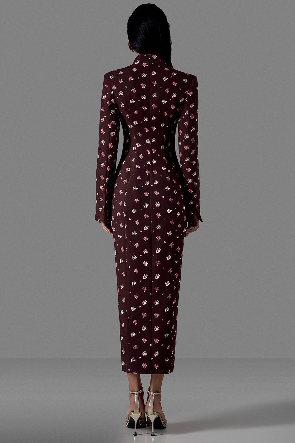 Платье-футляр с архитектурным силуэтом, подчёркивающим линию талии и фигуру. Модель выполнена из плотной костюмной ткани с эксклюзивным цветочным принтом, который добавляет образу утончённость и характер