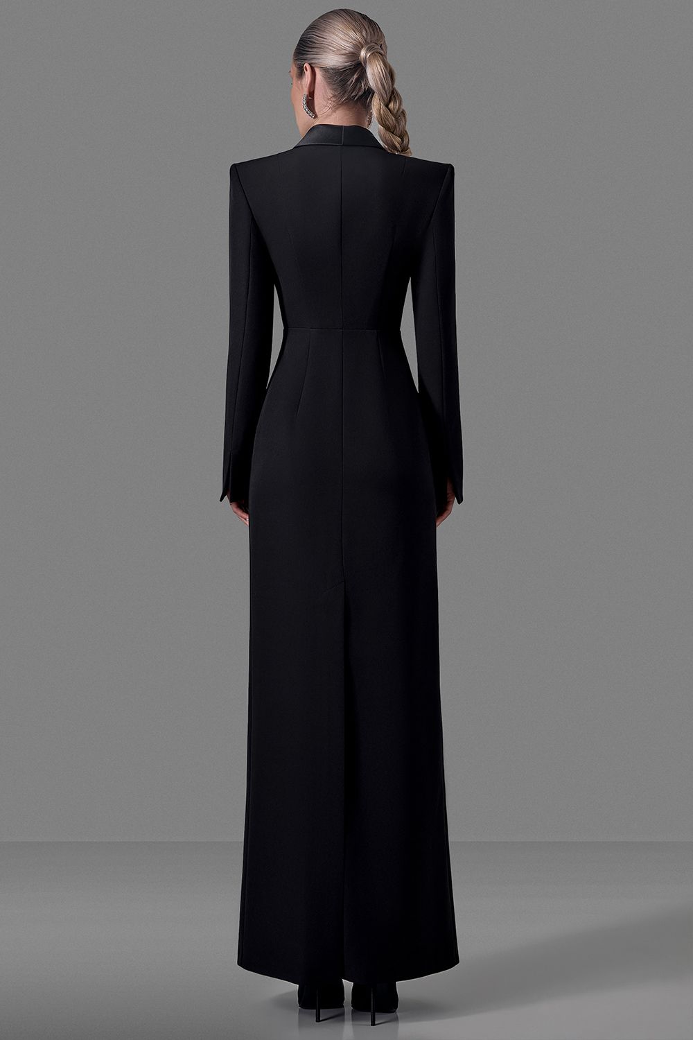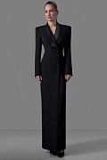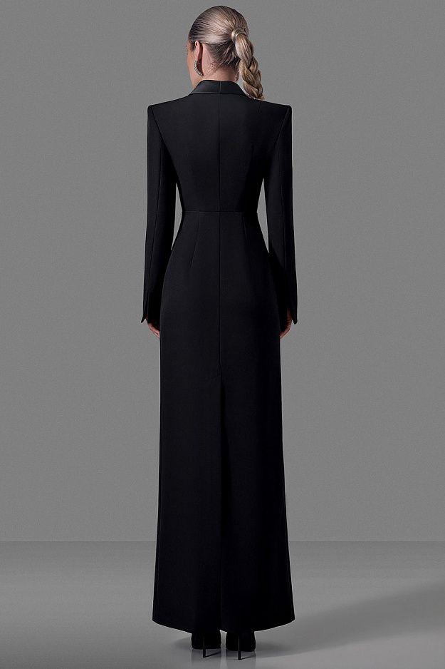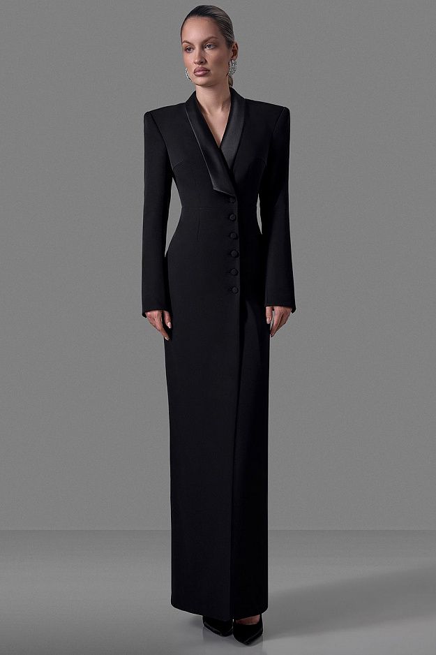 Элегантное платье-смокинг, идеальный выбор для торжественных выходов и особых событий. Модель подчёркивает силуэт благодаря безупречному крою: акцентированная линия плеч, глубокий V-вырез с мягко скульптурированным лацканом и утончённый приталенный корпус формируют изящную «песочную» фигуру. Состав: 67% полиэстер, 29% вискоза, 4% эластан; подкладка: 95% полиэстер, 5% эластан