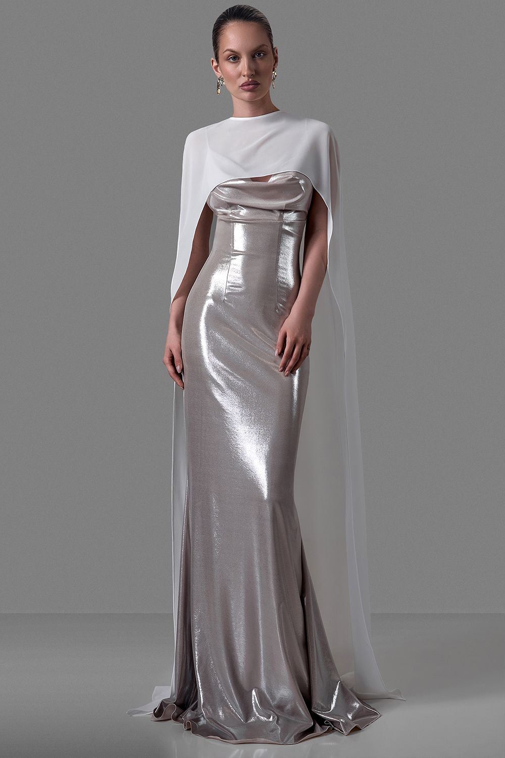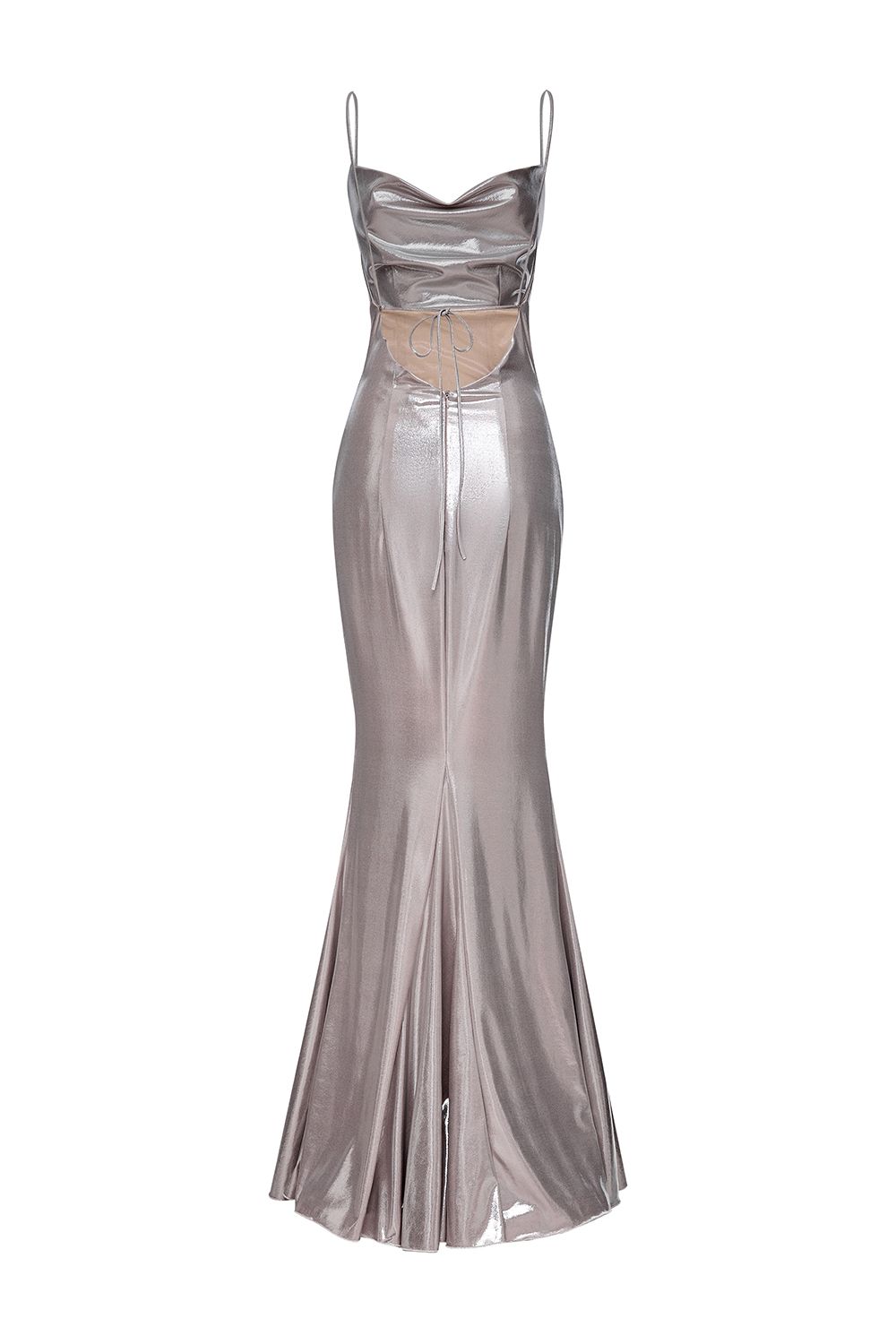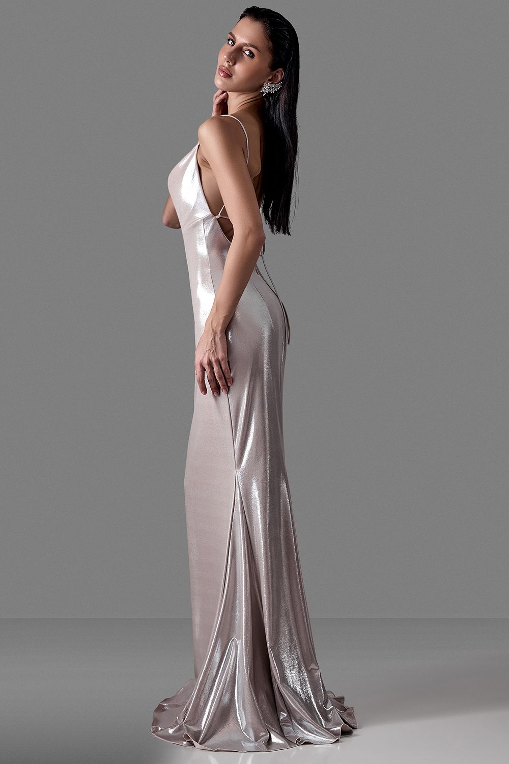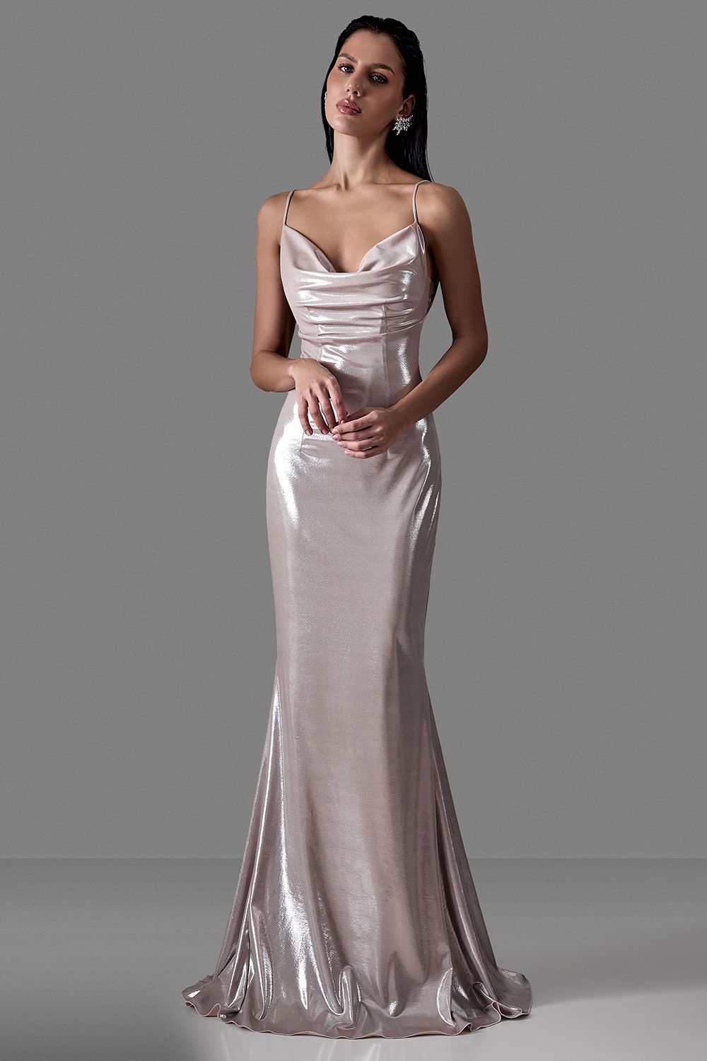 Модель с мягким драпированным лифом и тонкими бретелями, которые эффектно перекрещиваются на спине и регулируются завязками. Акцент на открытой спине и приталенном силуэте, плавно переходящем в расклёшенный подол. Ткань с глянцевым блеском подчеркивает каждое движение и создаёт лёгкое свечение при любом освещении. Идеальный выбор для вечернего выхода, коктейльной вечеринки или торжественного события. Состав: 67% полиэстер, 30% вискоза, 3% эластан; подкладка 100% нейлон