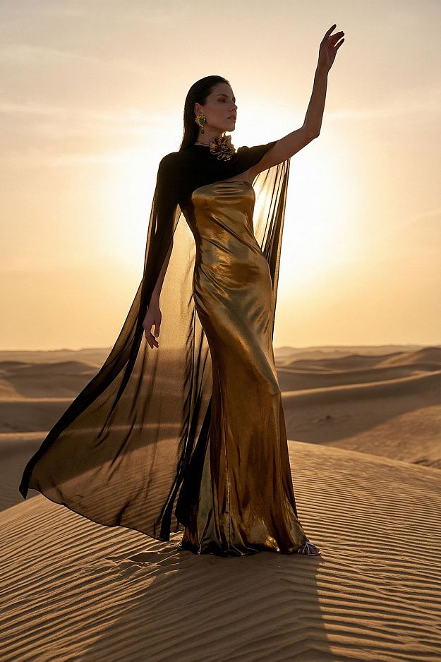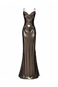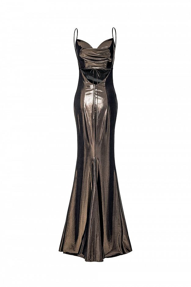 Модель с мягким драпированным лифом и тонкими бретелями, которые эффектно перекрещиваются на спине и регулируются завязками. Акцент на открытой спине и приталенном силуэте, плавно переходящем в расклёшенный подол. Ткань с глянцевым блеском подчеркивает каждое движение и создаёт лёгкое свечение при любом освещении. Идеальный выбор для вечернего выхода, коктейльной вечеринки или торжественного события. Состав: 67% полиэстер, 30% вискоза, 3% эластан; подкладка 100% нейлон