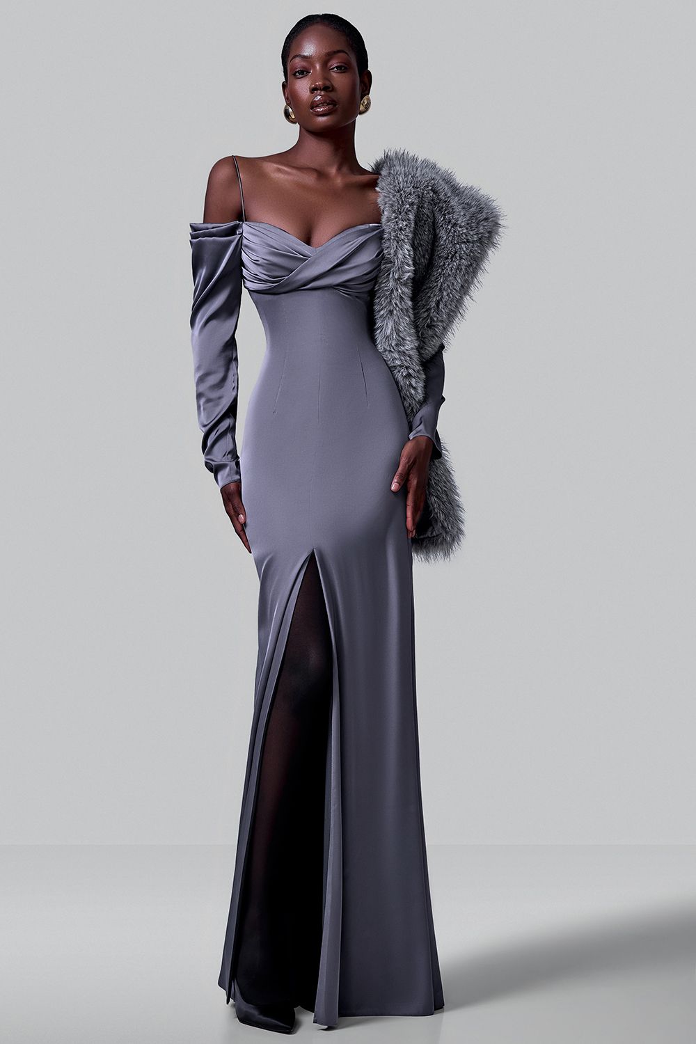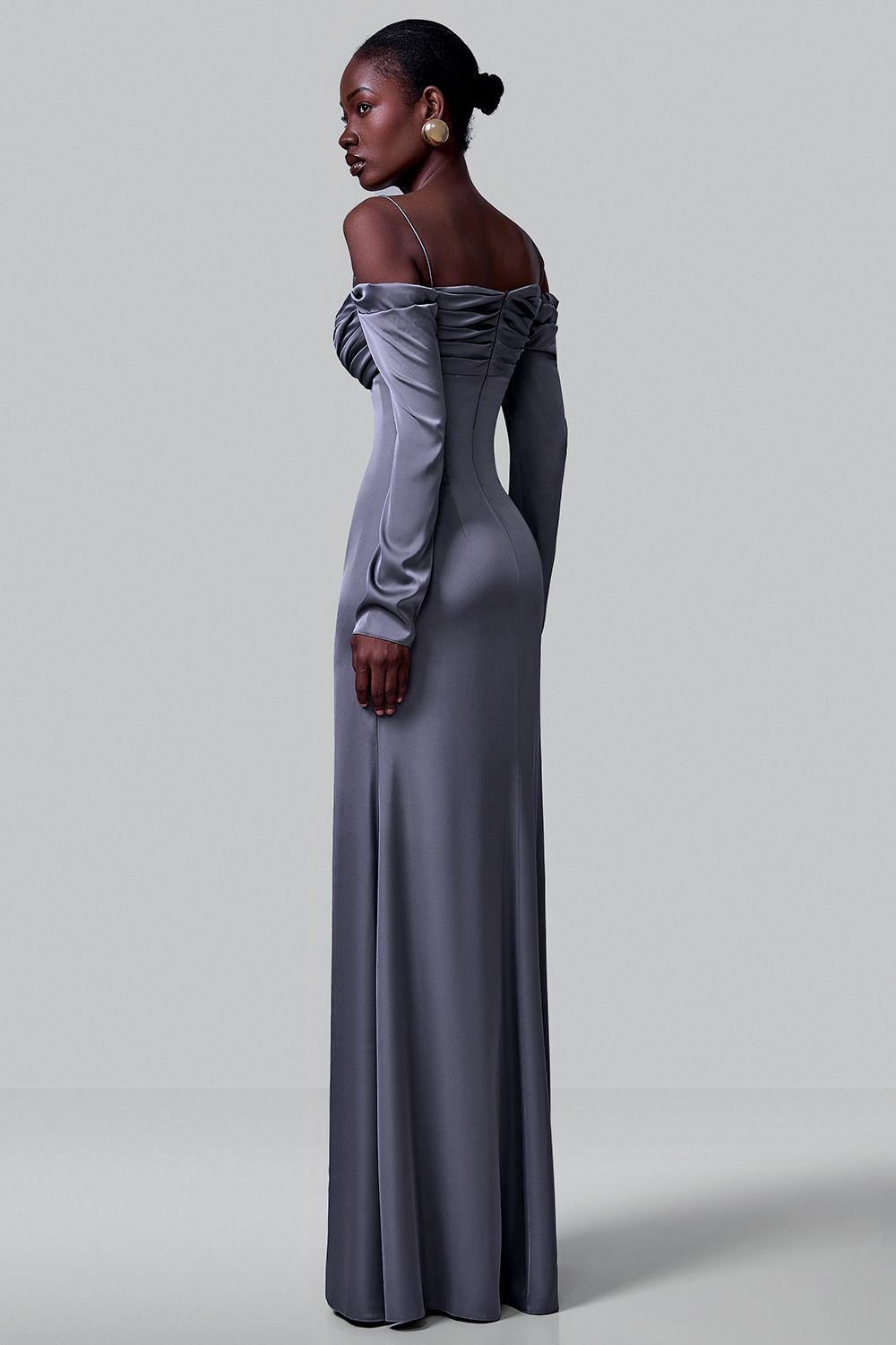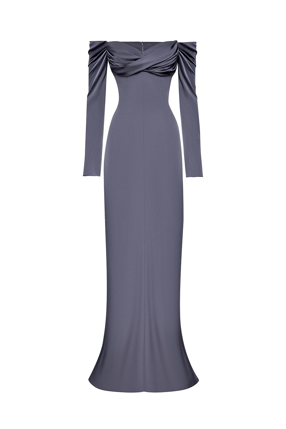 Элегантное платье в пол с открытыми плечами и длинными рукавами. Классический приталенный крой с акцентом на стройный силуэт и высоким разрезом спереди. Мягкая ткань с легким блеском изысканно драпируется и подчеркивает фигуру. Идеально сочетается с палантином из той же ткани, который продается отдельно (арт. 98128). Основная ткань: 97% полиэстер, 3% спандекс Подкладка: 97% полиэстер, 3% эластан