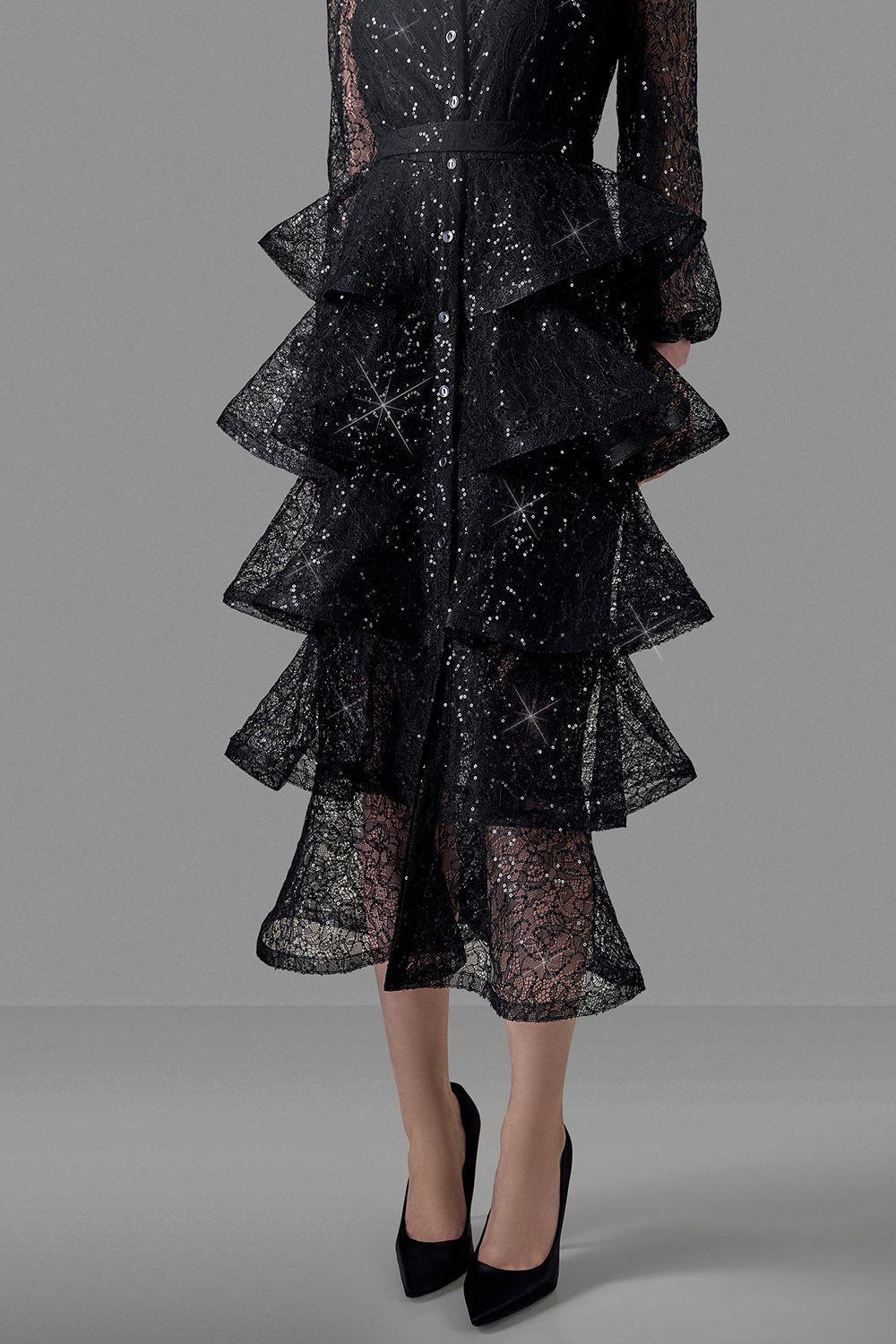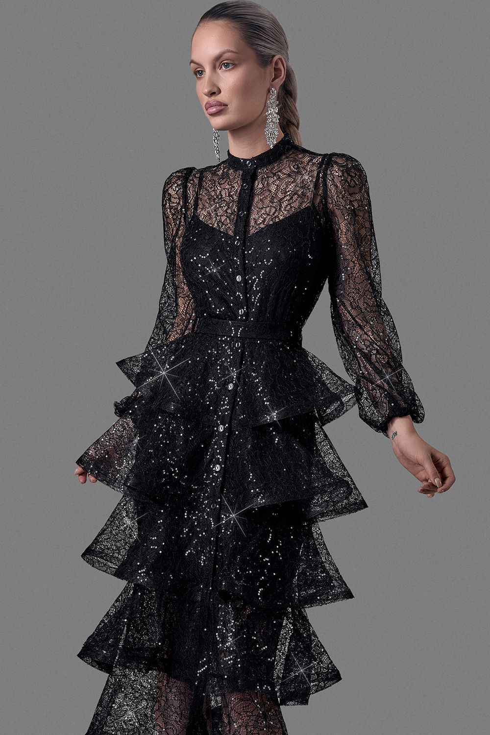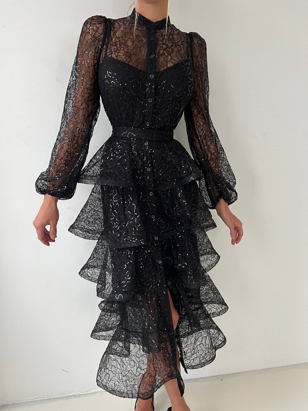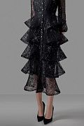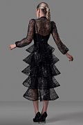 Элегантное платье, созданное для особых случаев. Выполнено из изящного кружева с легким блеском, которое эффектно отражает свет и подчеркивает глубину оттенка. Верхняя часть - полупрозрачная, с длинными воздушными рукавами и аккуратной застежкой на маленькие пуговицы, создающая утончённый и женственный силуэт. Длина изделия по спинке: 125 см. Длина рукава: 59 см. Состав: 100% нейлон