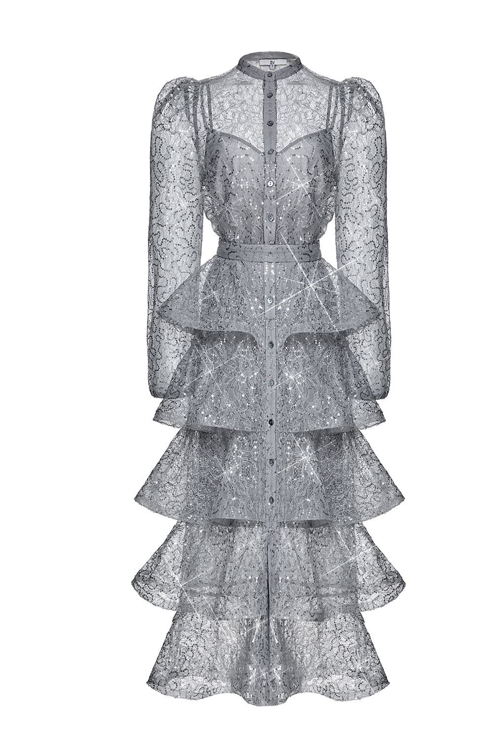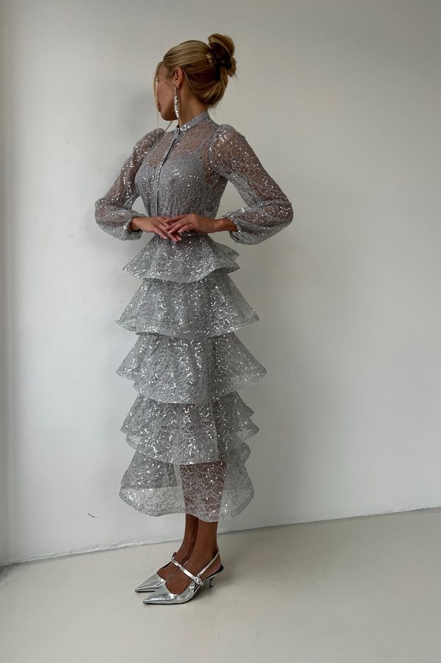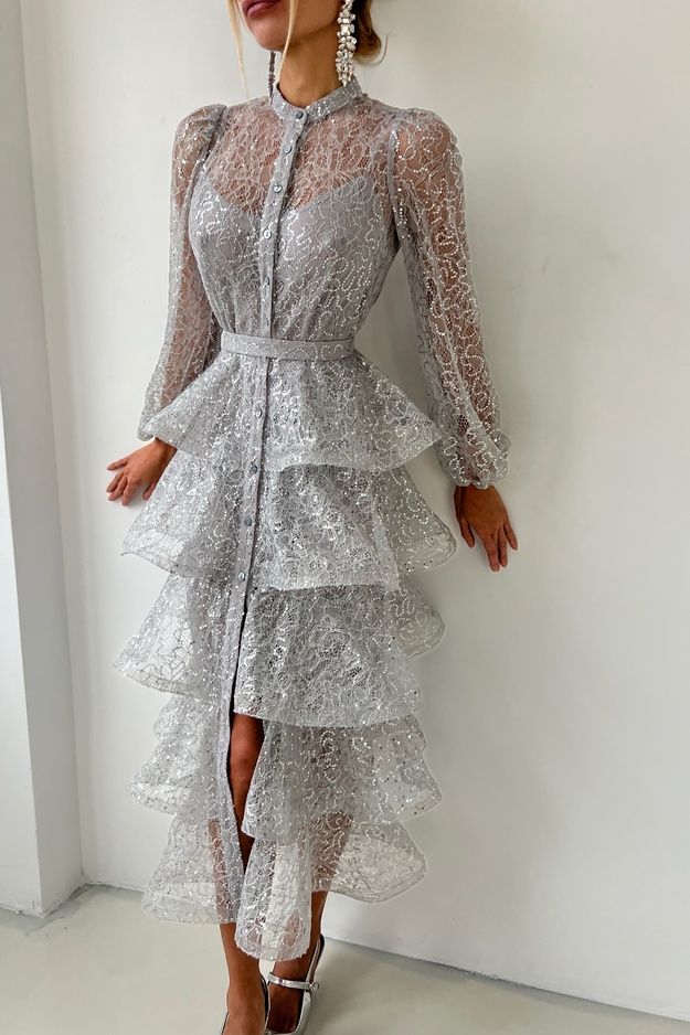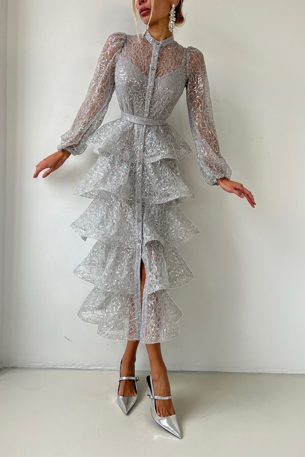 Элегантное платье, созданное для особых случаев. Выполнено из изящного кружева с легким блеском, которое эффектно отражает свет и подчеркивает глубину оттенка. Верхняя часть - полупрозрачная, с длинными воздушными рукавами и аккуратной застежкой на маленькие пуговицы, создающая утончённый и женственный силуэт. Длина изделия по спинке: 125 см. Длина рукава: 59 см. Состав: 100% нейлон