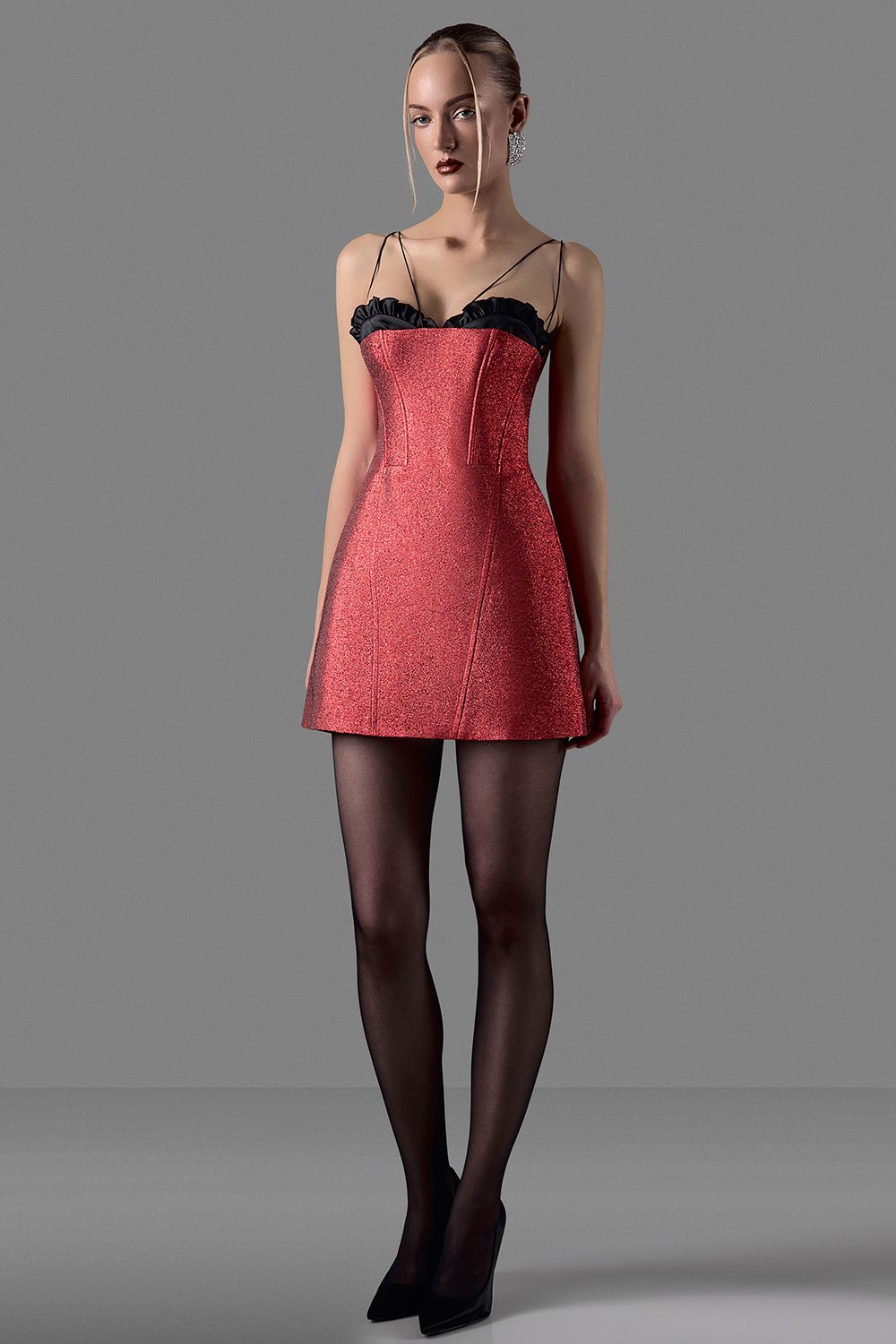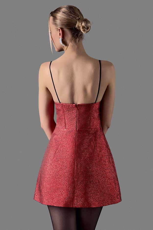 Мини-платье с приталенным силуэтом, подчёркивающим фигуру. Линия талии выделена, юбка слегка расклешена, создавая форму песочных часов. Платье яркого оттенка с блестящей текстурой, создающей эффект мерцания. Платье выглядит так, будто усыпано мельчайшими искрами. Обращаем ваше внимание на то, что незначительное осыпание глиттера является неизбежной особенностью данного вида декора. Состав: 90% полиэстер, 10% люрекс, Подкладка 95% полиэстер, 5% эластан