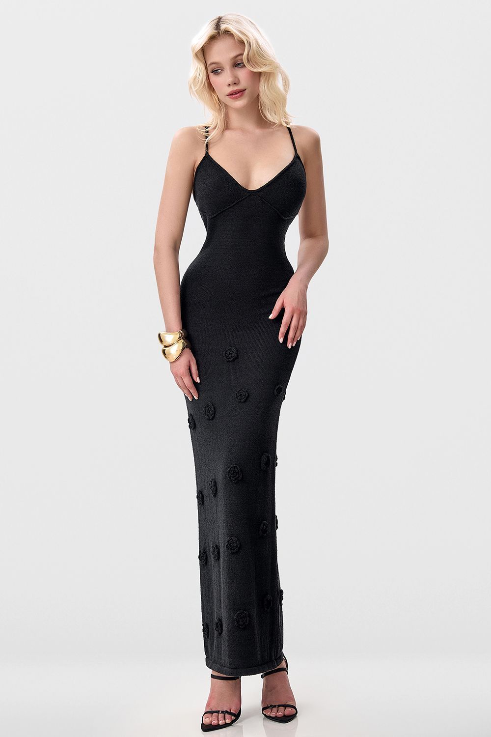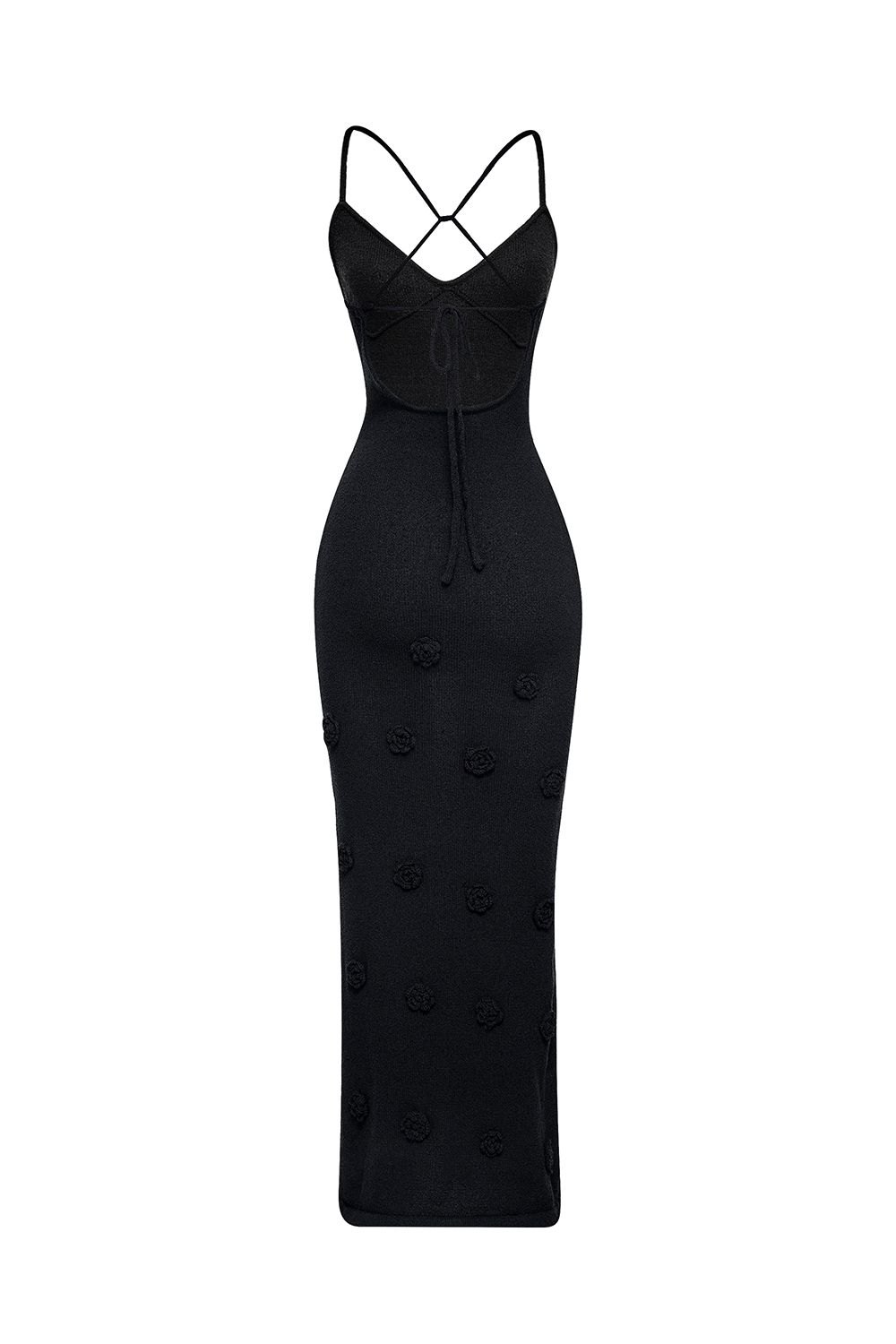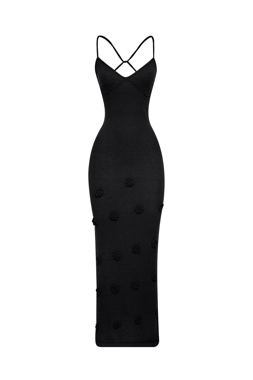Облегающее платье средней длины (миди), плавно повторяющее линии фигуры. Лиф на тонких бретелях с глубоким вырезом в форме сердечка, подчеркивающий изящество плеч и ключиц. По всей длине платья размещены объемные декоративные элементы в виде цветочных аппликаций. Длина по боковому шву 126 см. Состав: 100% полиэстер