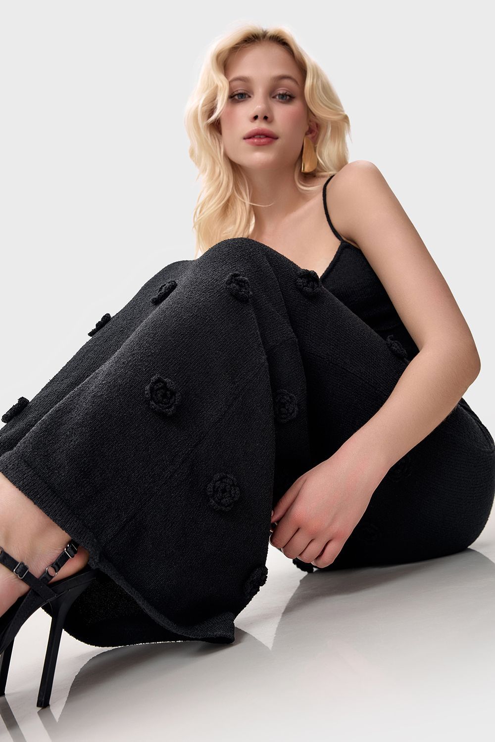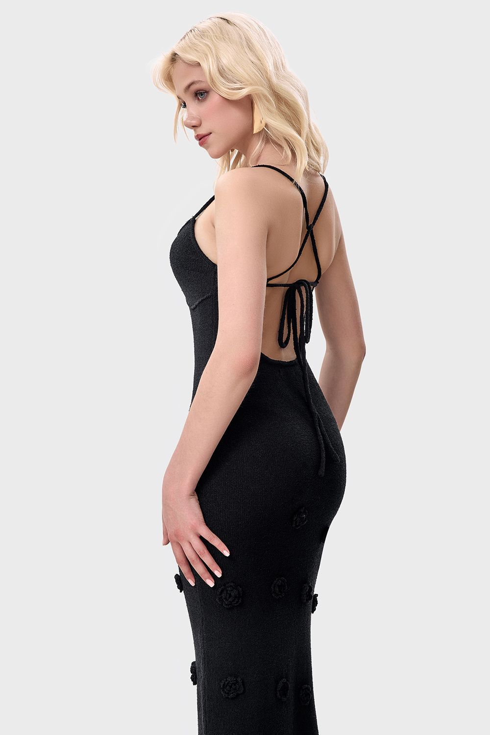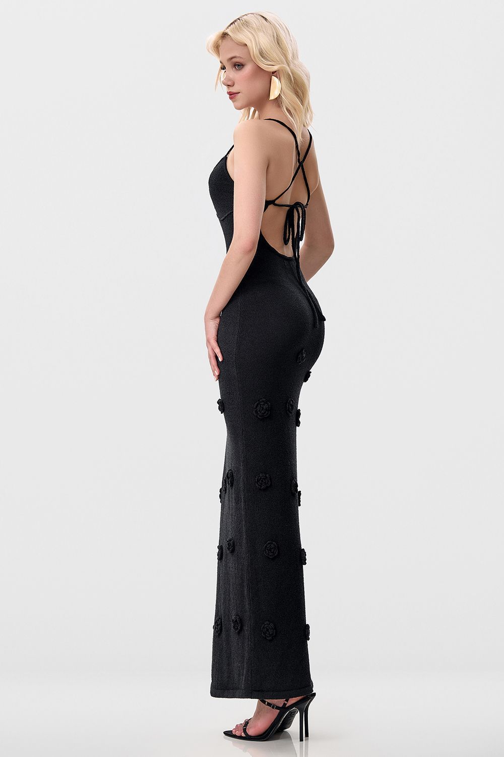 Облегающее платье средней длины (миди), плавно повторяющее линии фигуры. Лиф на тонких бретелях с глубоким вырезом в форме сердечка, подчеркивающий изящество плеч и ключиц. По всей длине платья размещены объемные декоративные элементы в виде цветочных аппликаций. Длина по боковому шву 126 см. Состав: 100% полиэстер