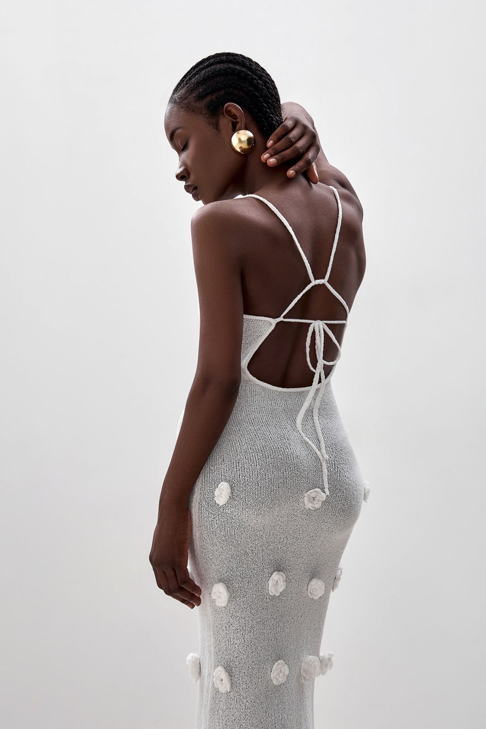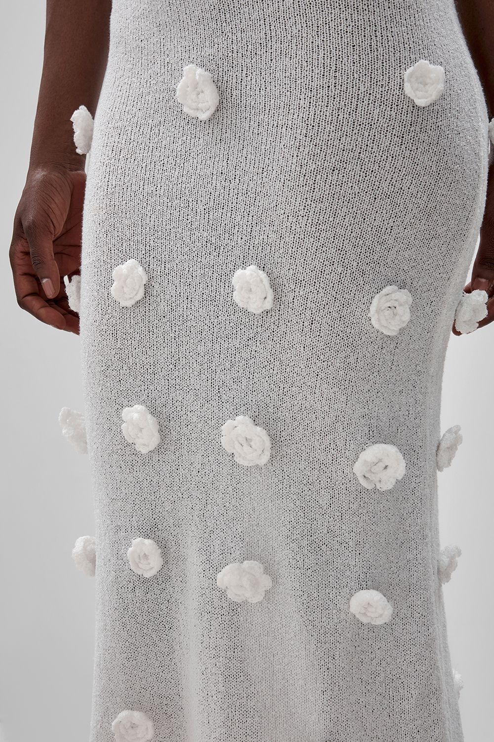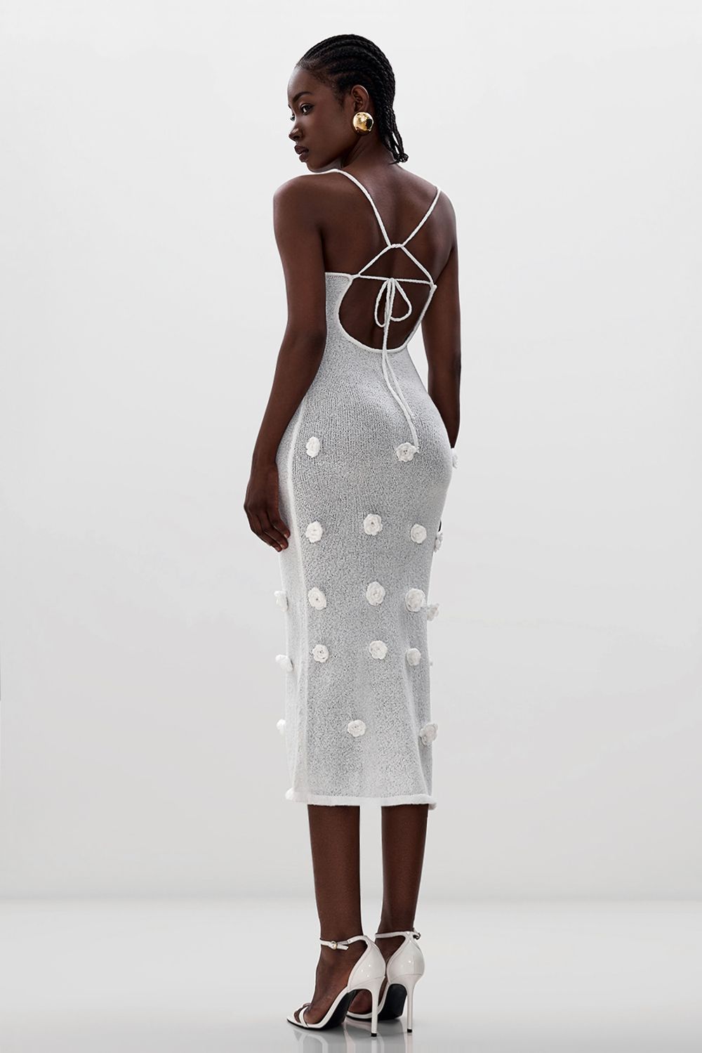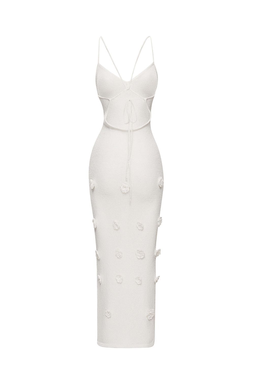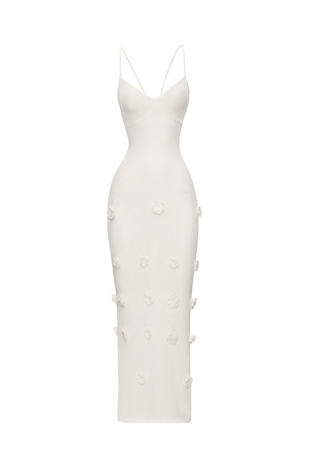 Облегающее платье средней длины (миди), плавно повторяющее линии фигуры. Лиф на тонких бретелях с глубоким вырезом в форме сердечка, подчеркивающий изящество плеч и ключиц. По всей длине платья размещены объемные декоративные элементы в виде цветочных аппликаций. Длина по боковому шву 126 см. Состав: 100% полиэстер