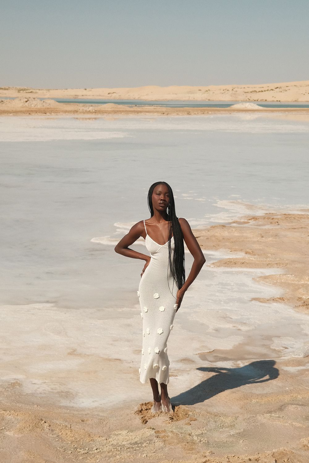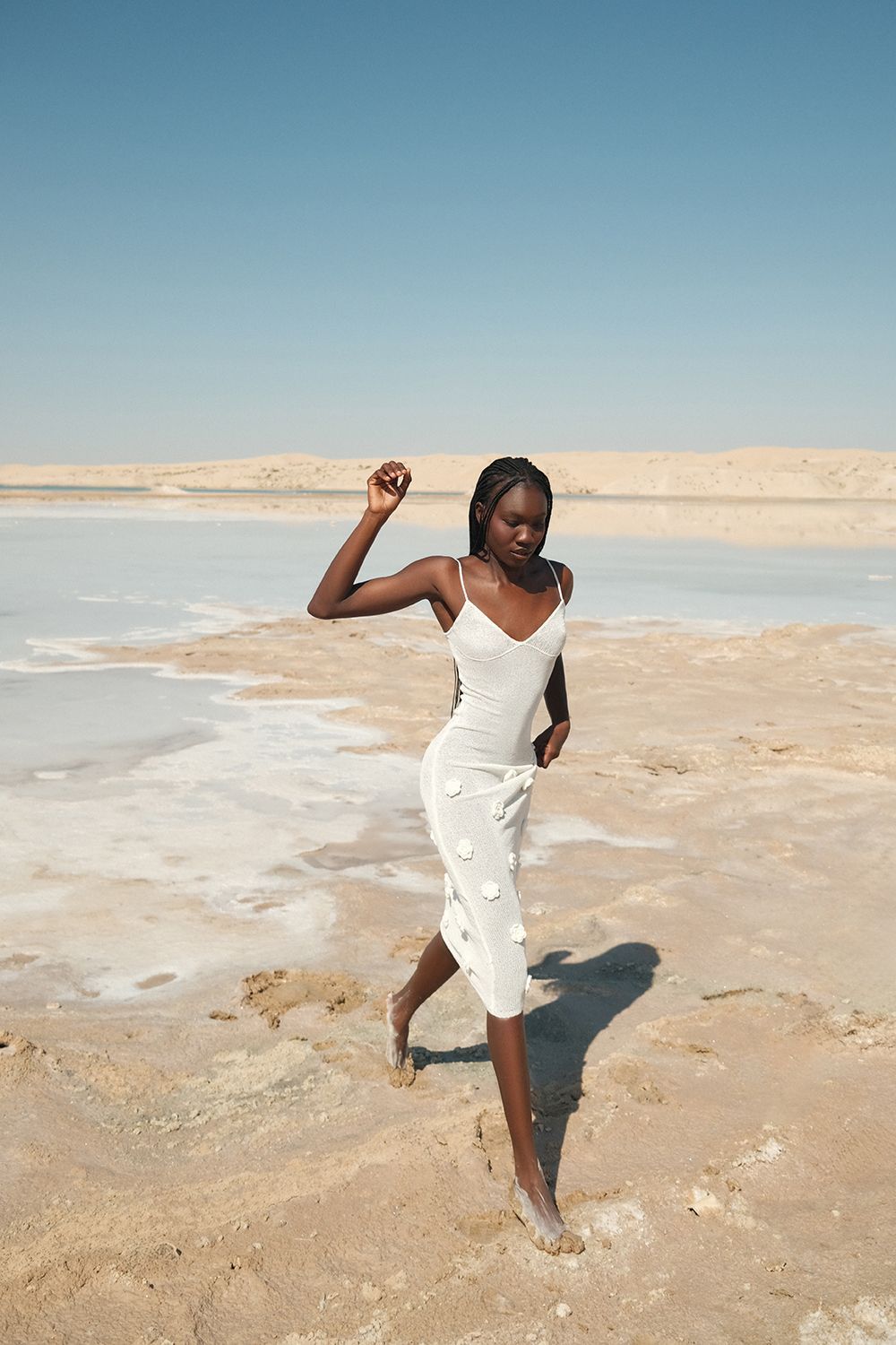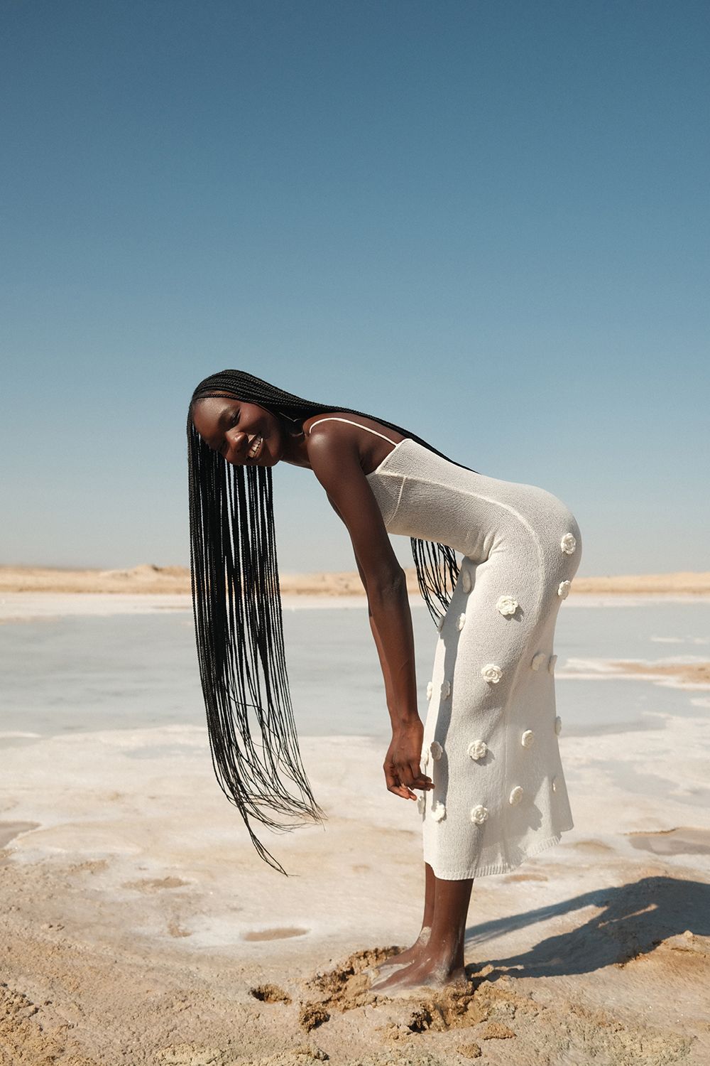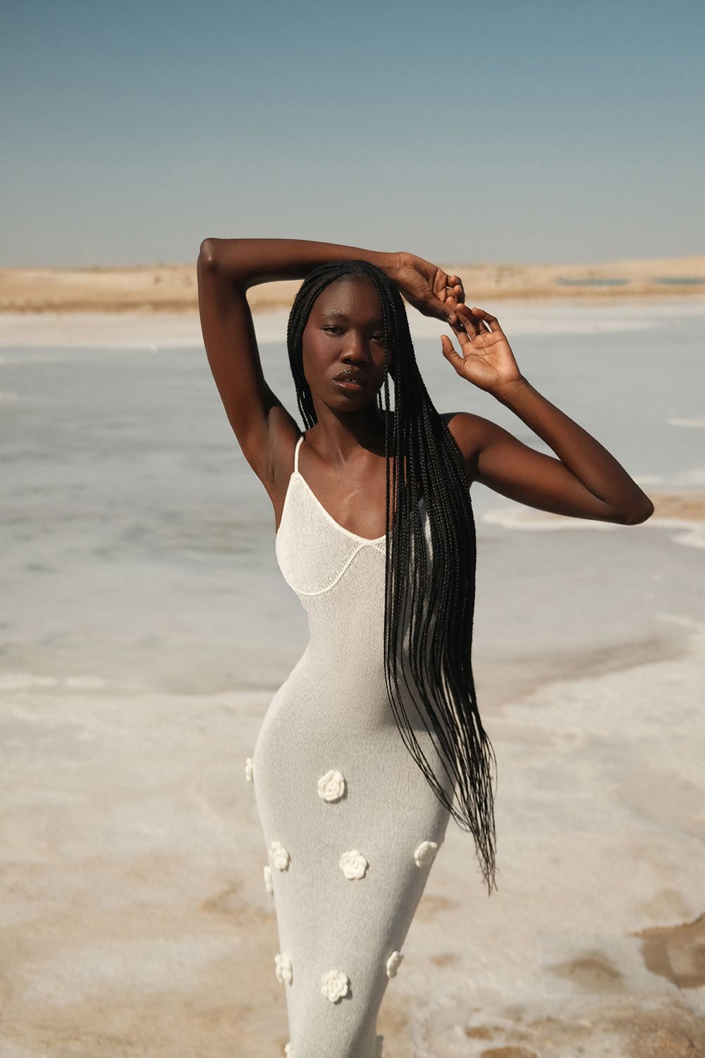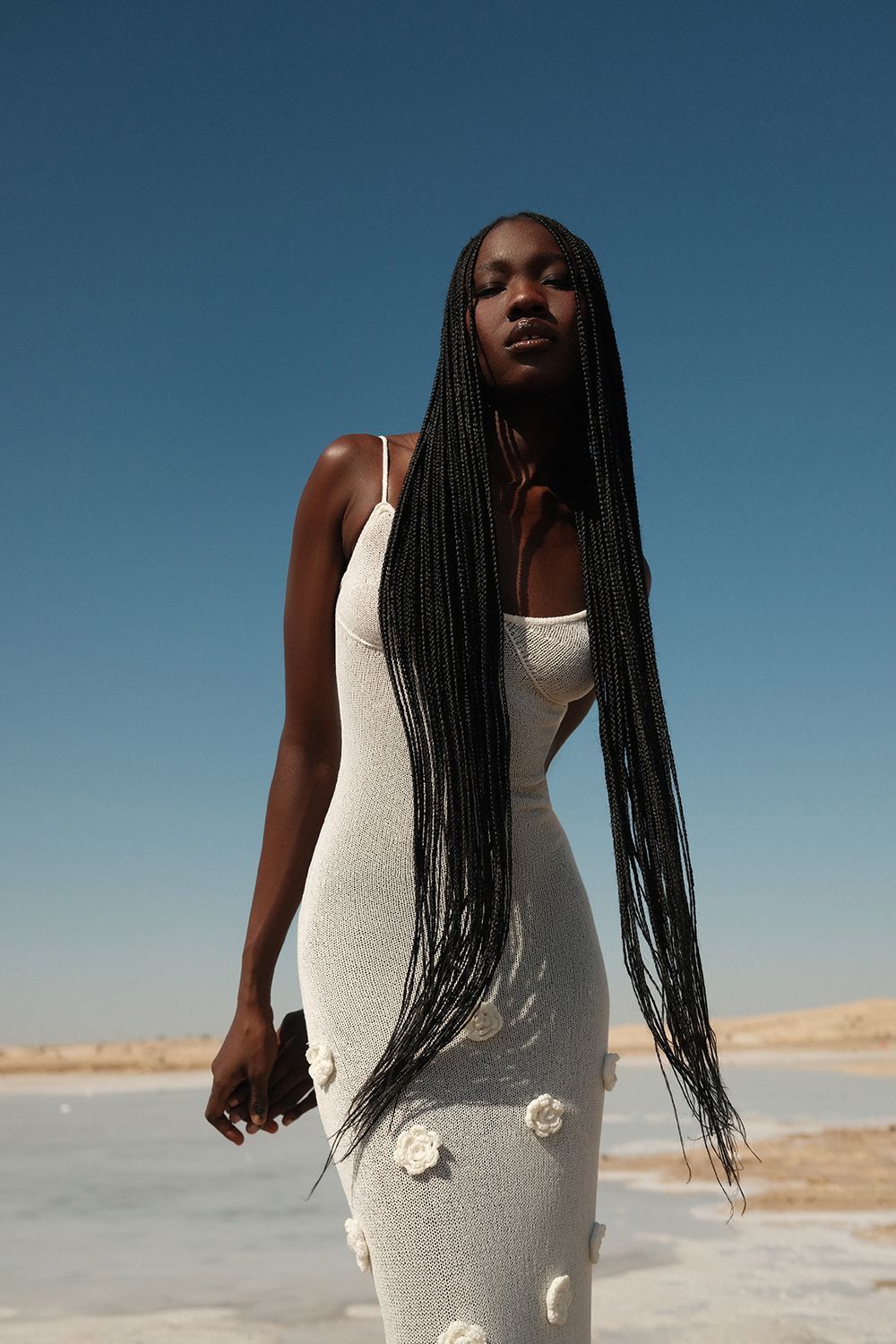 Облегающее платье средней длины (миди), плавно повторяющее линии фигуры. Лиф на тонких бретелях с глубоким вырезом в форме сердечка, подчеркивающий изящество плеч и ключиц. По всей длине платья размещены объемные декоративные элементы в виде цветочных аппликаций. Длина по боковому шву 126 см. Состав: 100% полиэстер