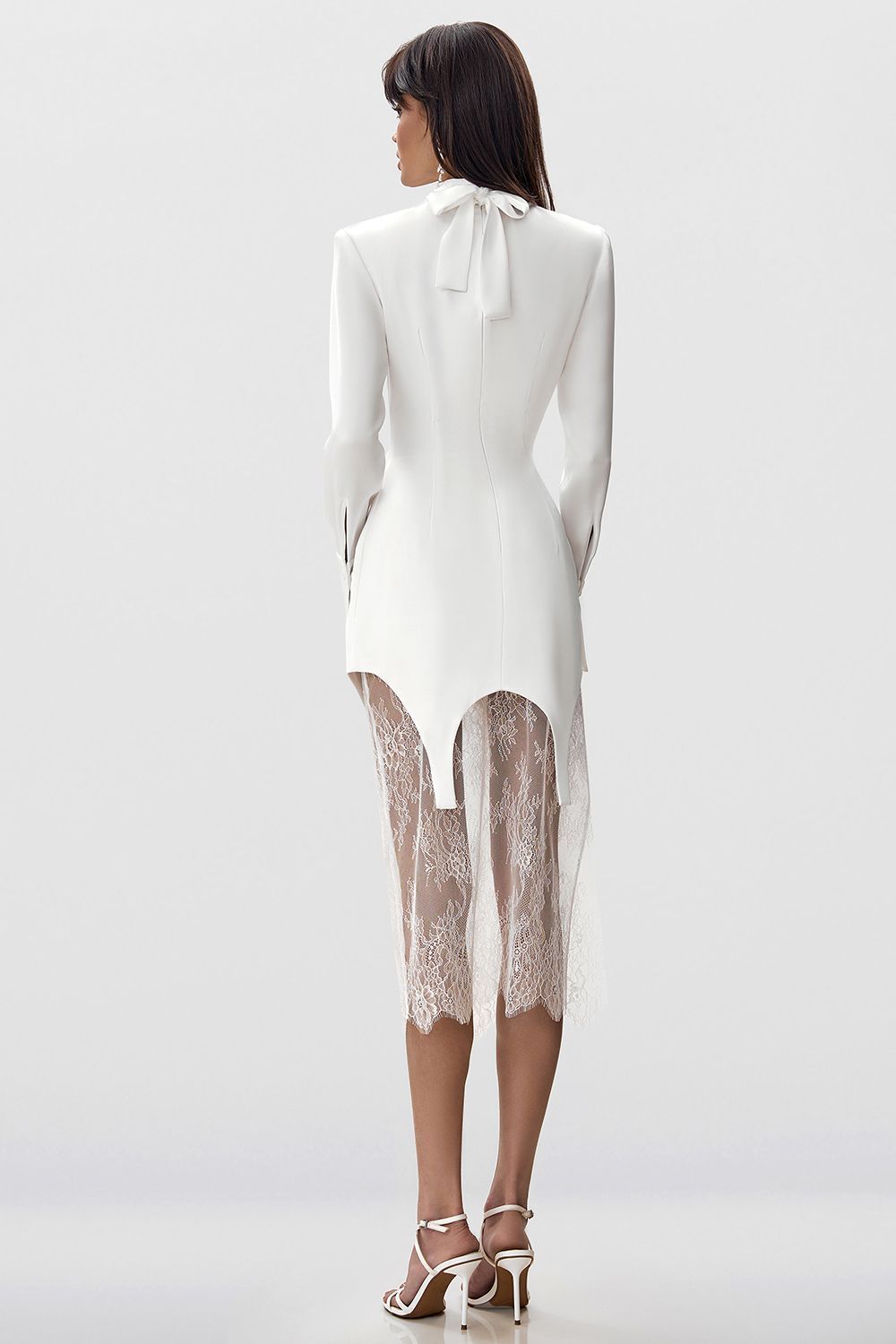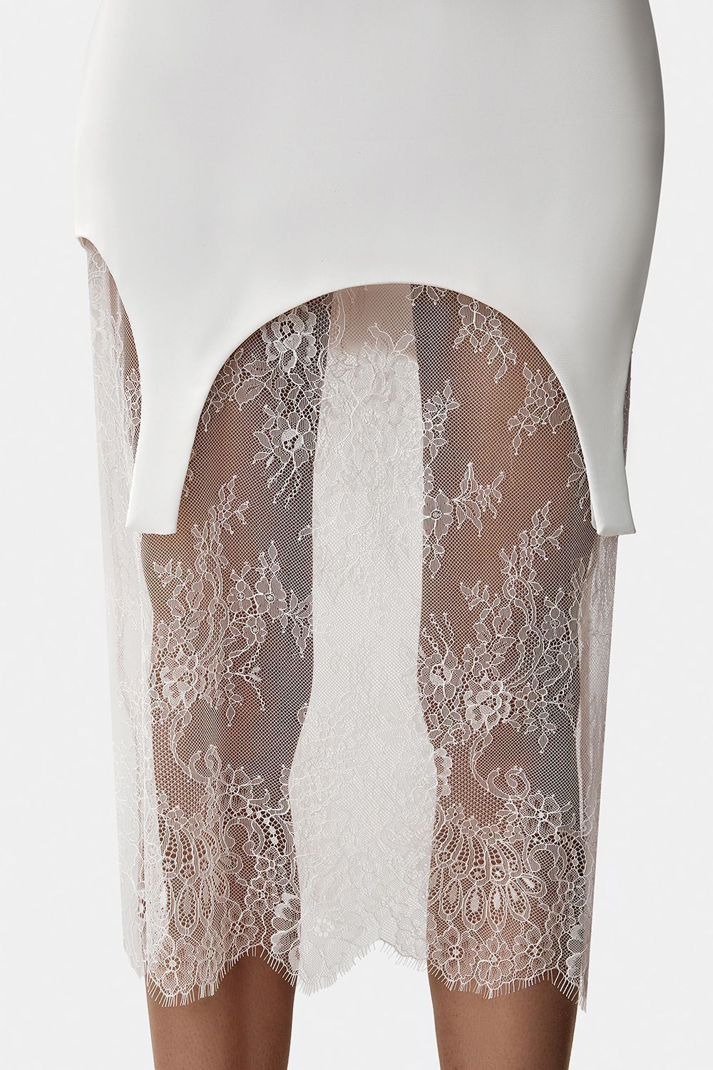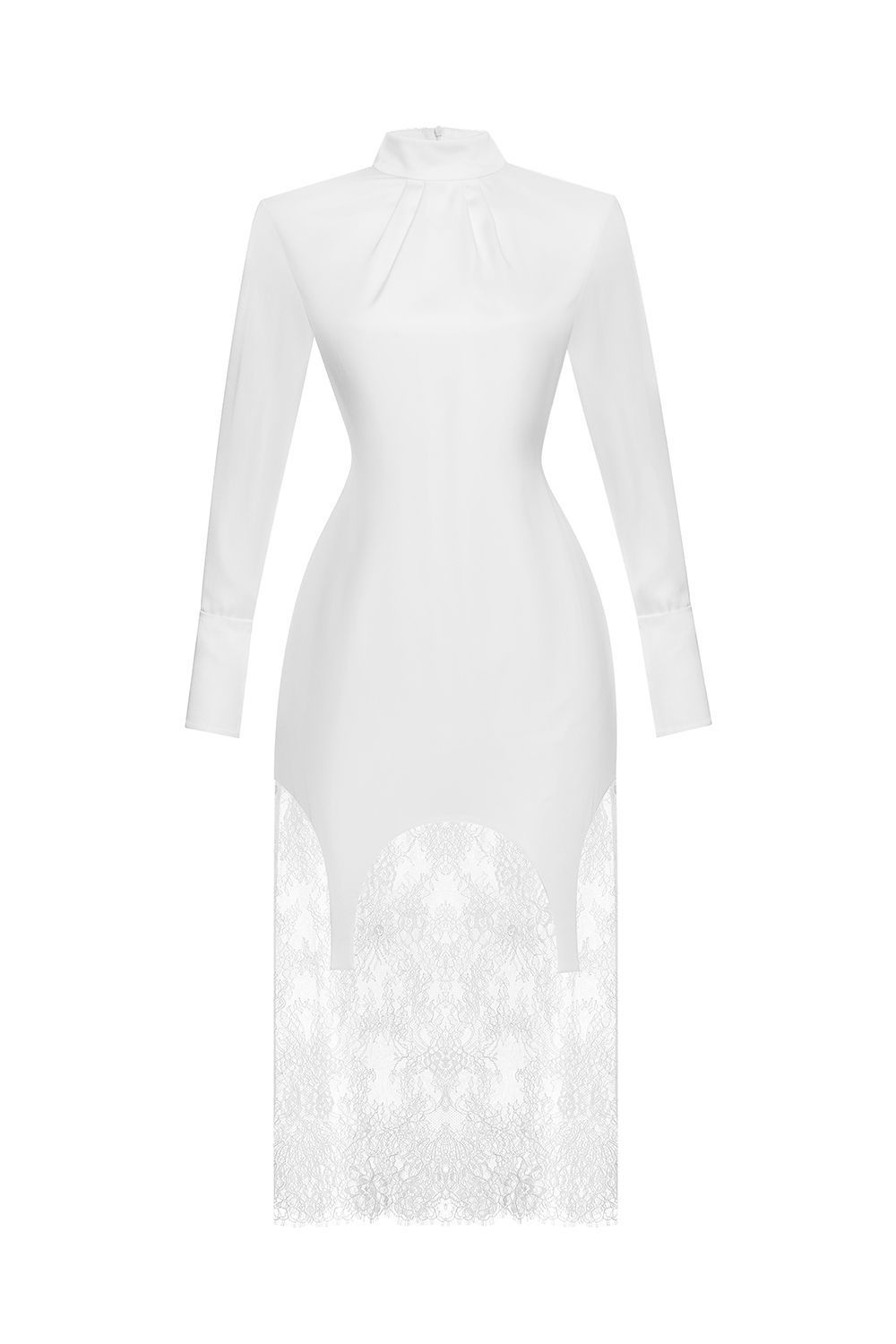 Элегантное платье-миди, идеально подходящее для особых случаев.Платье имеет стильный крой с высоким воротником-стойкой. Особую изюминку платью придает асимметричный подол. Верхняя часть платья облегает фигуру, подчеркивая её достоинства, а нижняя часть, выполненная из нежного кружева. Состав: 100% нейлон